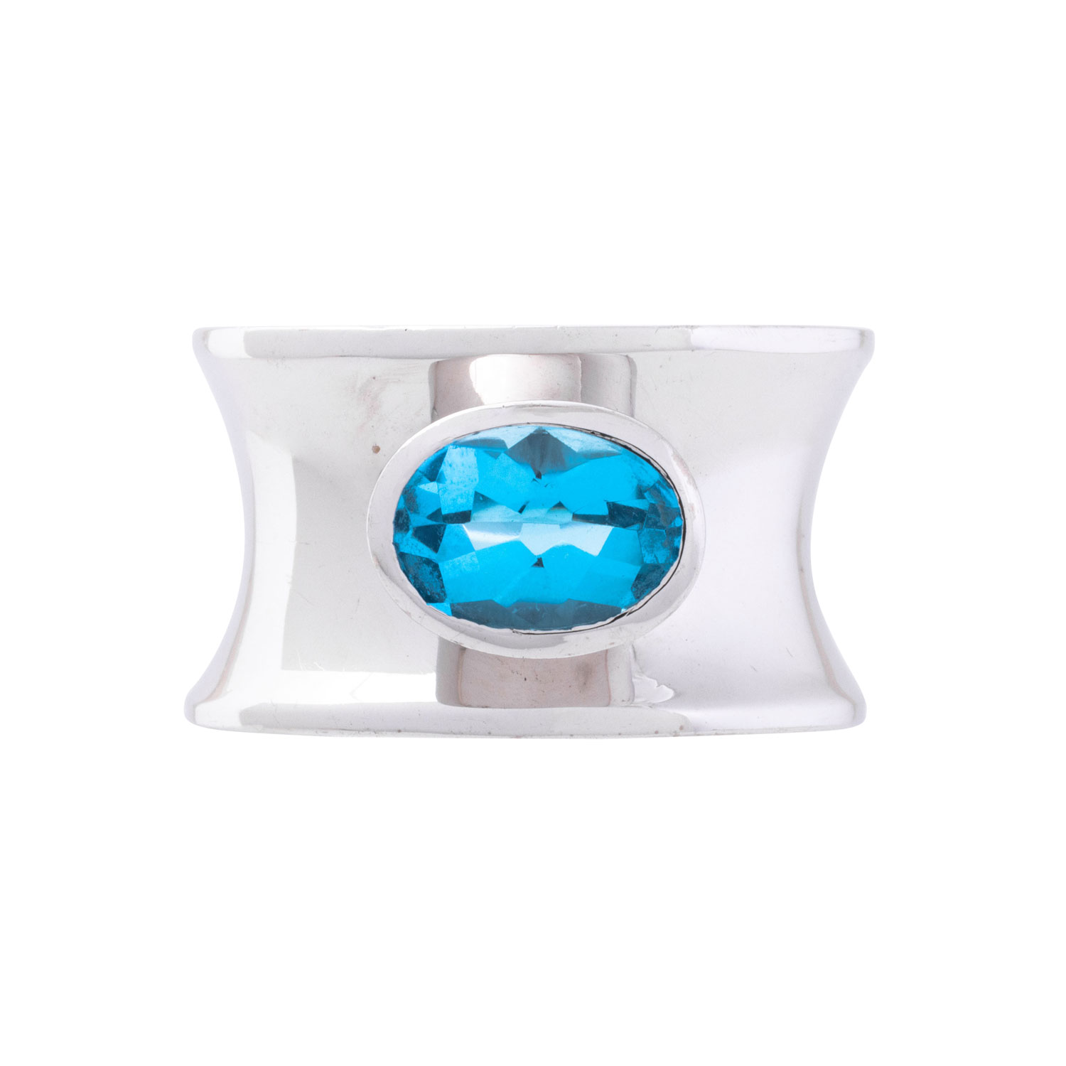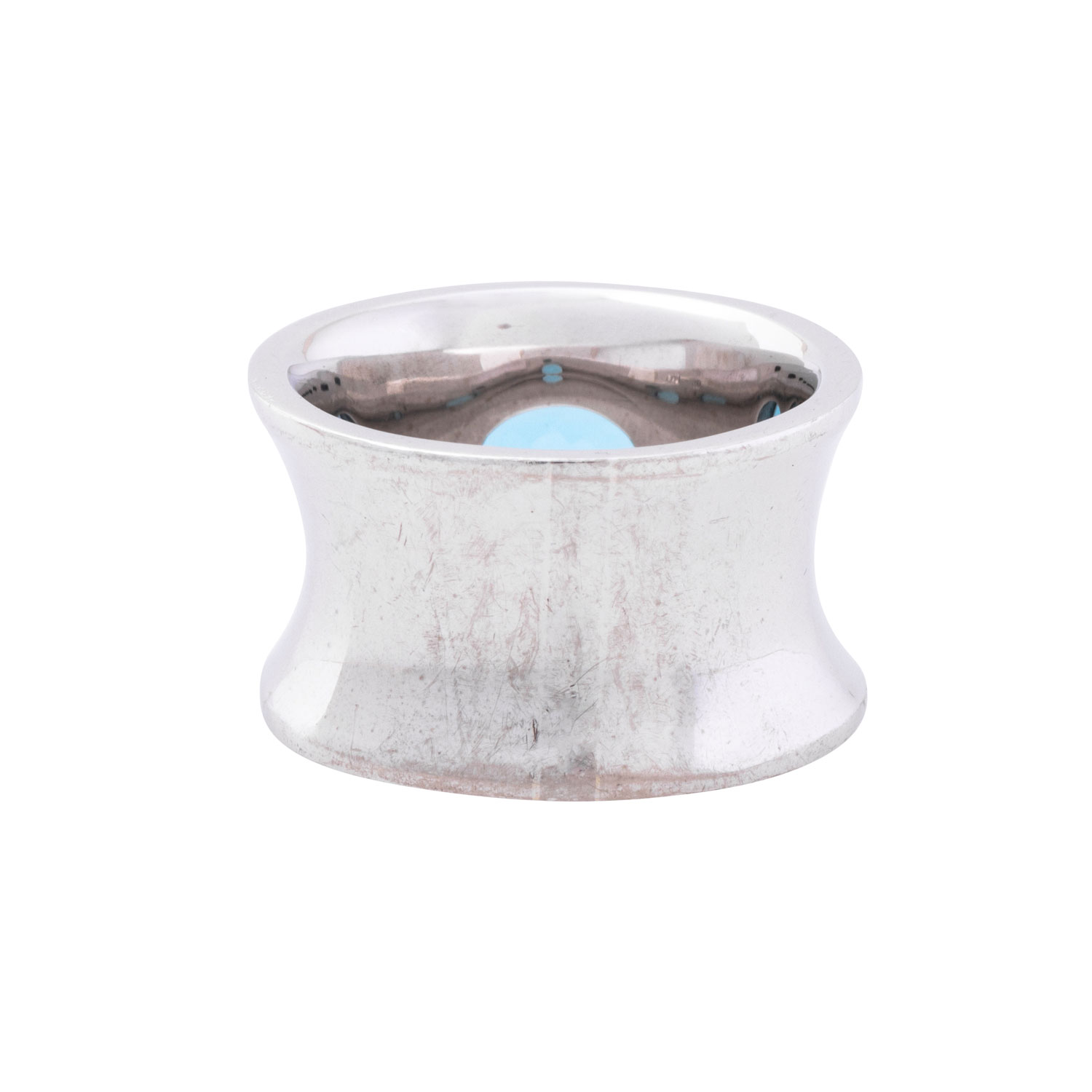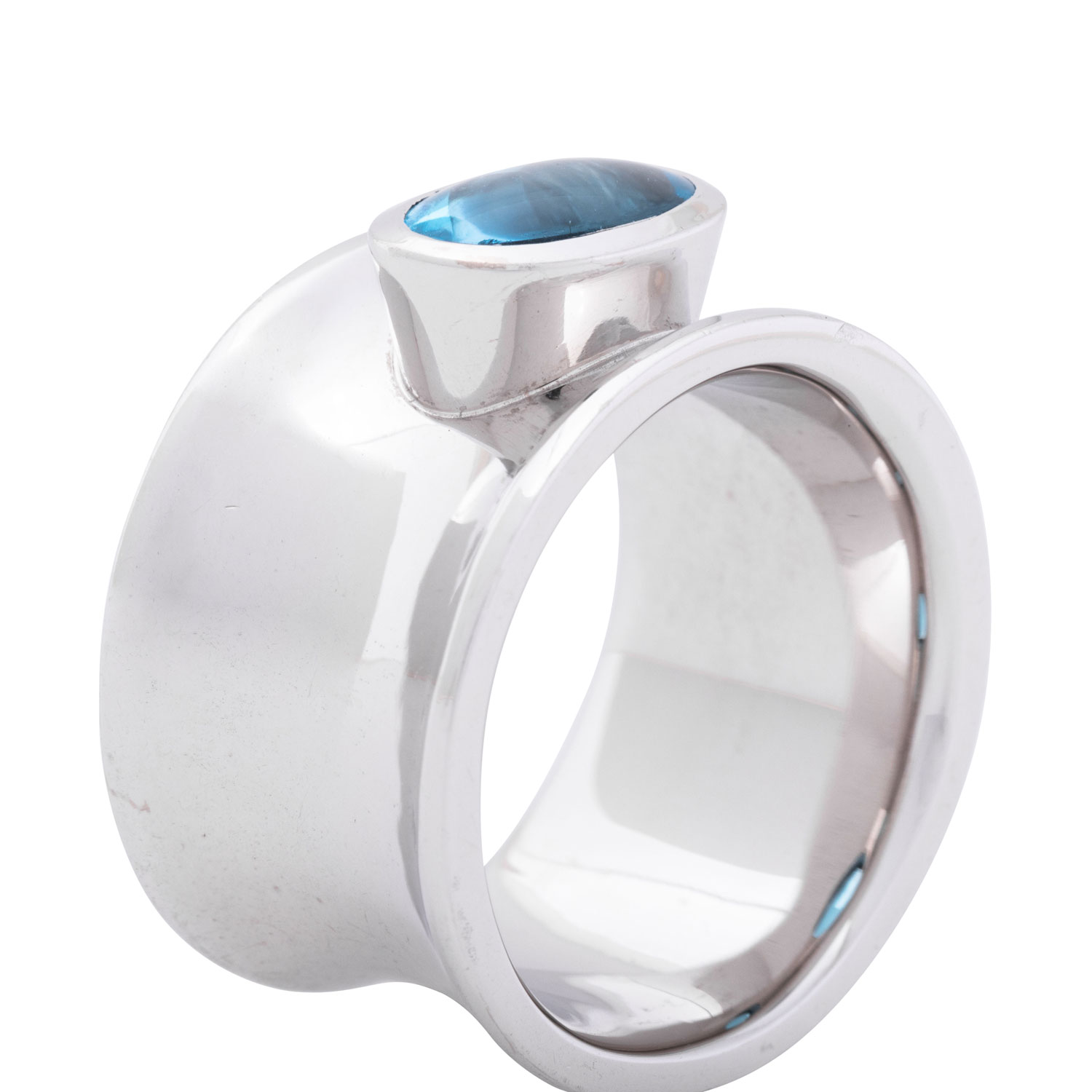 Ring with blue topaz, ca. 1.8 ct, ring band concave shape, WG 18K, 16.9 g, ring size 56.5, 21st century, good condition. Handcrafted.