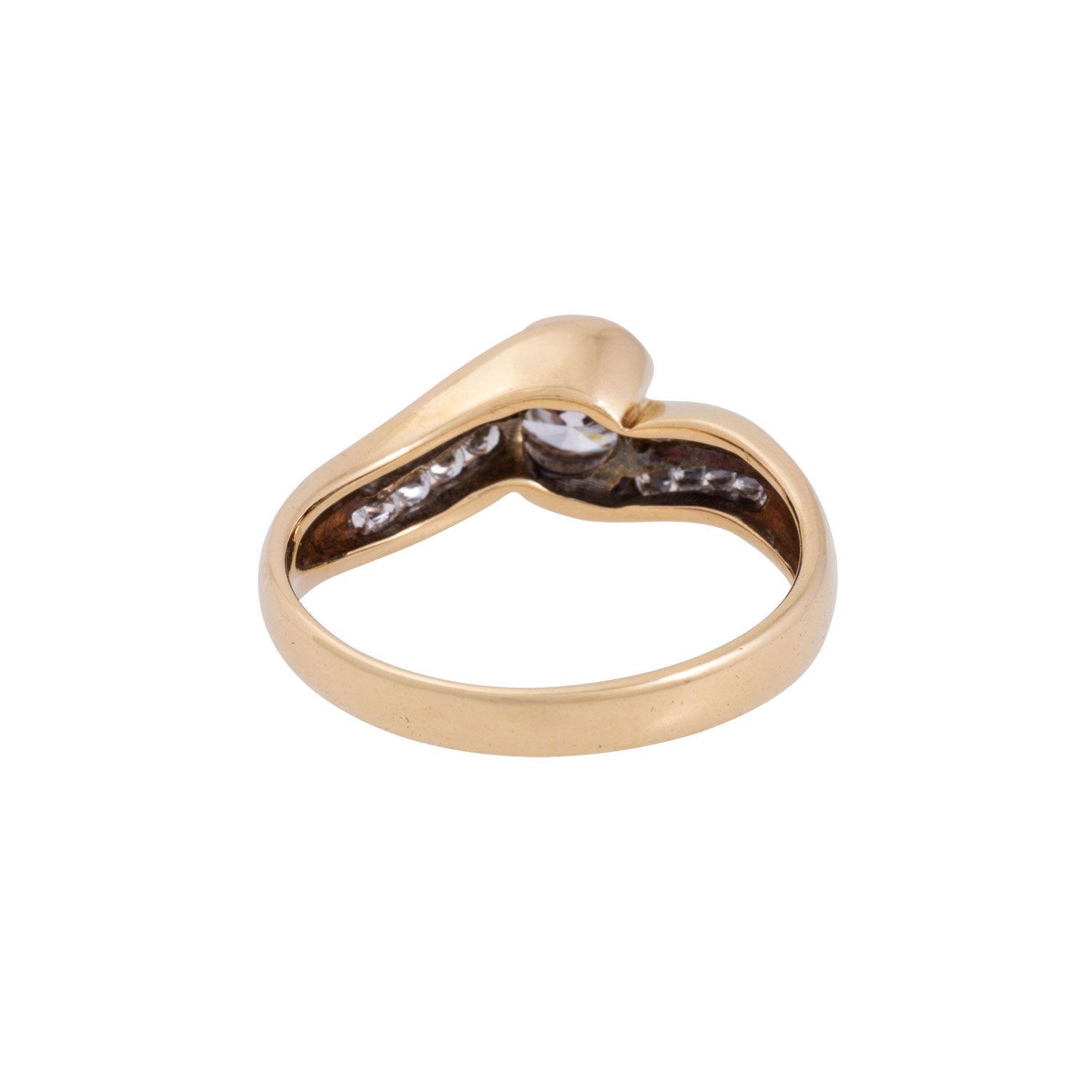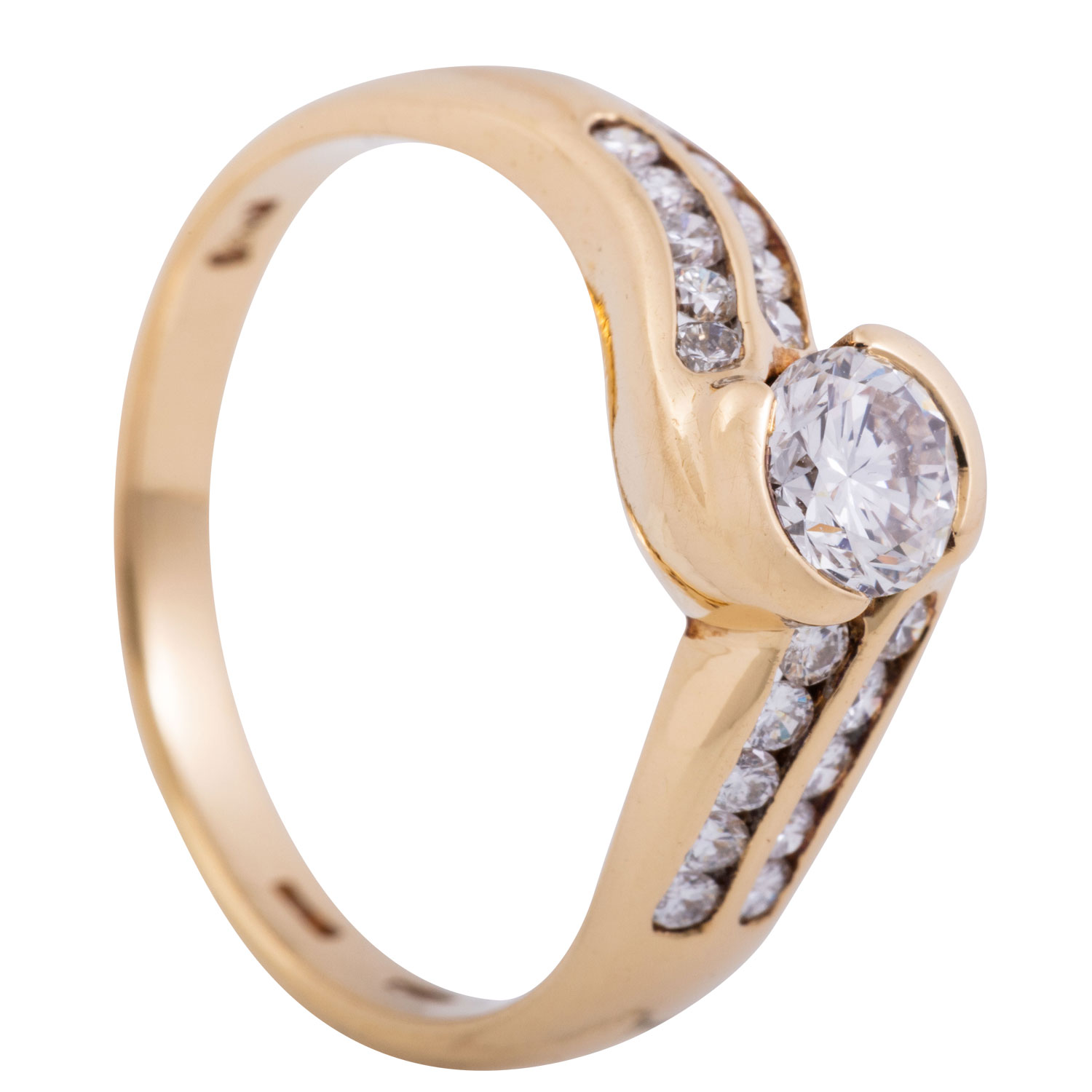 Ring with brilliant-cut diamond ca. 0.52 ct WHITE (H)/VVS and 20 brilliant-cut diamonds totalling ca. 0.36 ct, WHITE (H)/P1, YG 18K, 4.2 g, ring size 55, 20th/21st century, good condition. Handcrafted.