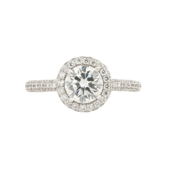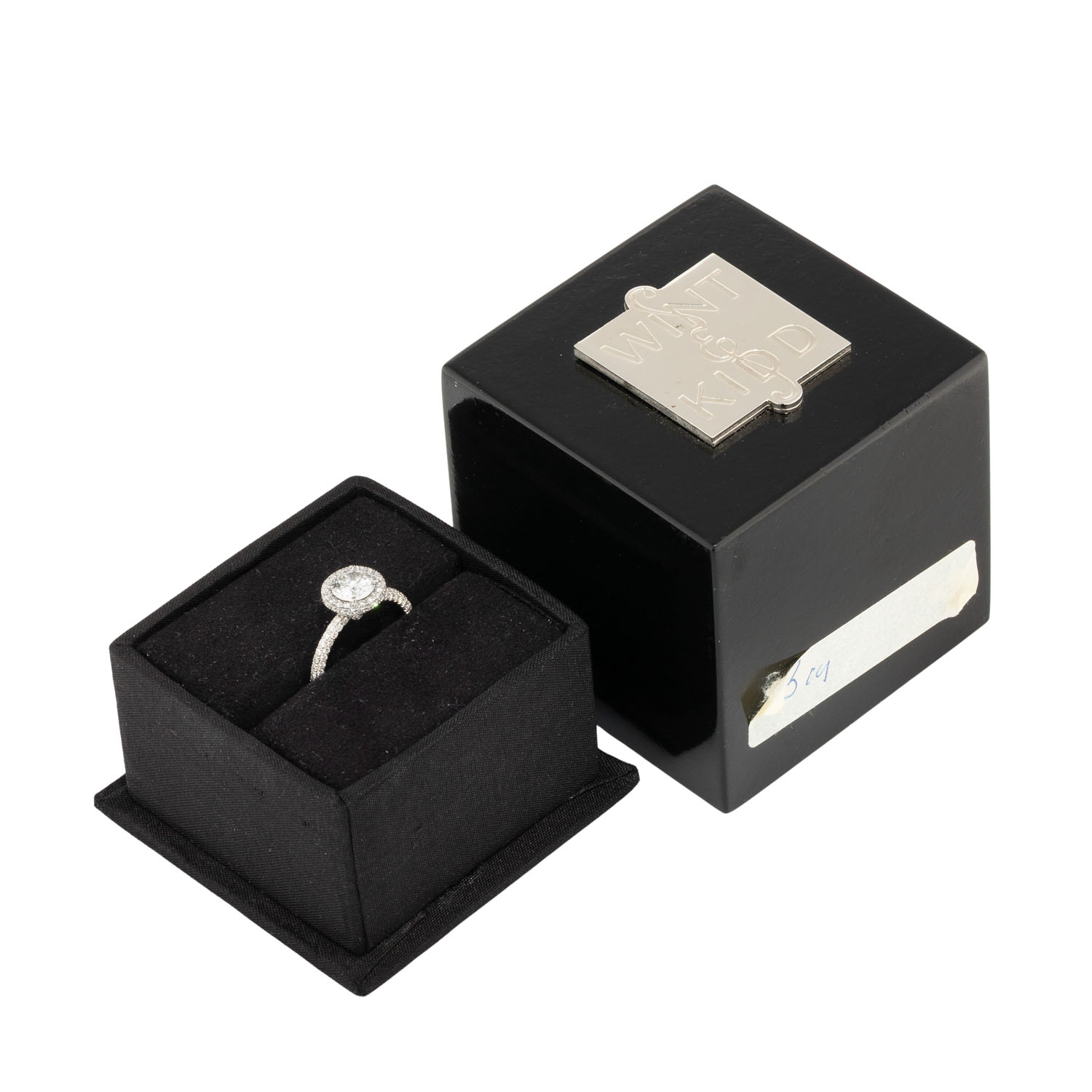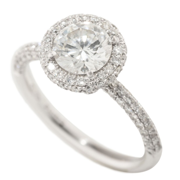 Ring with brilliant-cut diamond ca. 1 ct, ca. EW-RW (E-F)/VVS-VS and further brilliant-cut diamonds totalling ca. 1.1 ct, very good colour and clarity, 18K white gold, 4 g, ring size 53, 21st century, signs of wear, marked 'W&K' (Wint & Kidd) and official marks UK, in original case.