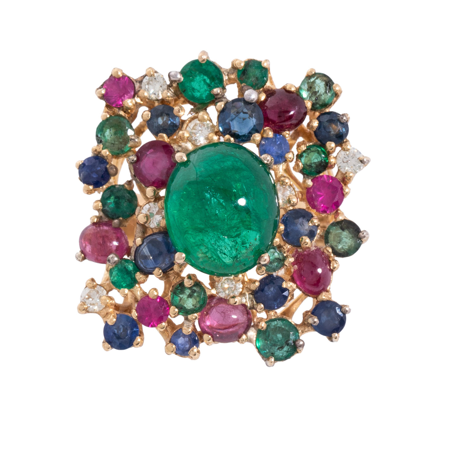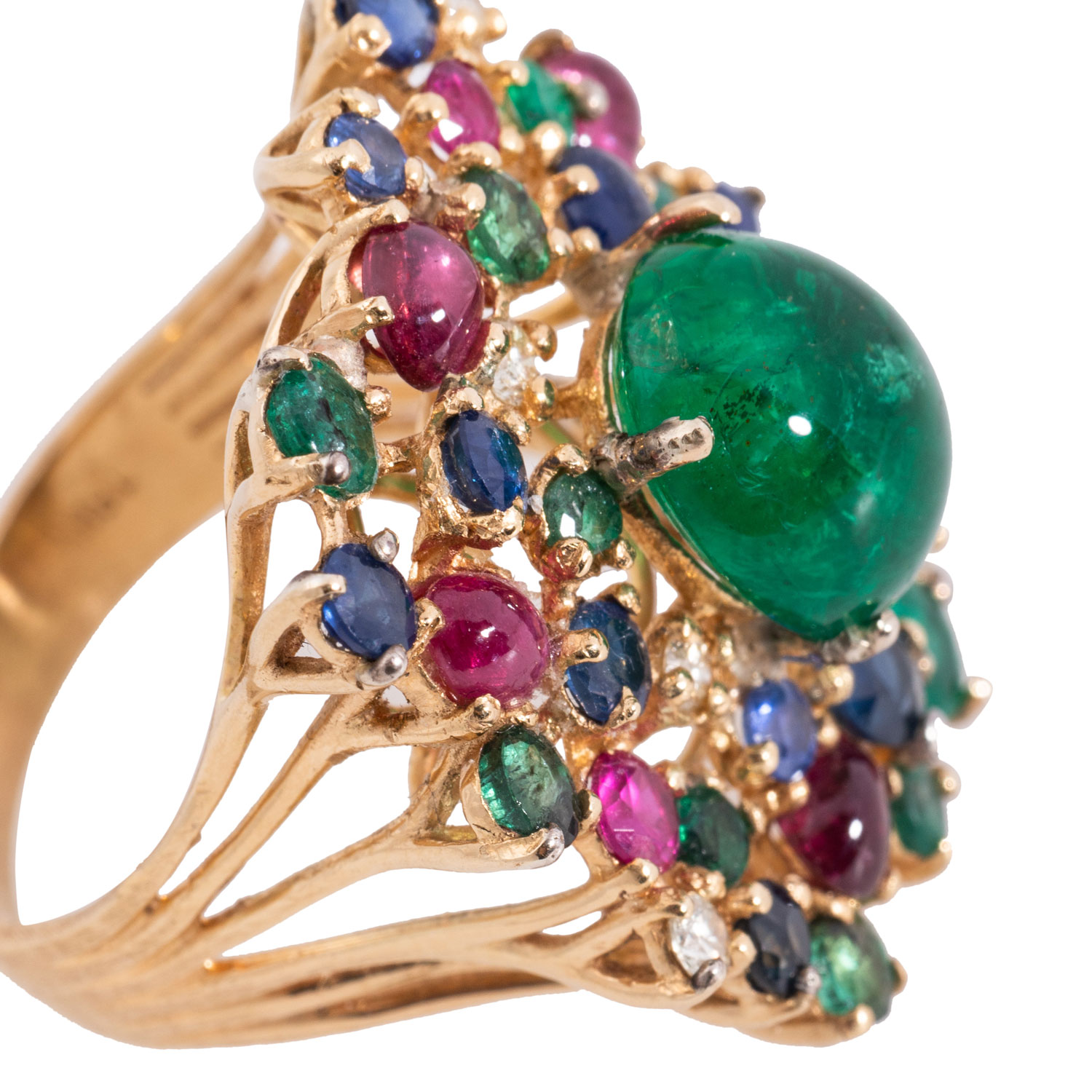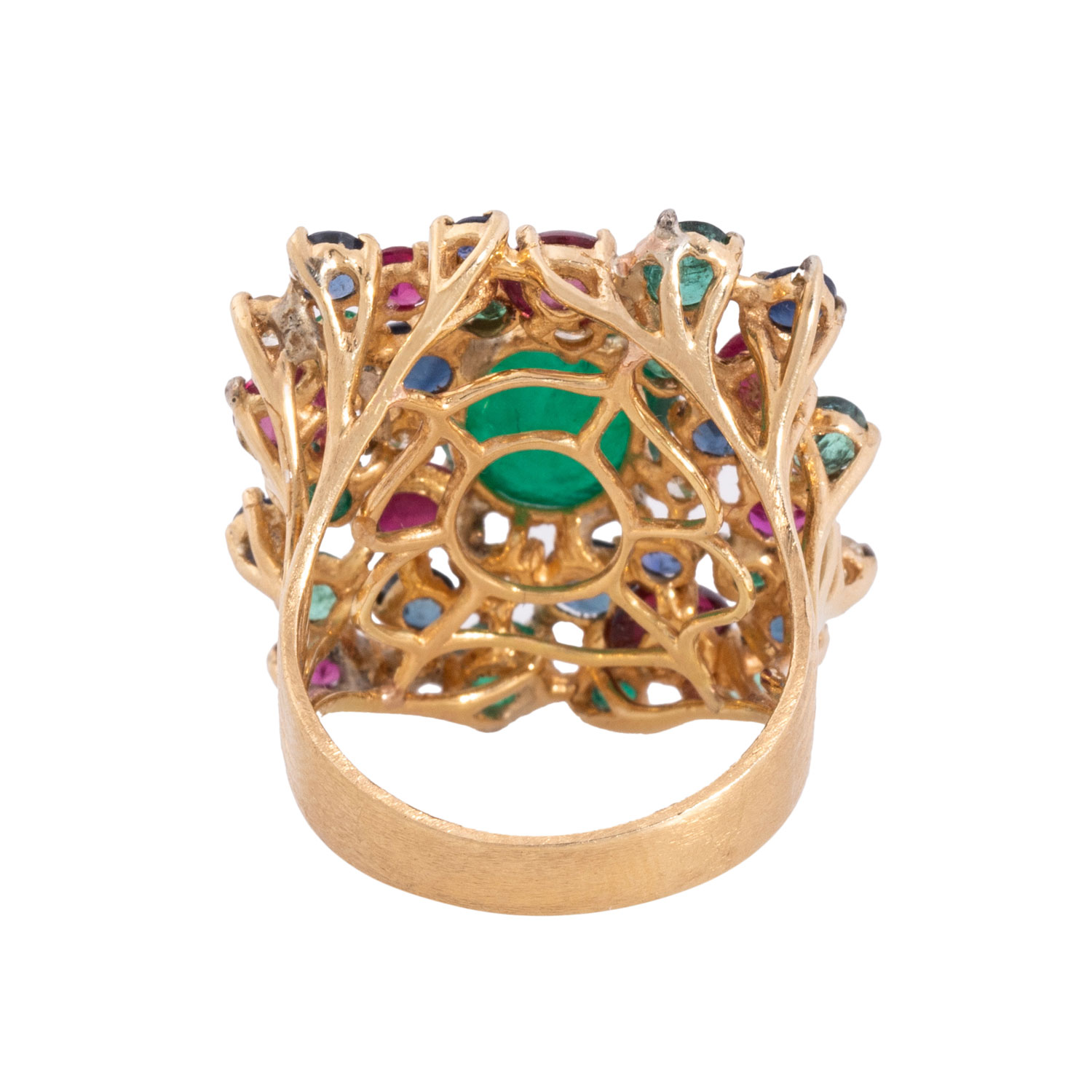 Ring with cabochon-cut emerald, 10.7 x 9.2 mm, further emeralds, rubies, sapphires and brilliant-cut diamonds totalling ca. 0.3 ct, WHITE-STW (H-J)/SI, YG 18K, 10.2 g, ring size 54, 21st century, good condition.