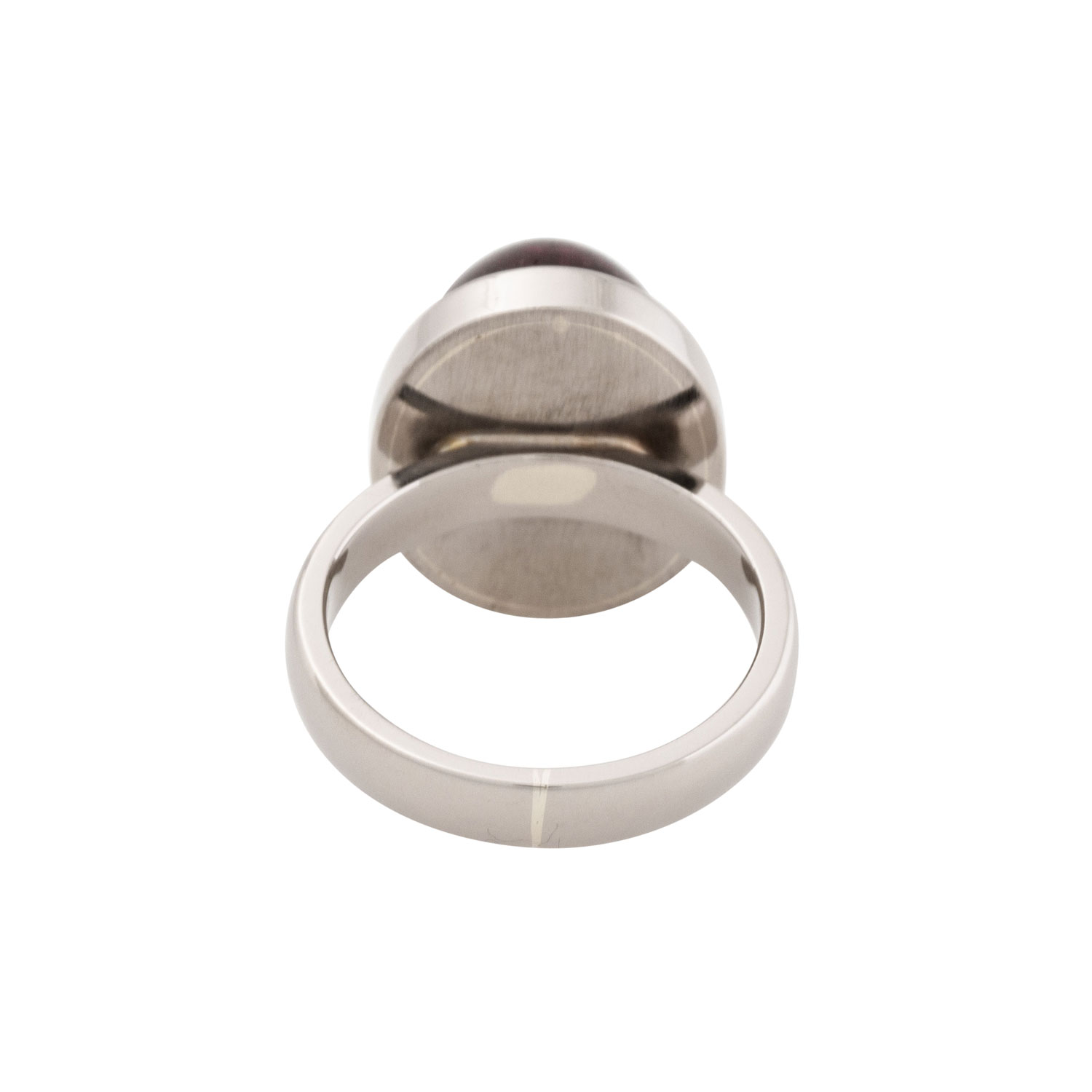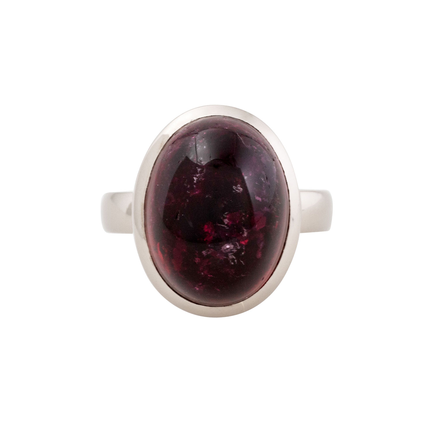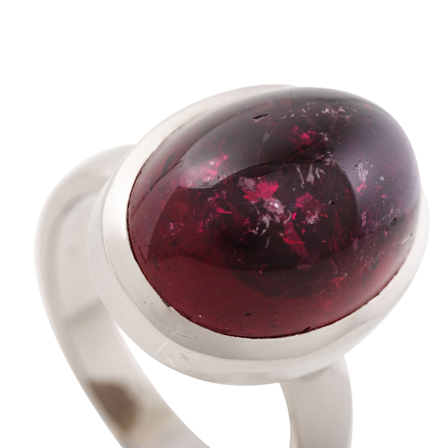 Ring with cabochon-cut rubellite, ca. 17 x 12.8 mm, WG 18K, 14 g, ring size ca. 56, 21st century, solid design. Mint condition.