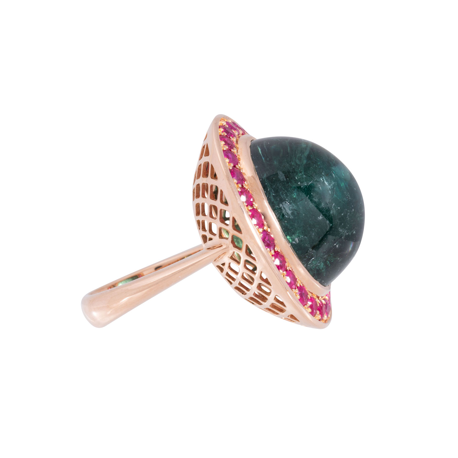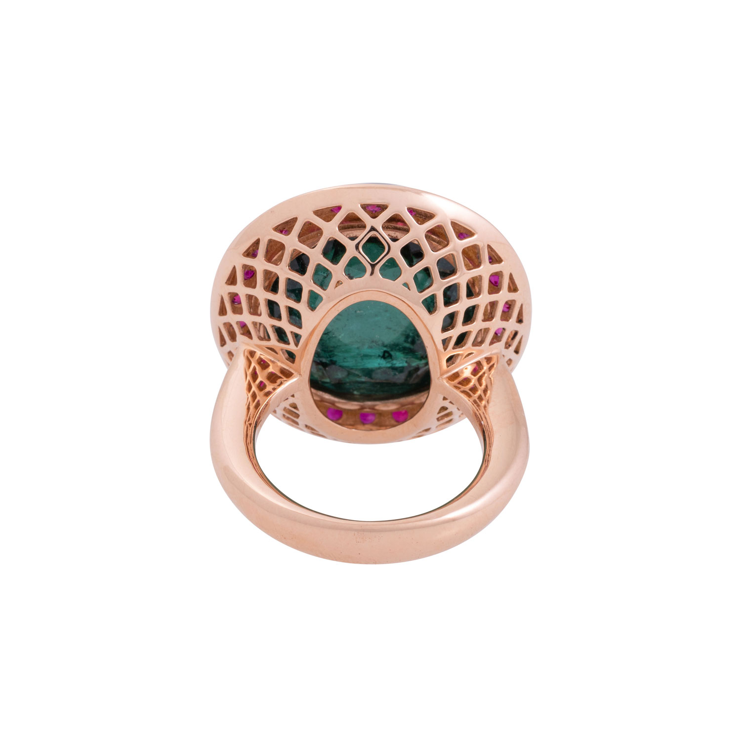 Ring with tourmaline 42,38 ct, eng., and rubies. 3,01 ct, engraved, RSG 18K, 28,1 g. ring size 61, 21st century, high-quality goldsmith work.