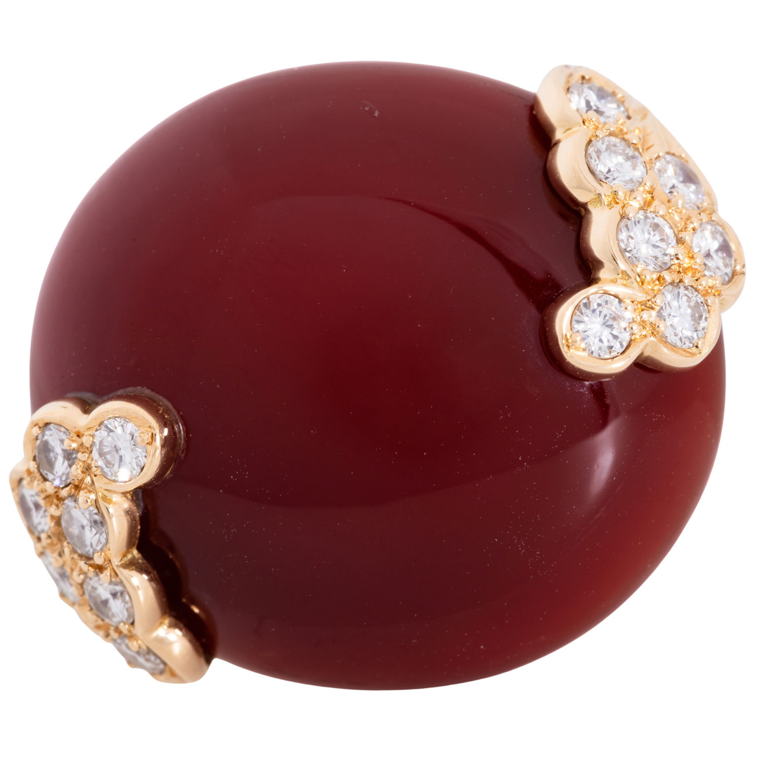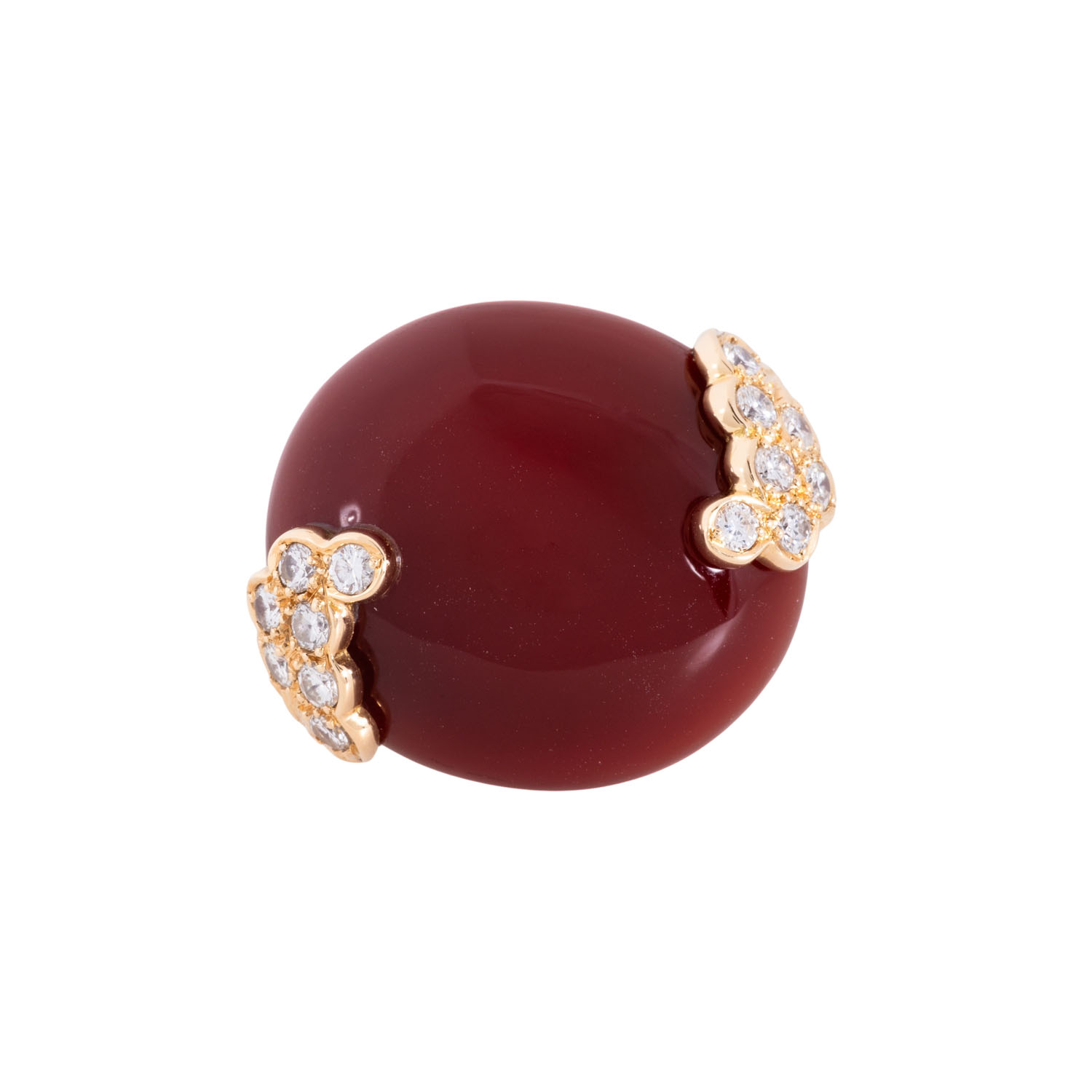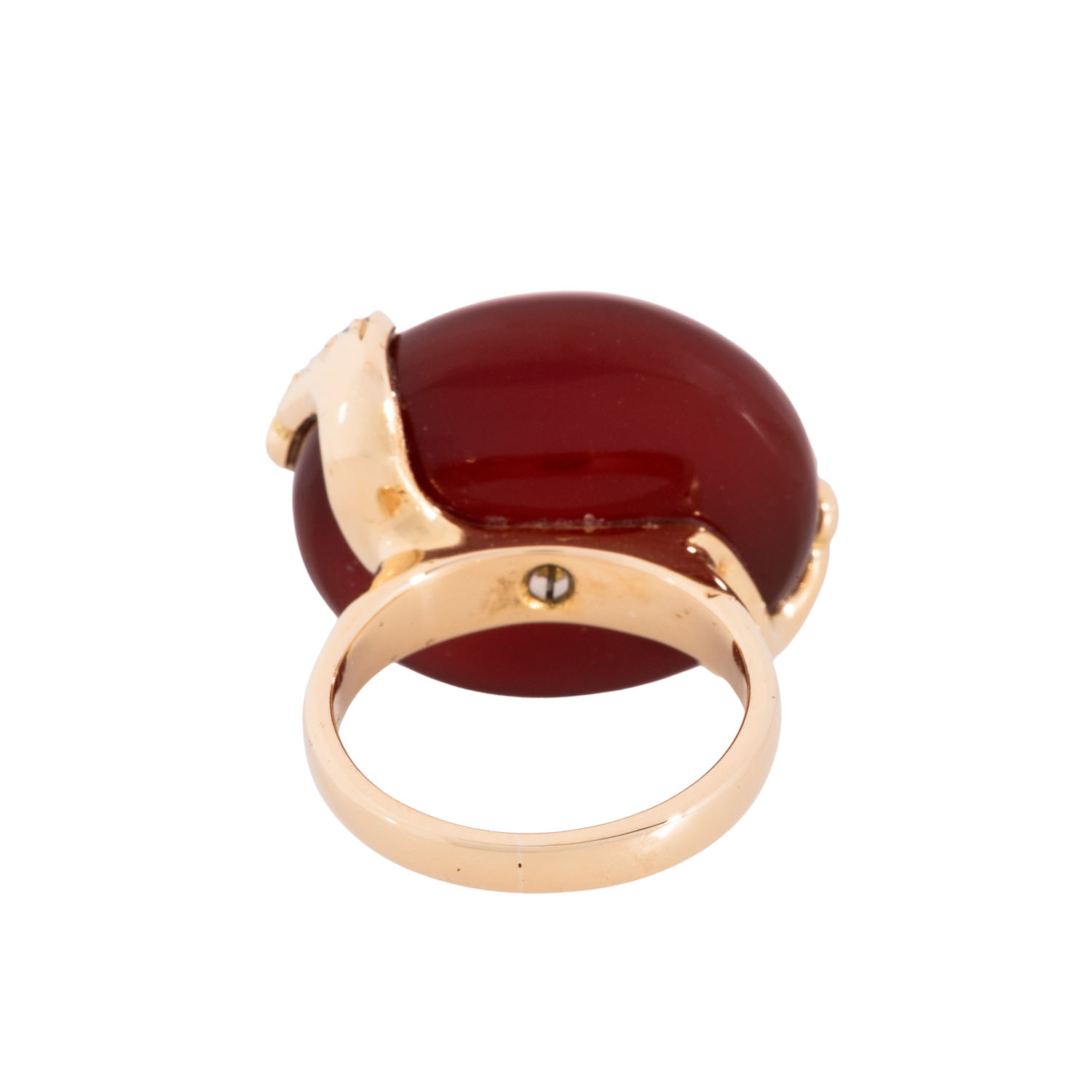 Ring with carnelian cabochon and small brilliant-cut diamonds totalling ca. 0.55 ct, ca. WHITE (H)/SI, 18K YG, 14.6 gr, ring size 53, 1980s, minor signs of wear, incl. Jacobi case and Jacobi certificate.