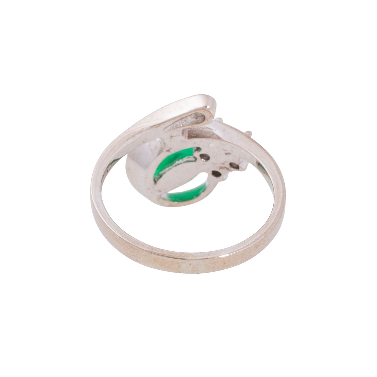 Ring with chrysoprase and 3 single-cut diamonds totalling 0.09 ct (grav.), ca. WHITE (H)/VS, 14K white gold, 4.2 g, ring size: 53, W: ca. 2.1 - 15.3 mm, mid-20th century, minimal signs of wear, with hallmark.