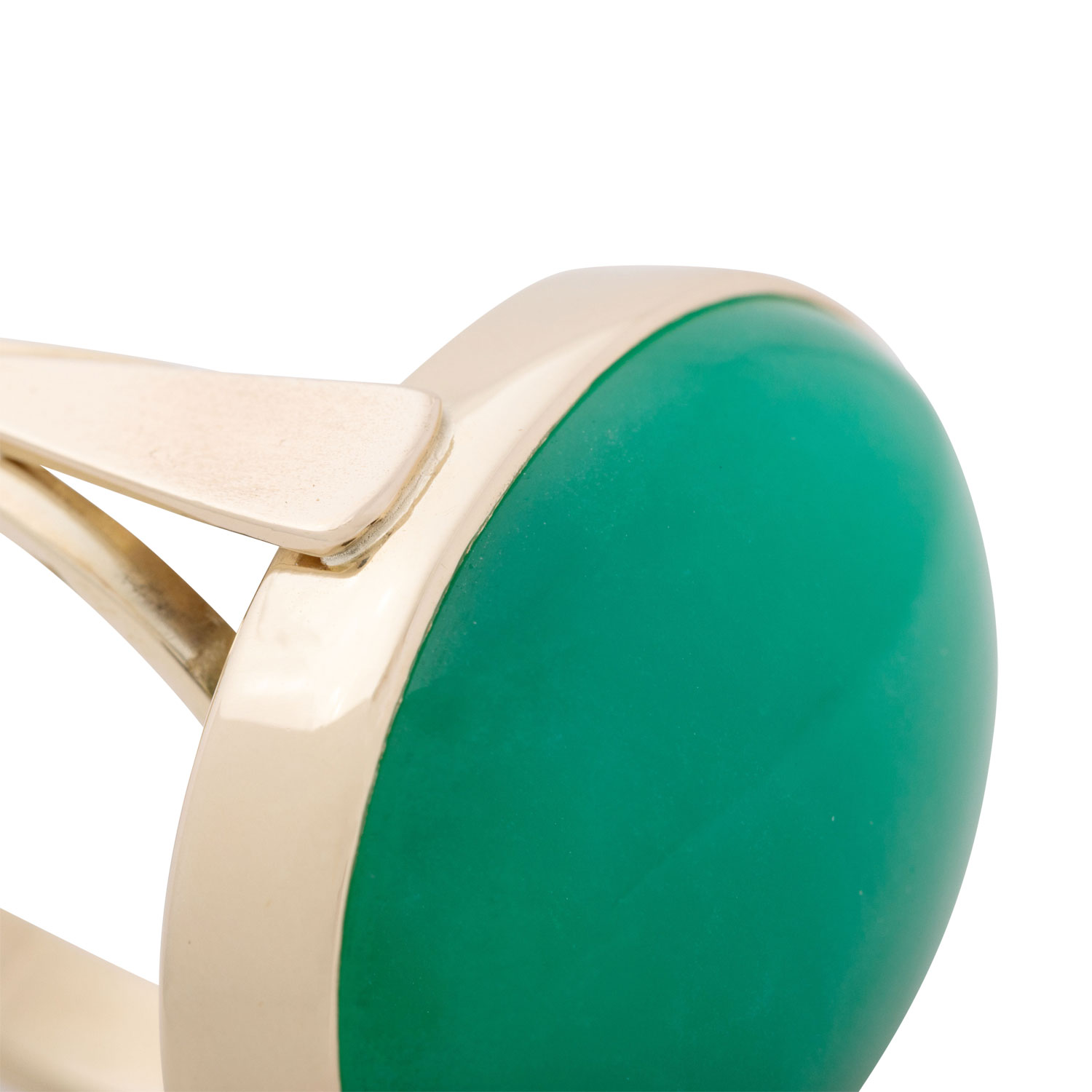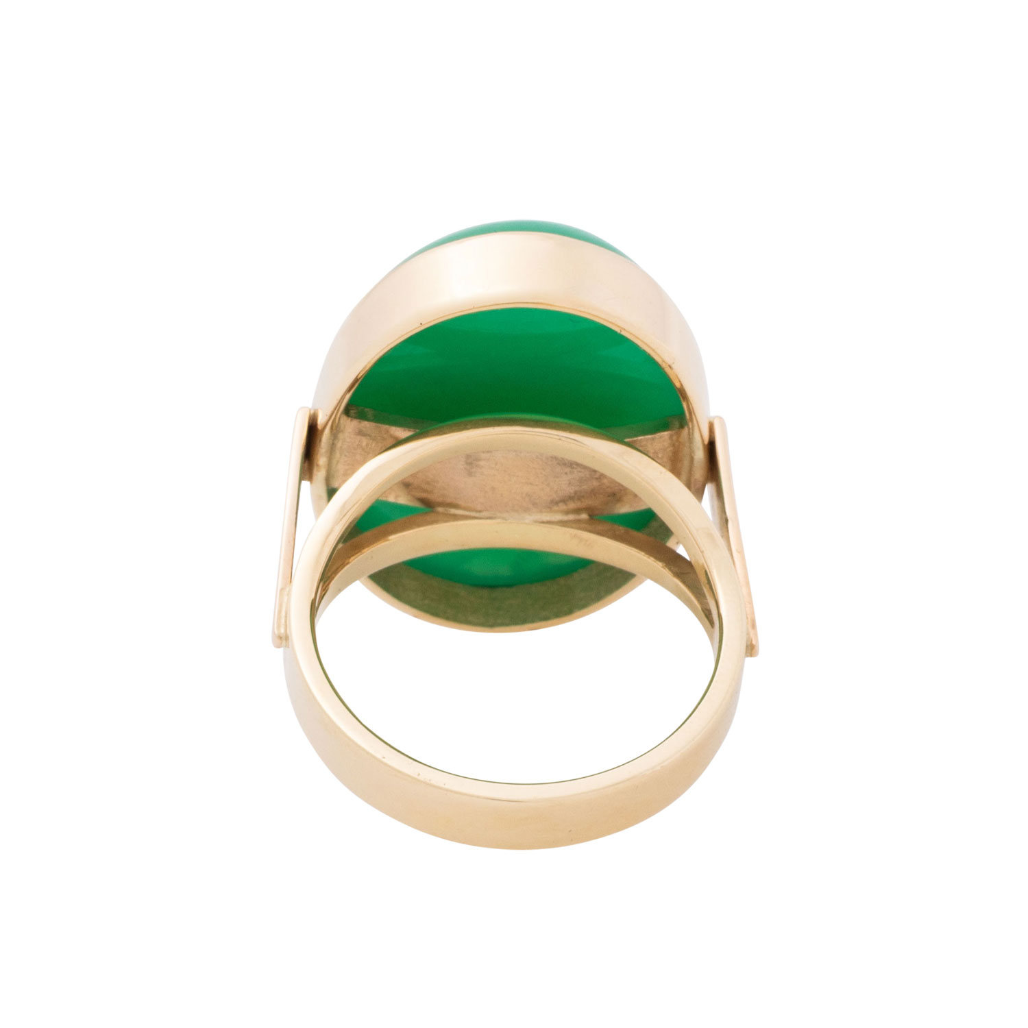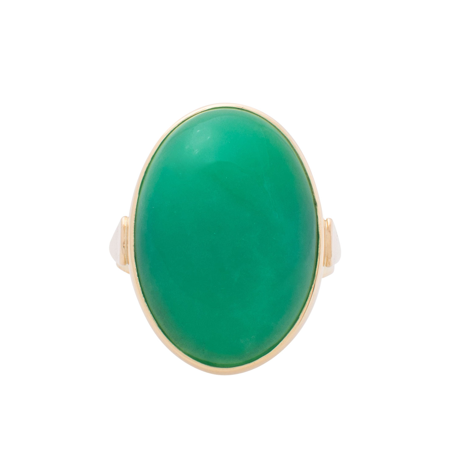 Ring with oval chrysoprase cabochon, ap. 24.4 x 17.2 mm, 14K yellow gold, 13.2 g, ring size 58, 2nd half of 20th century, minimal signs of wear, handcrafted.