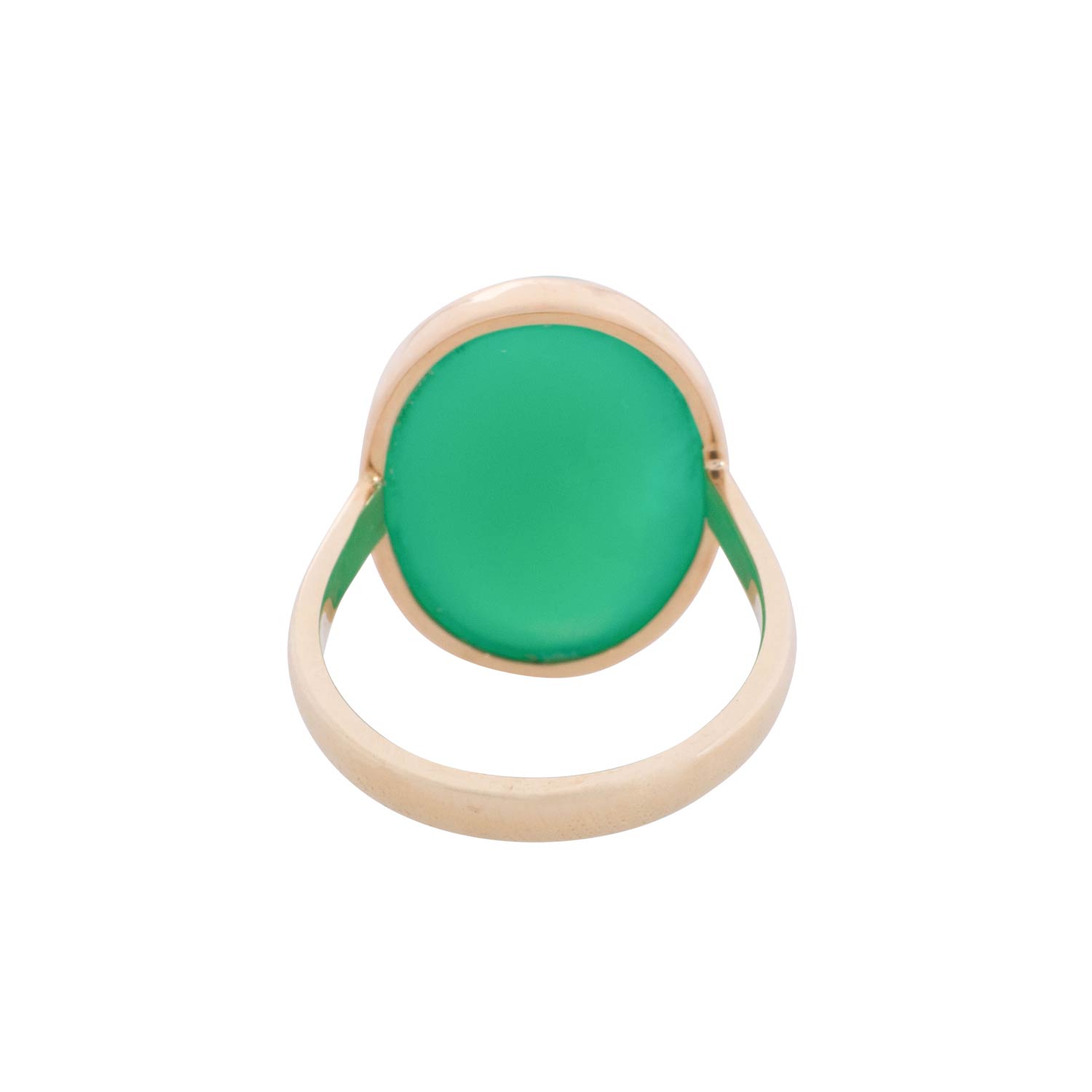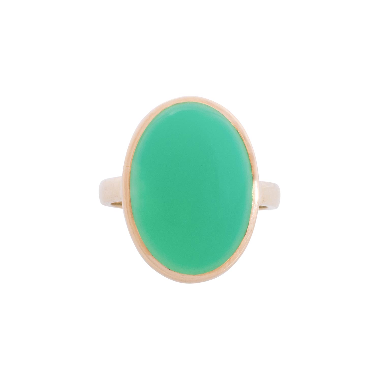 Ring with oval-cut chrysoprase ca. 16.7 x 12.9 mm, 14K yellow gold, 4.7 g, ring size: 51, W: ca. 2.6 - 19.2 mm, 2nd half of the 20th century, minimal signs of wear, with hallmark 'WF' and engraving 'Ursular'.