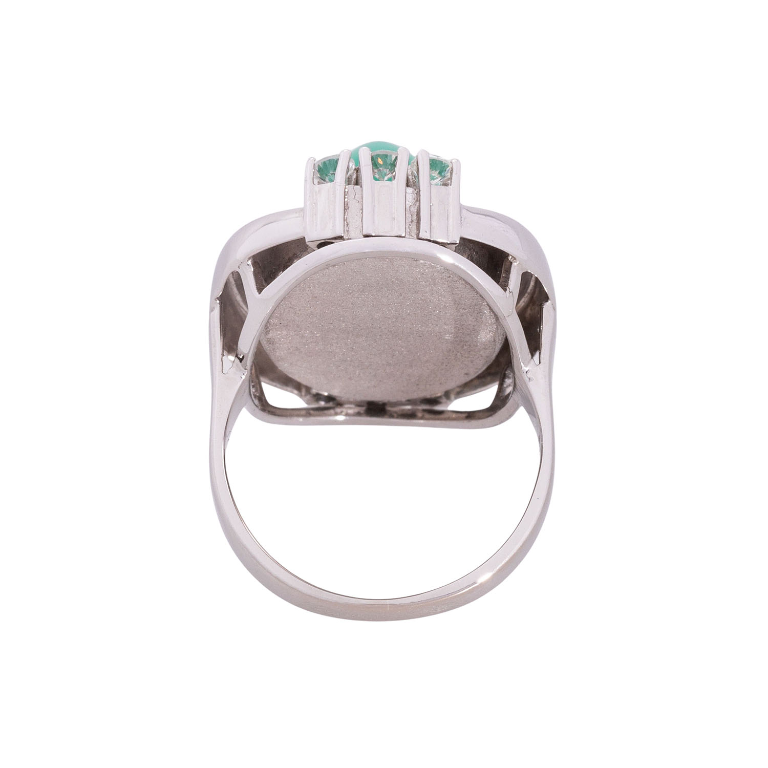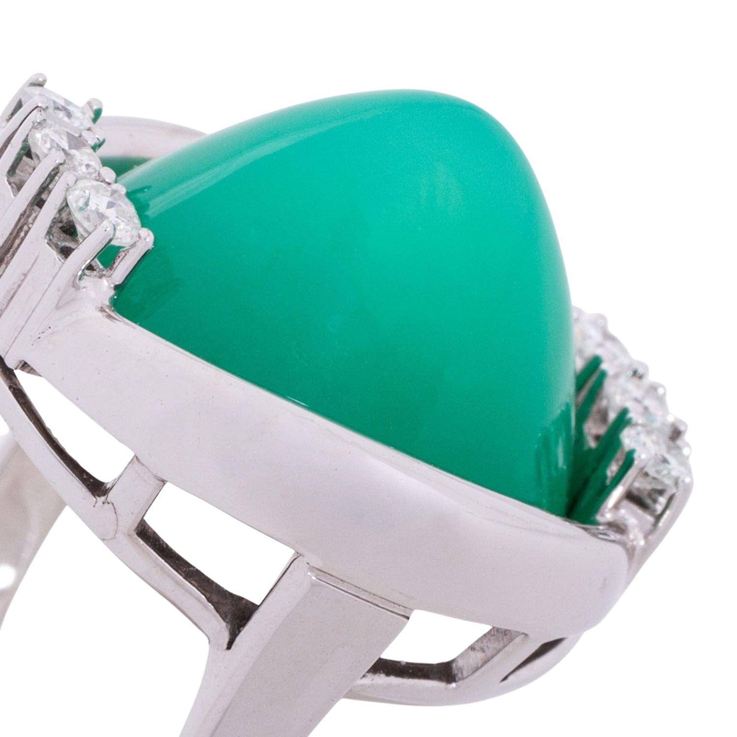 Ring with chrysopras cabochon, oval, ap. 19 x 14.5 mm, 6 brilliant cut diamonds, totalling 0.36 ct (marked), STW (I-J)/P, 14K white gold, 10.2 g, ring size 54, 2nd half of 20th century, minimal signs of wear.