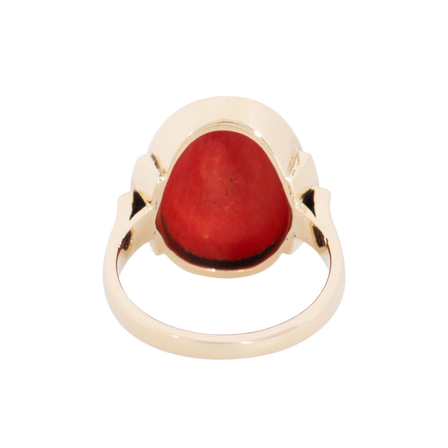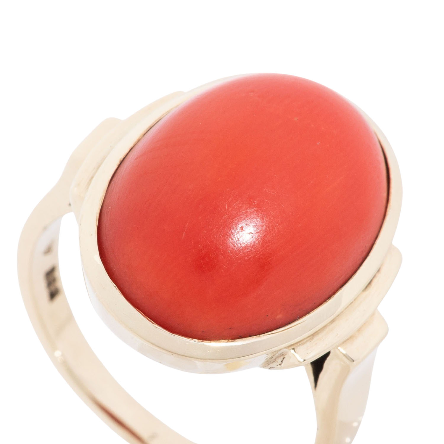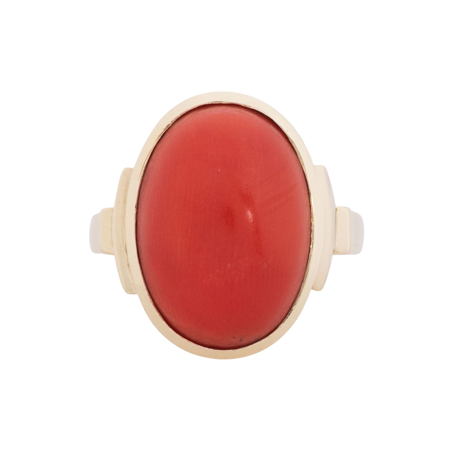 Ring with coral cabochon, ap. 18 x 13 mm, 14K yellow gold, 7.8 g, ring size 56, late 20th century, minimal signs of wear, IMPORT/EXPORT RESTRICTIONS OUTSIDE THE EU!.