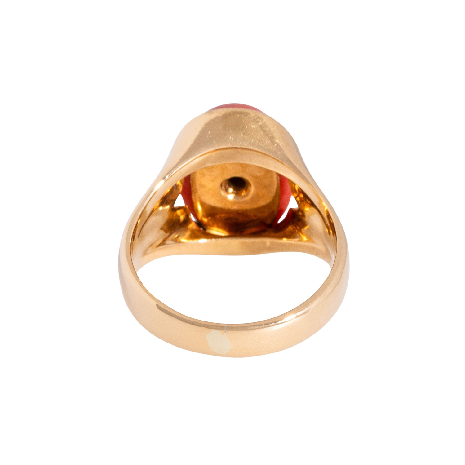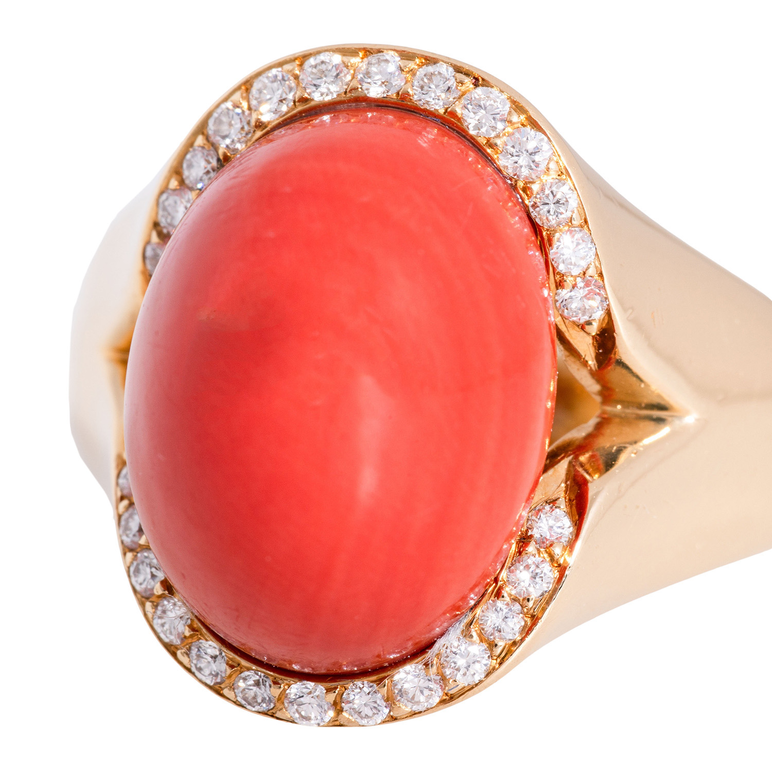 Ring with oval coral cabochon, Sardegna, ap. 13 x 10 mm, 26 brilliant cut diamonds, totalling ap. 0.18 ct, 18K yellow gold, 9.2 g, ring size 53, late 20th century, minor signs of wear, handcrafted. IMPORT/EXPORT RESTRICTIONS OUTSIDE THE EU!