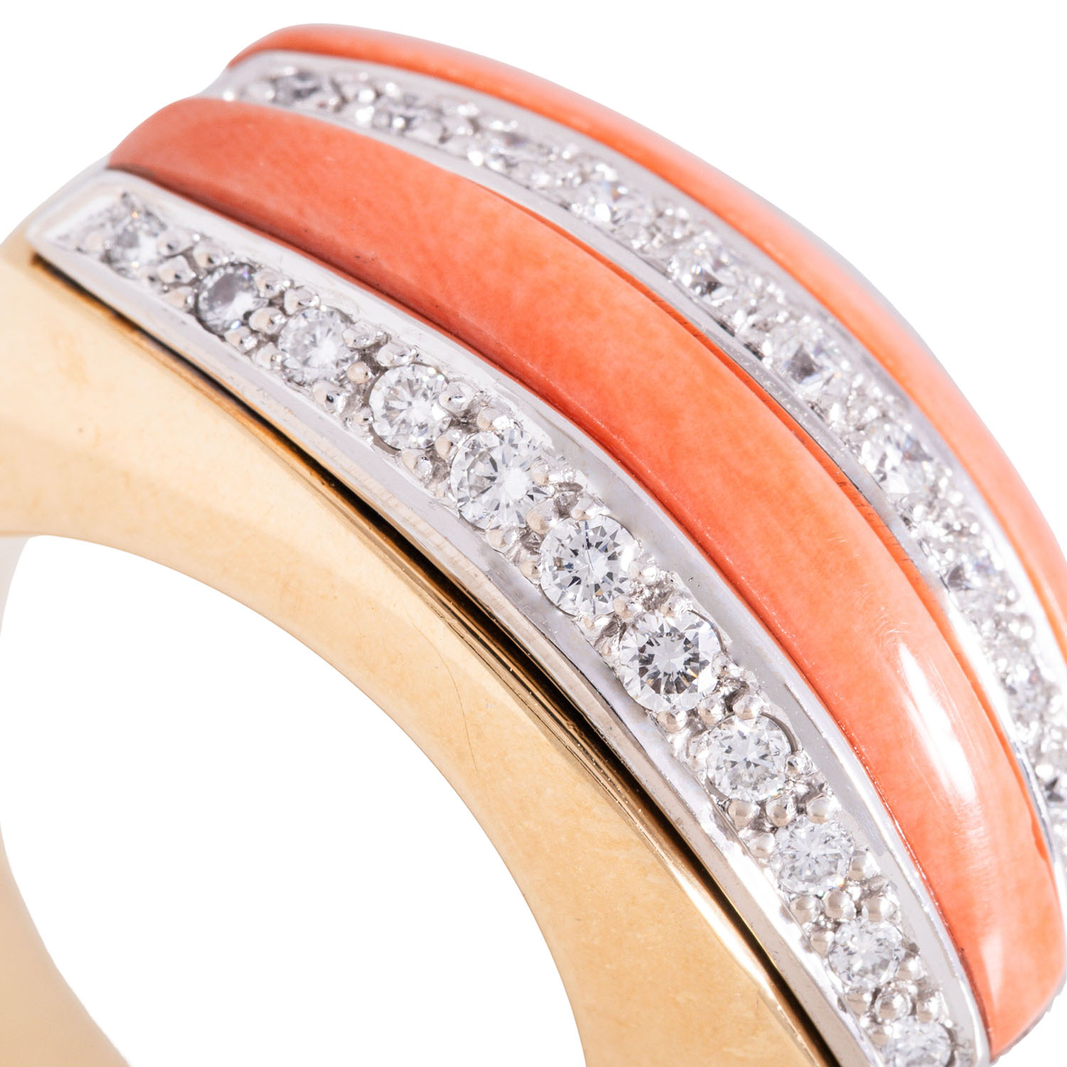 Ring with inlay of coral and 33 brilliant cut diamonds, totalling 0.90 ct (graved), ca. WHITE (H)/VS-SI, 18K yellow and white gold, 26.7 g, ring size 57, late 20th century, minimal signs of wear.