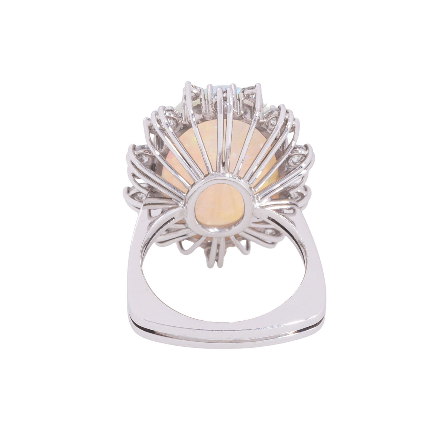 Ring with oval opal cabochon of ca. 4.28 ct surrounded by brilliant-cut diamonds totaling ca. 0.66 ct,