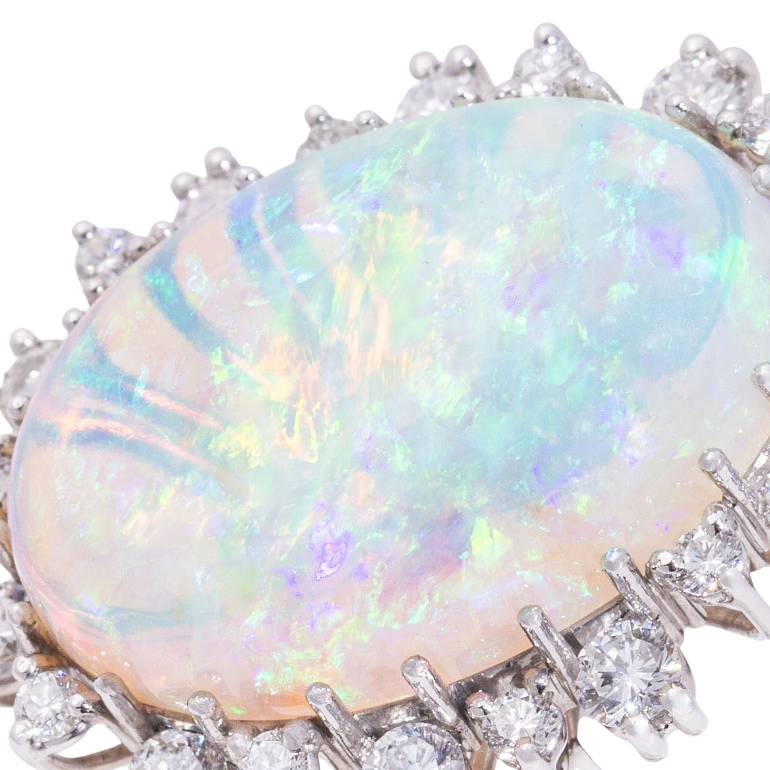 Ring with crystal opal of ca. 10 ct with vivid play-of-colour, brilliant-cut diamonds totalling ca. 0.70 ct, good colour a. clarity, 18K WG, 11.1 gr, ring size 53, 1960s/70s, minor signs of wear, opal in very good condition.
