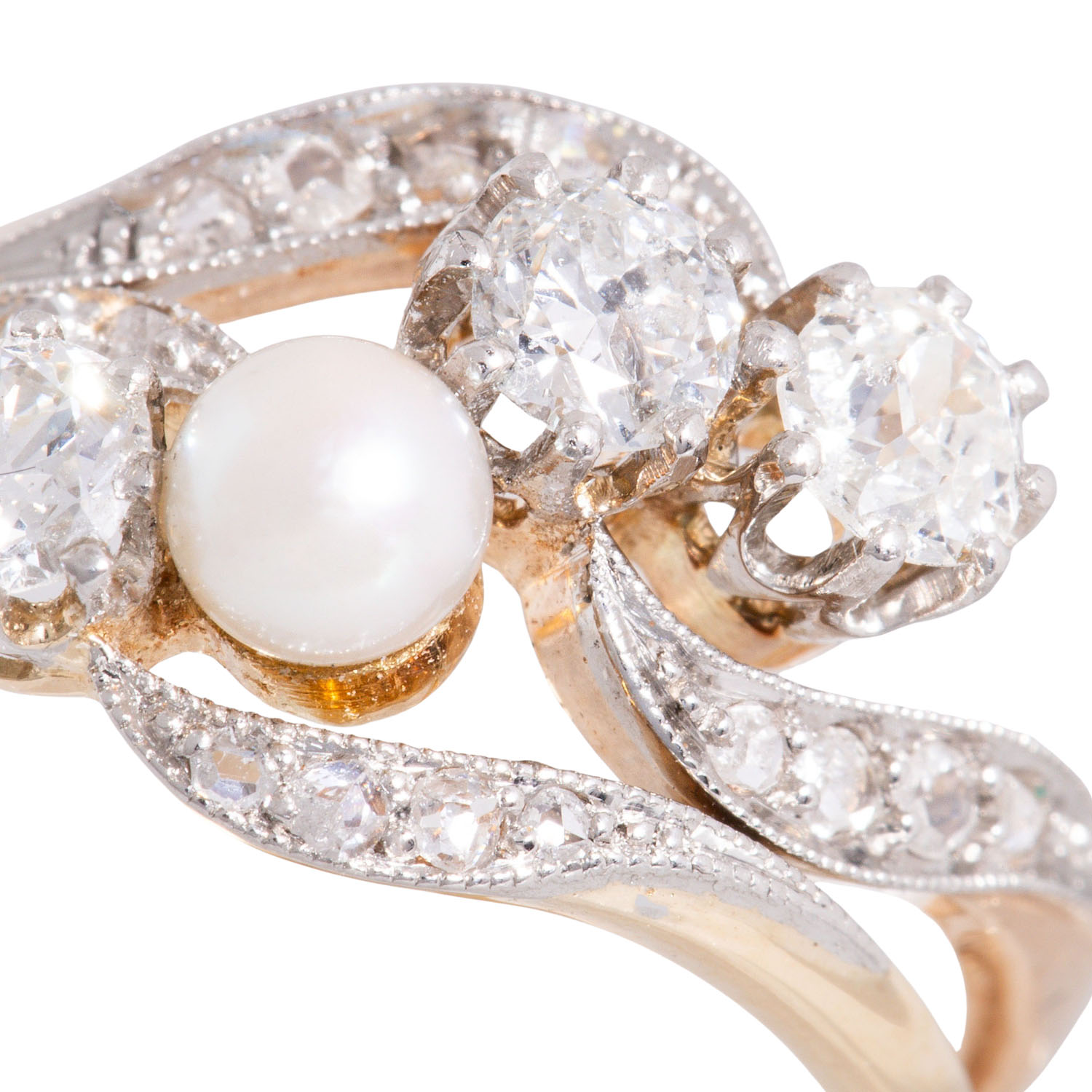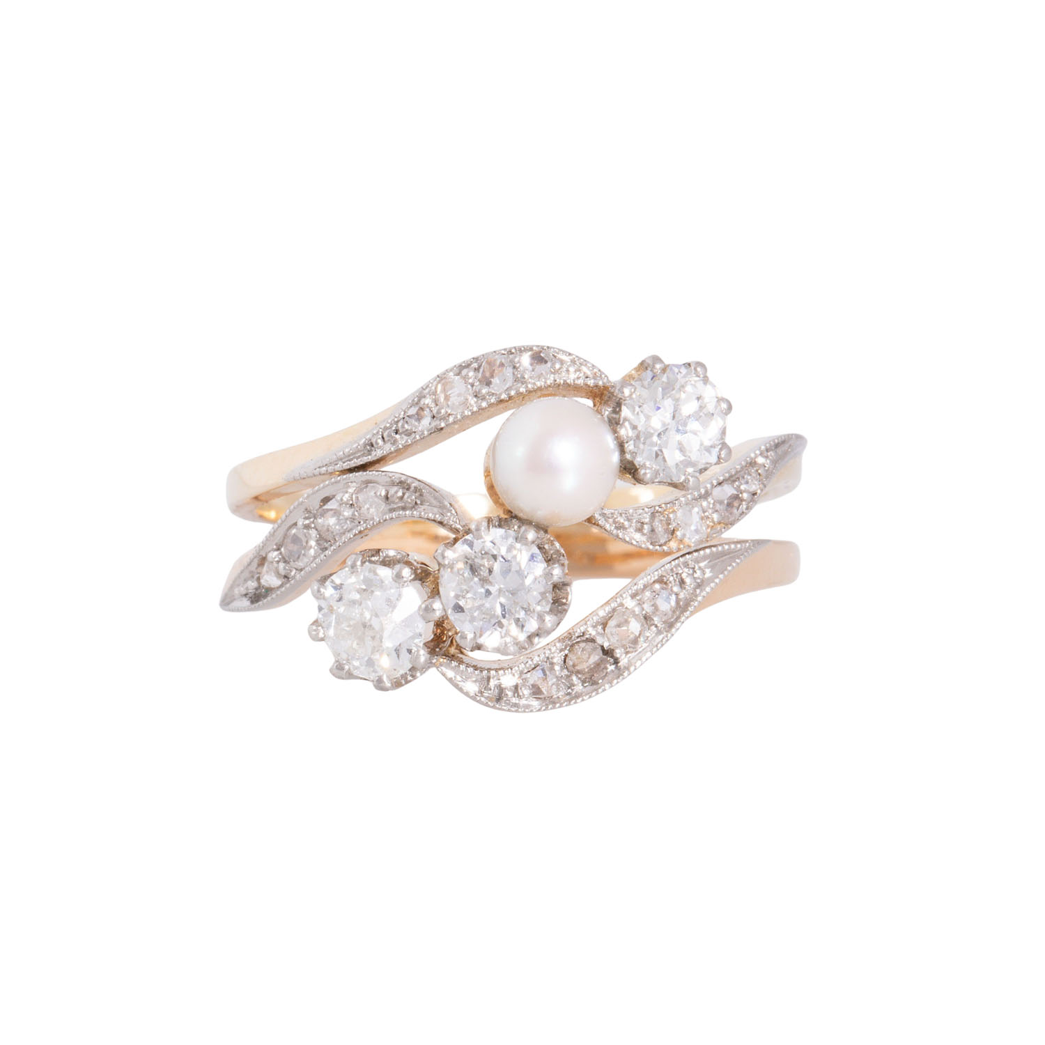 Ring with cultured pearl, 3 old-european-cut diamonds and 15 rose-cut diamonds, totalling ca. 0.68 ct, ca. WHITE (H)/SI, cultured pearl D: ca. 3.8 mm, 14K yellow gold, 4 g, faceside platinum, ring size: 52, W: ca. 2.9 -11.5 mm, mid-20th century, good condition for its age, with hallmark, handcrafted work.