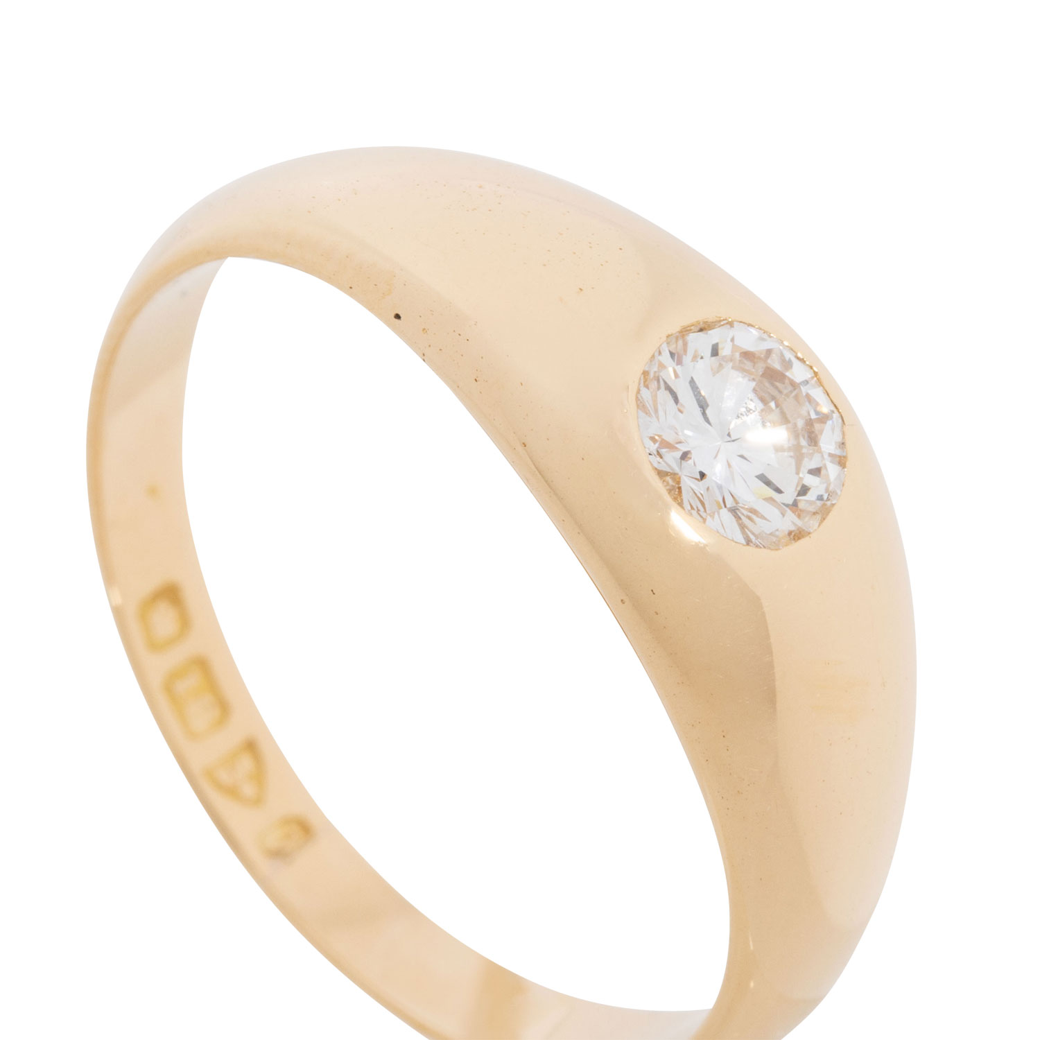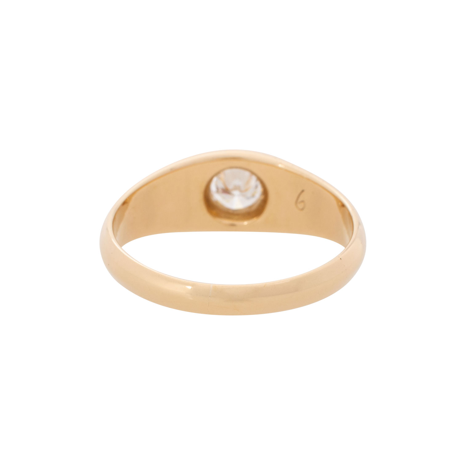 Ring with brilliant cut diamond, totalling ap. 0.54 ct, WHITE, (H)/VS, 18K yellow gold, 6.3 g, ring size 63, late 20th century, minimal signs of wear.