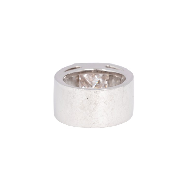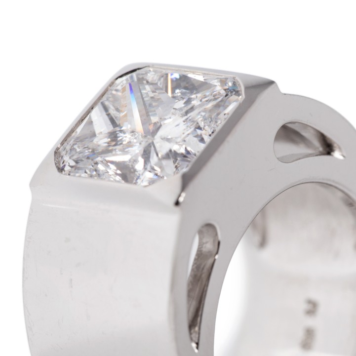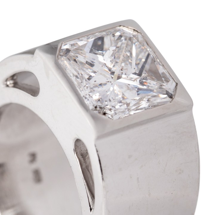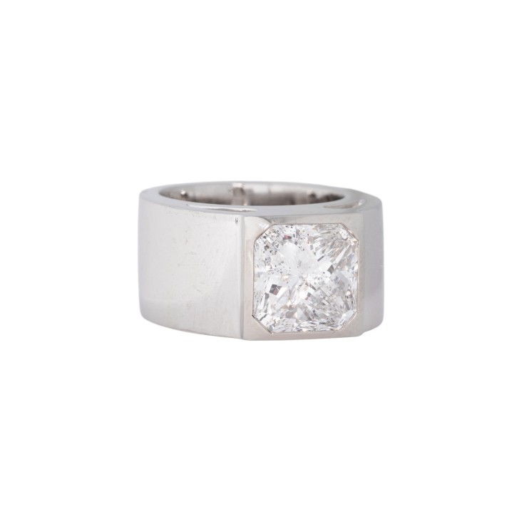 Ring with radiant-cut diamond of ca. 6 ct, ca. RW (F-G)/I1 (clarity enhanced), platinum 950, 34.2 g, ring size ca. 58, signs of wear. Replacement value for a comparable piece without clarity enhancement: ca. 100,000 €.