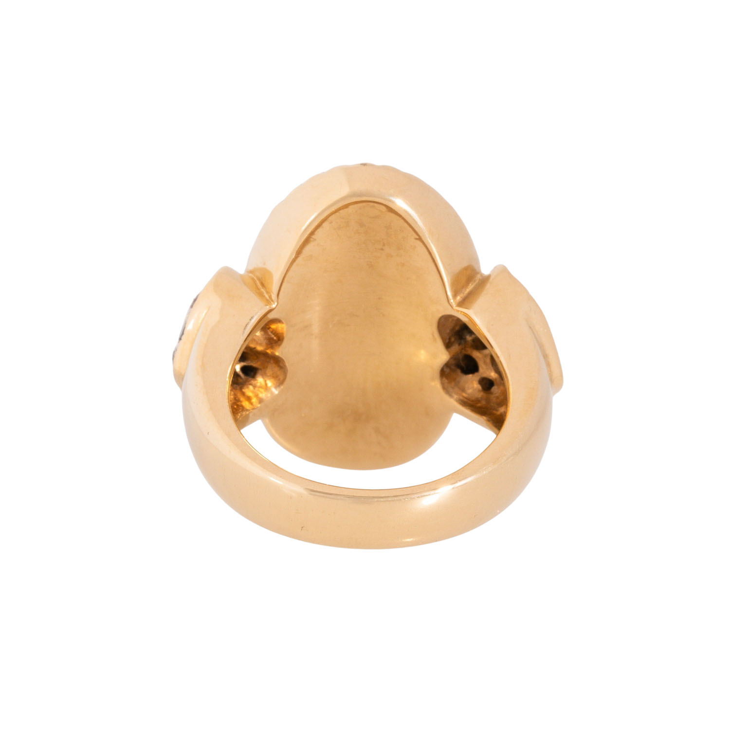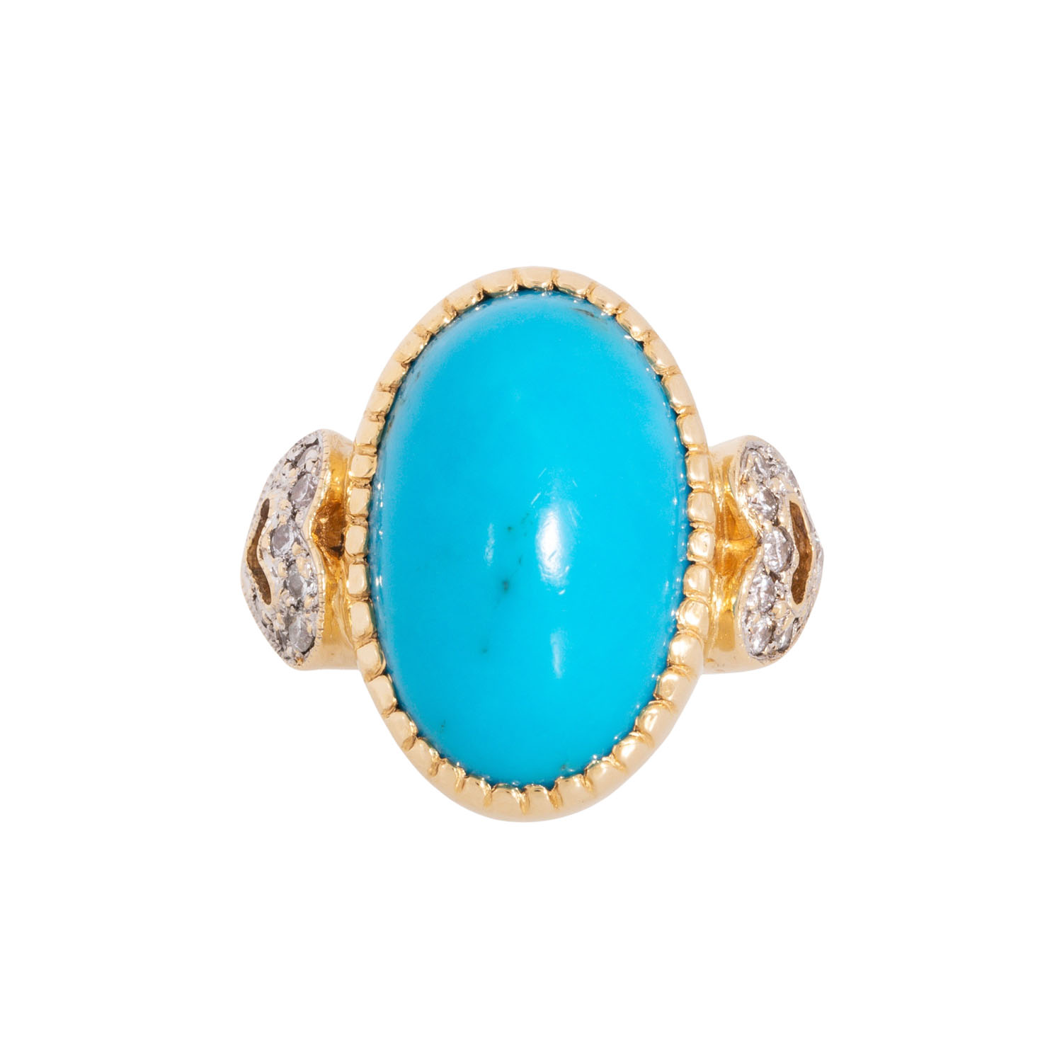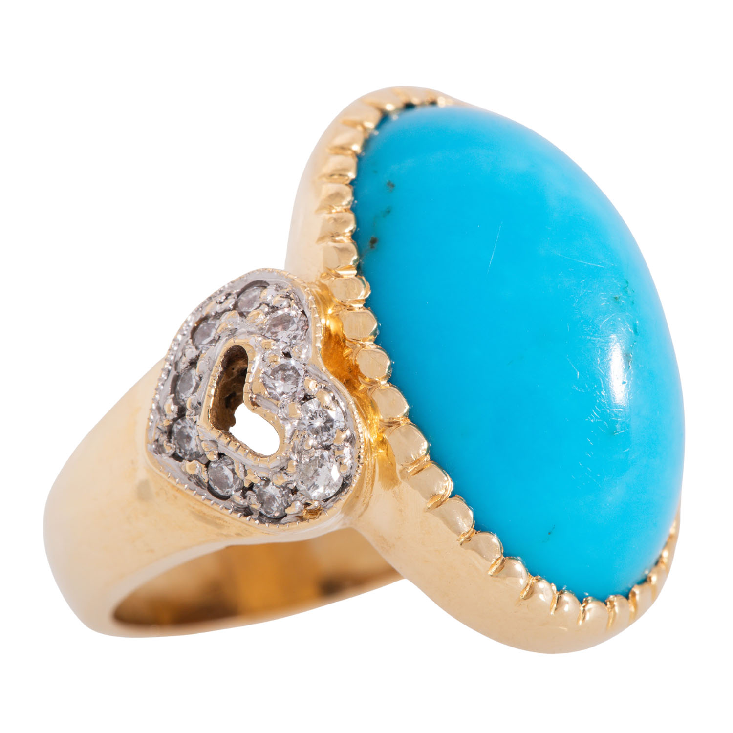 Ring with brilliant-cut diamonds totalling ca. 0.2 ct, medium to good colour and clarity, set in a heart shape flanking an oval cabochon-cut gemstone prob. Persian turquoise, 19x12 mm, 18K yellow gold, 17 g, ring size 51, 20th century, signs of wear.