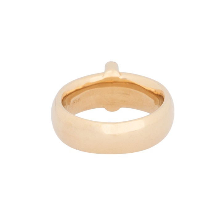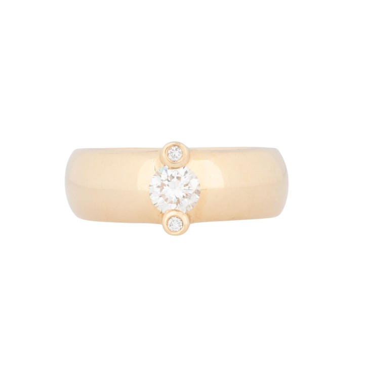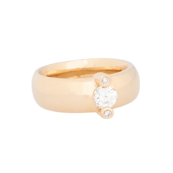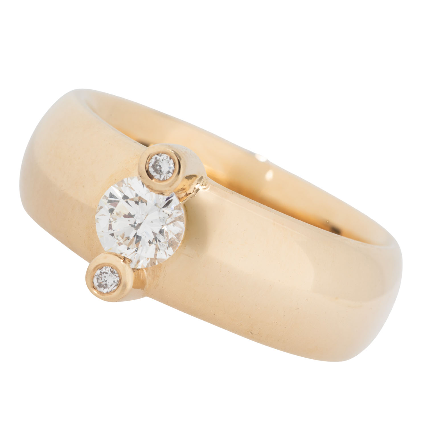 Ring with brilliant-cut diamonds totalling ca. 0.56 ct, marked, of which 1x ca. 0.5 ct, ca. WHITE (H)/SI1and 2x ca. 0.03 ct, good colour and clarity, 14K yellow gold, 12.3 g, ring size 54, W: 7 mm, 21st century, minor signs of wear, with unknown maker's mark, solid workmanship.