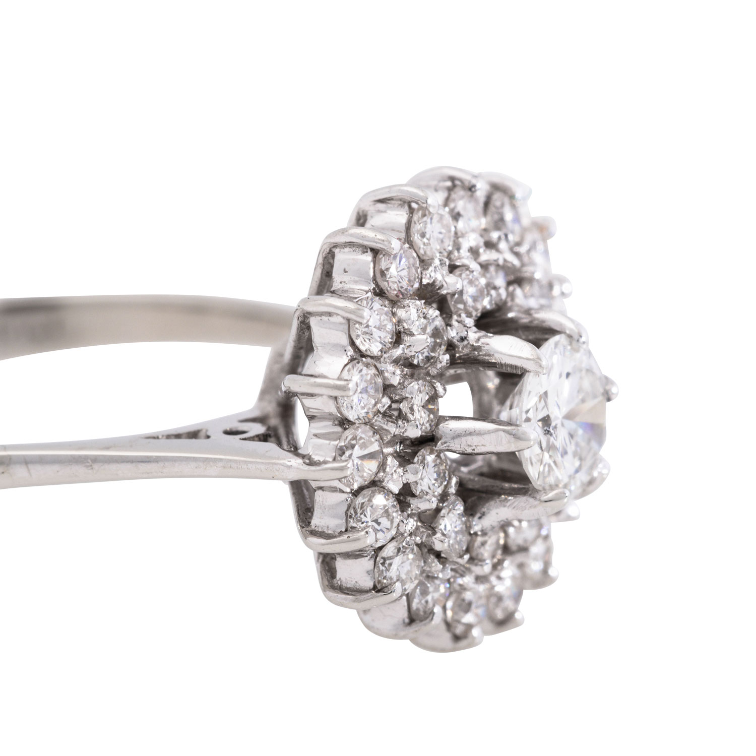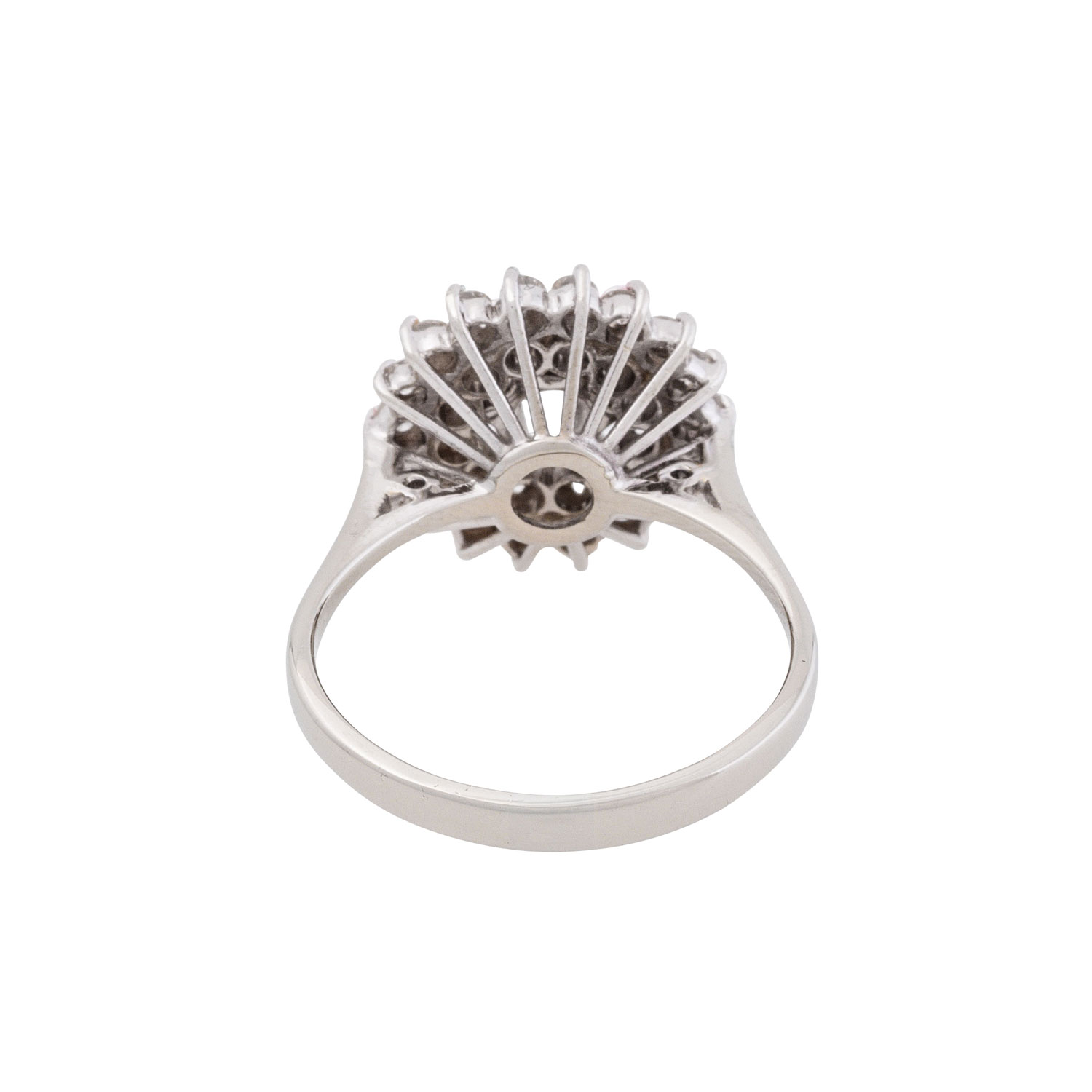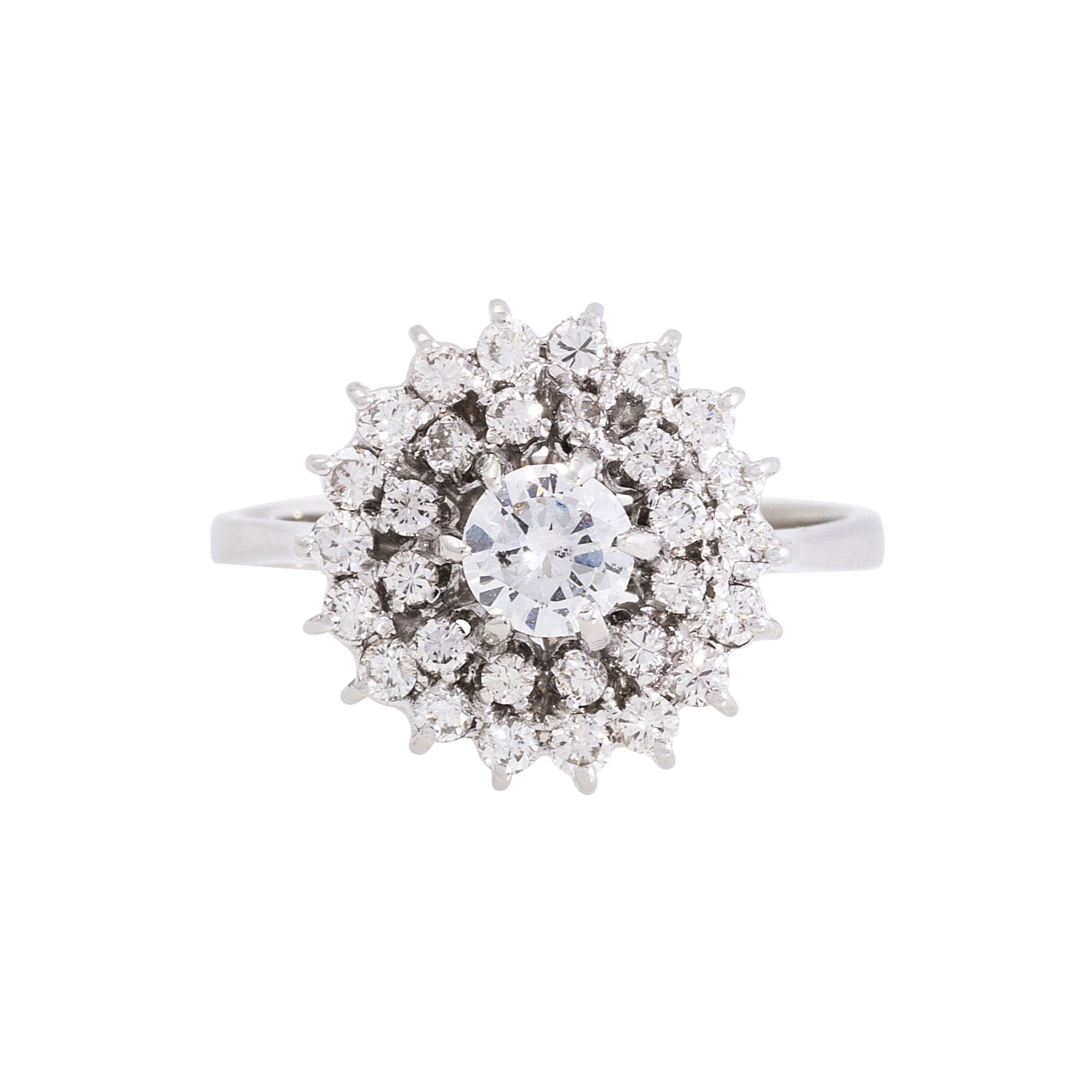 Ring with brilliant-cut diamonds totalling ca. 0.98 ct, of which 1x ca. 0.38 ct, ca. WHITE (H)/SI2 surrounded by 2 rows of stones totalling ca. 0.6 ct, medium to good colour and clarity, 18K white gold, 4.1 g, ring size 54, 2nd half of 20th century, minor signs of wear.