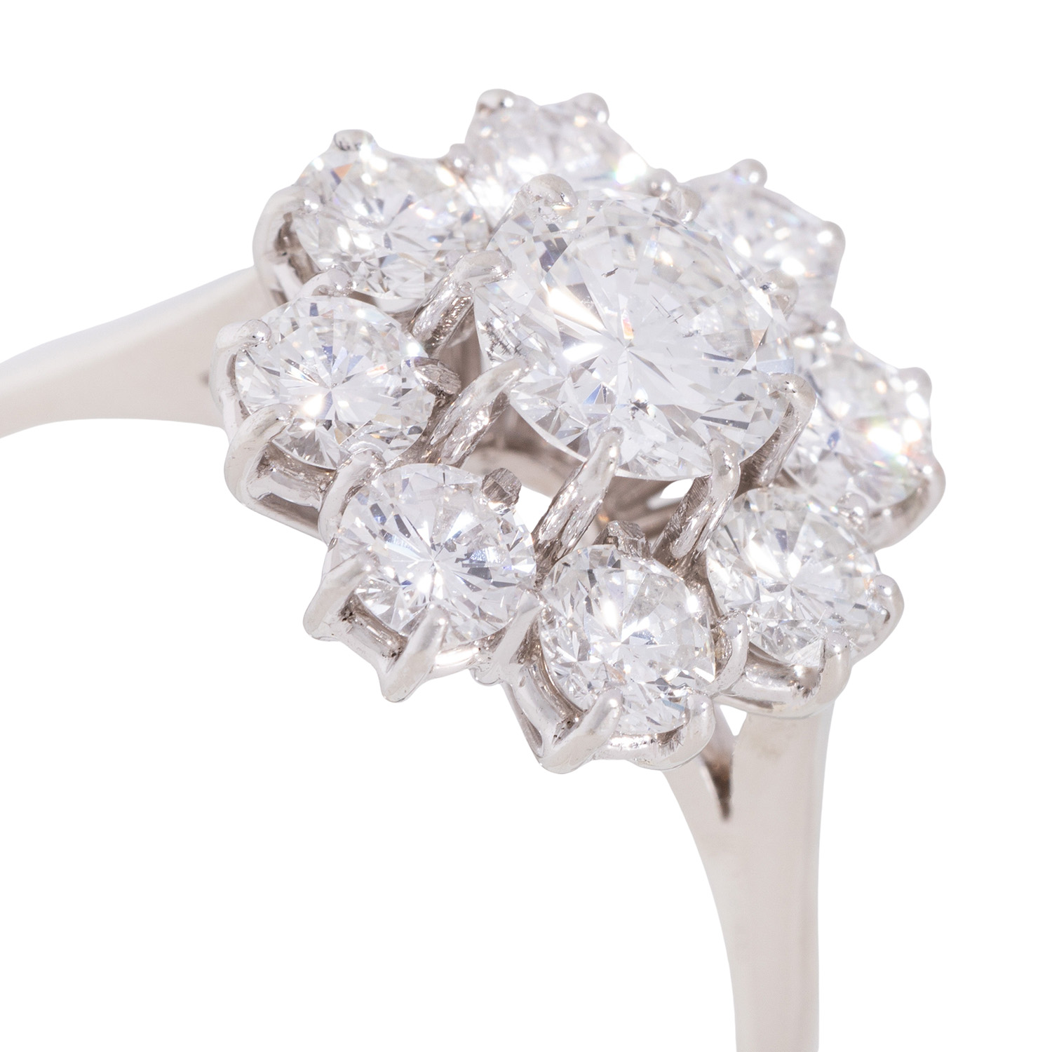 Ring with brilliant-cut diamonds totaling ca. 2.27 ct, central brilliant-cut diamond ca. 0.83 ct (eng.), ca. WHITE (H)/SI3, further brilliant-cut diamonds totaling ca. 1.44 ct, WHITE (H)/SI, WG 18K, RW: 64, 2nd half 20th century, minor signs of wear.