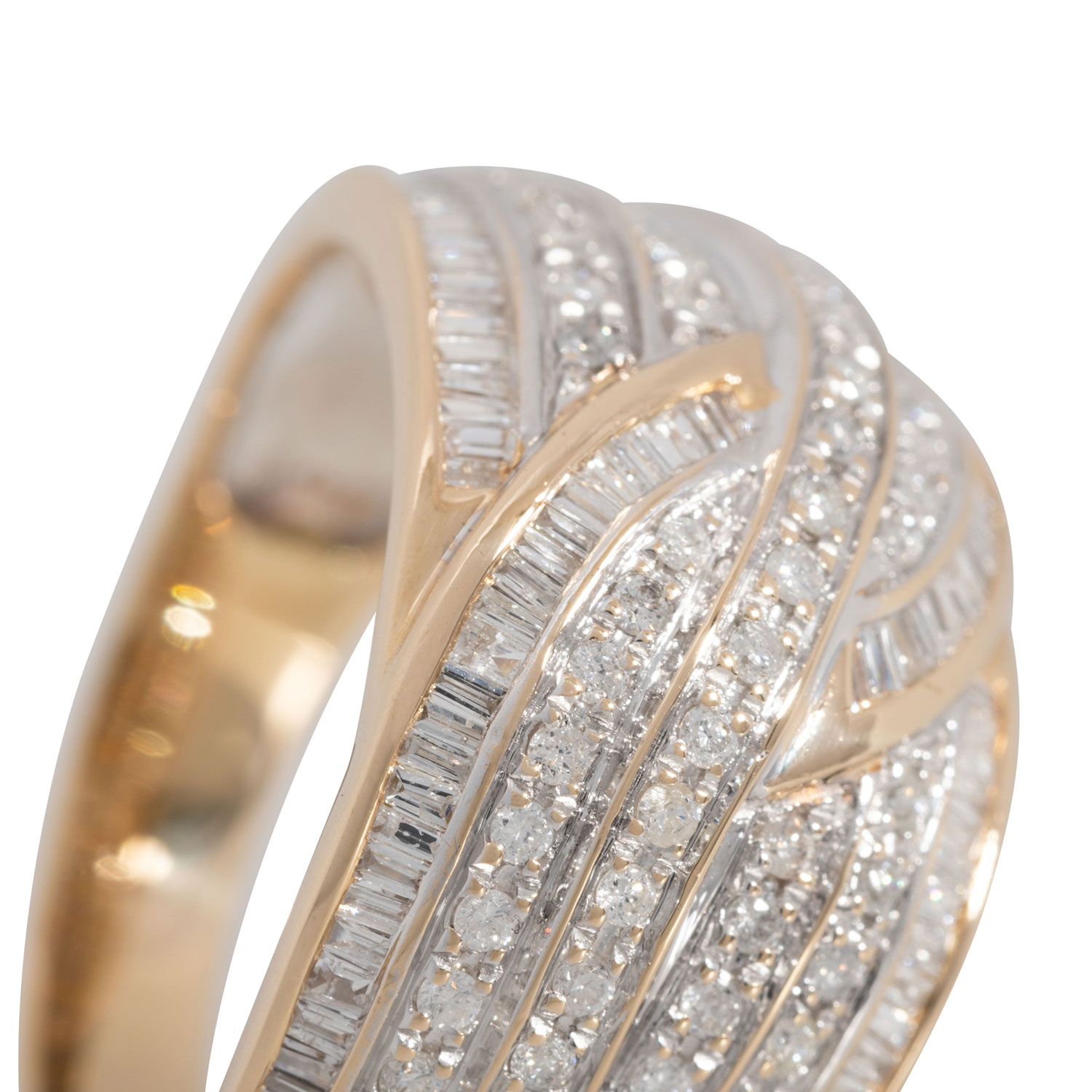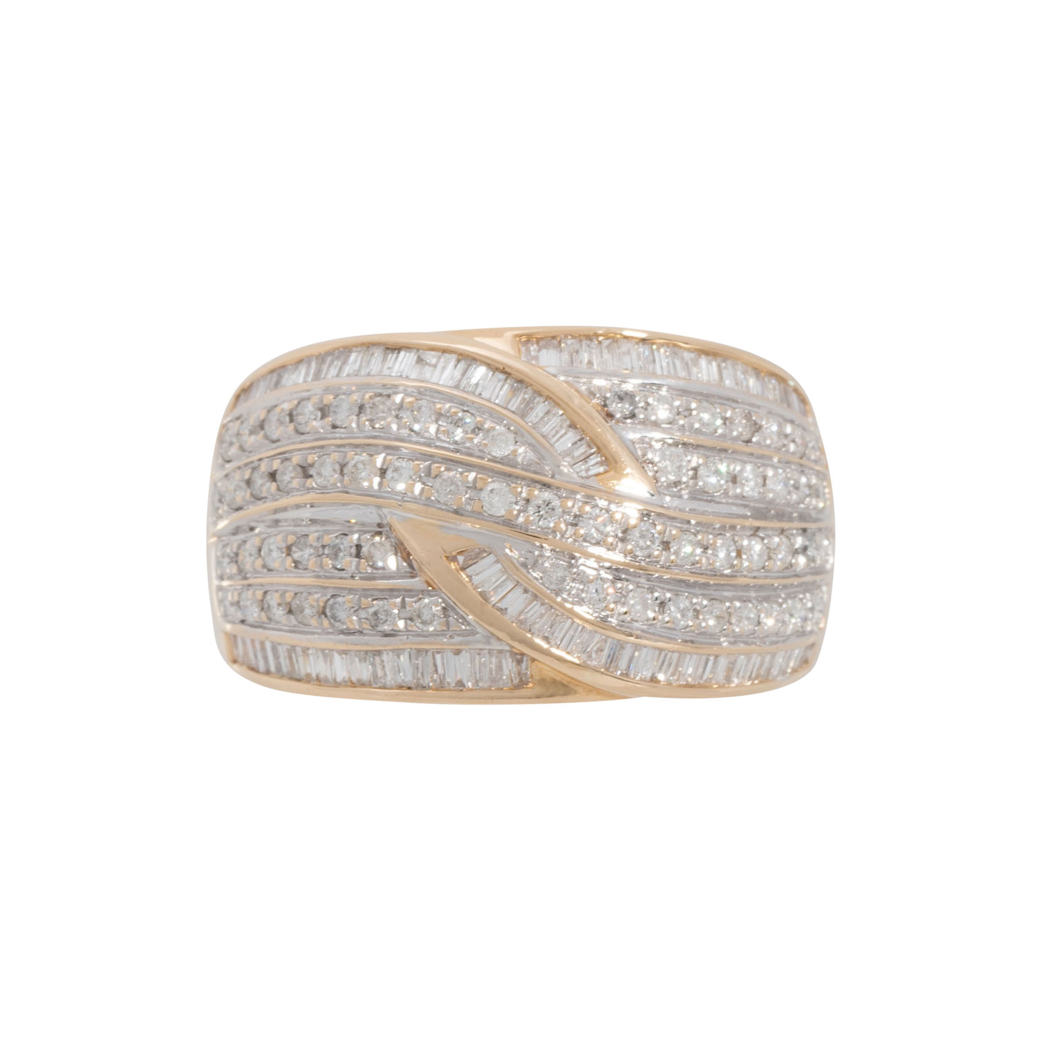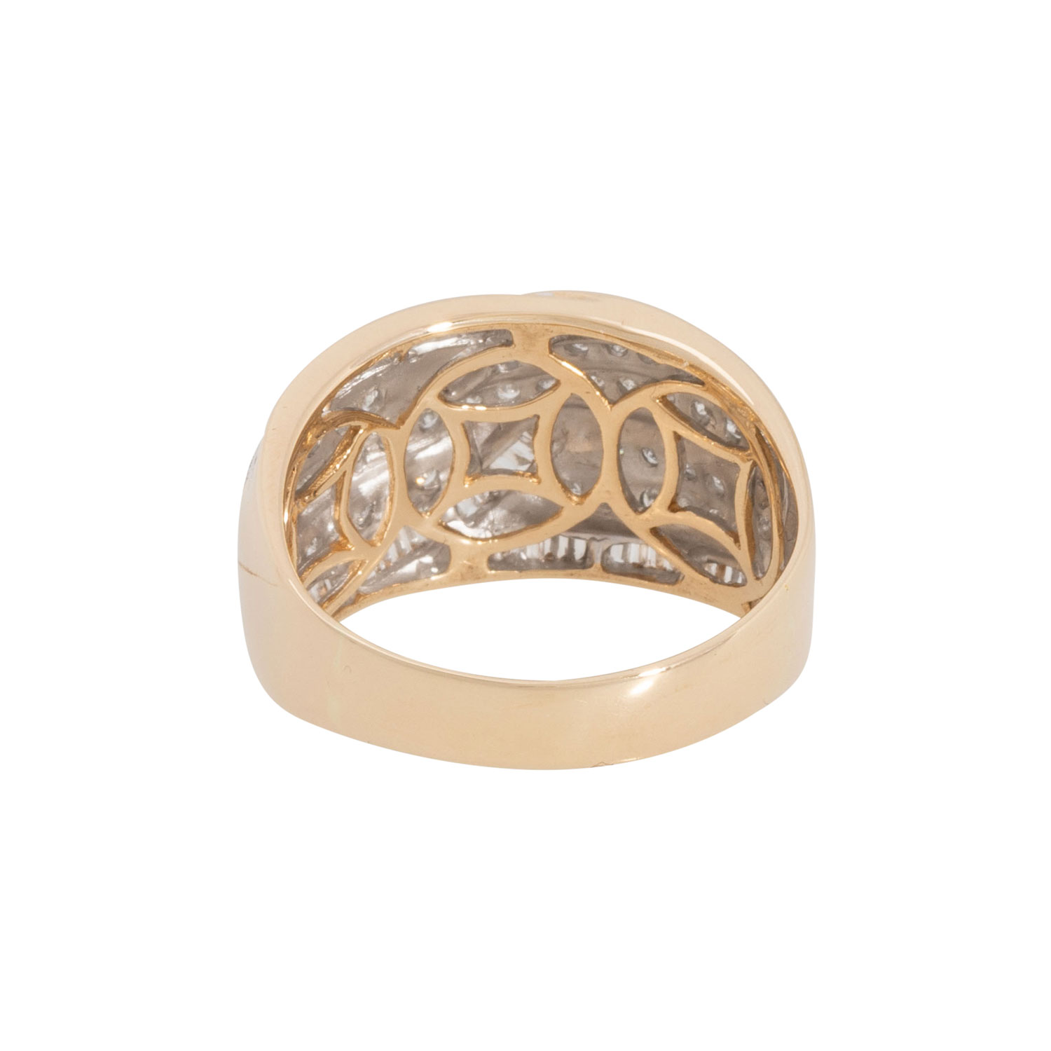 Ring with brilliant- and baguette- and trapeze-cut diamonds totalling ca. 2.5 ct, ca. WHITE (H)/P1 (some chipped), set in lines, 14K yellow gold, 6.1 g, ring size 60, 20th/21st century, signs of wear.