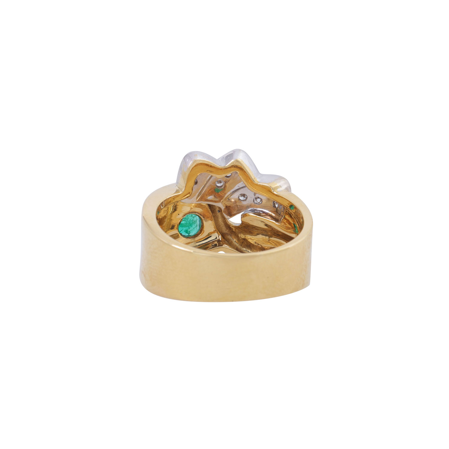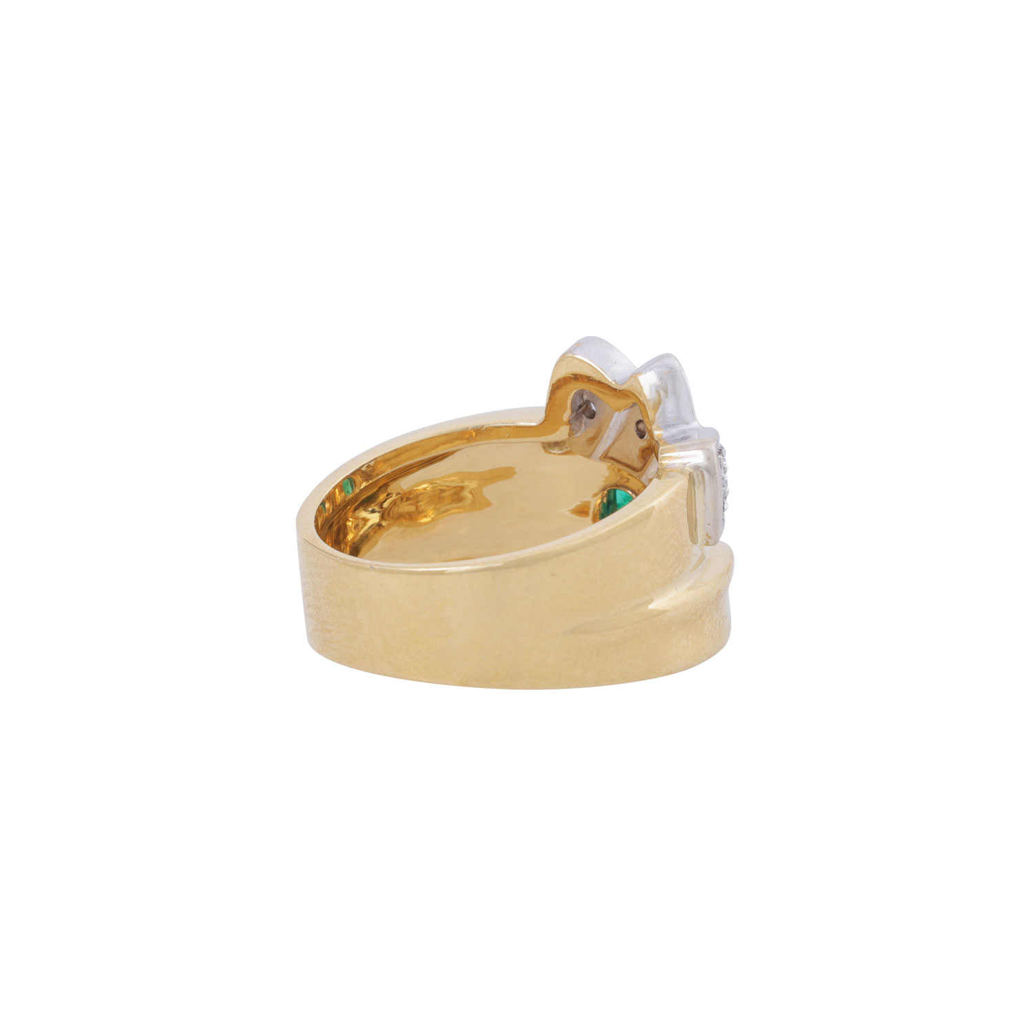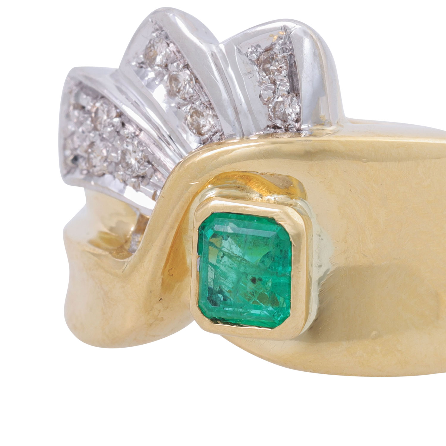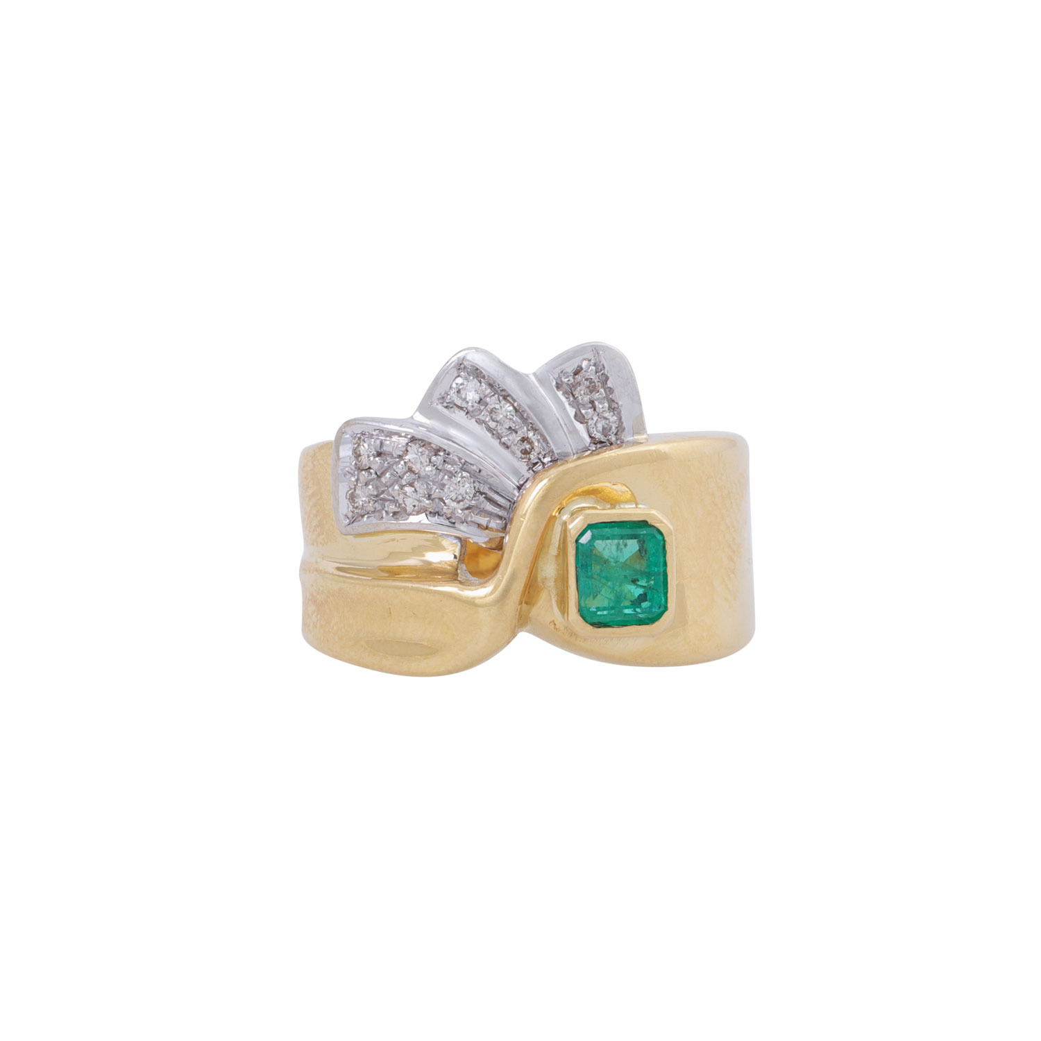 Ring with emerald ca. 0.4ct and 10 brilliant-cut diamonds totalling ca. 0.15ct, good to medium colour and clarity, brilliant-cut diamonds partly chipped, YG/WG 18K, 9.8 g, ring size 54, late 20th century, minimal signs of wear.