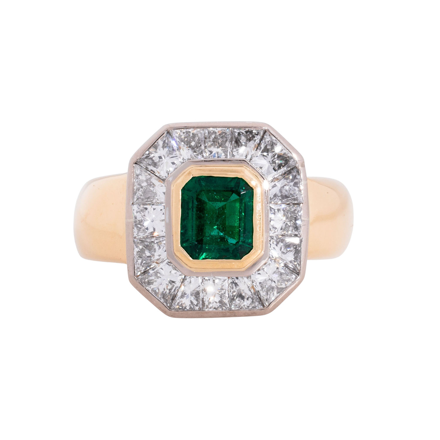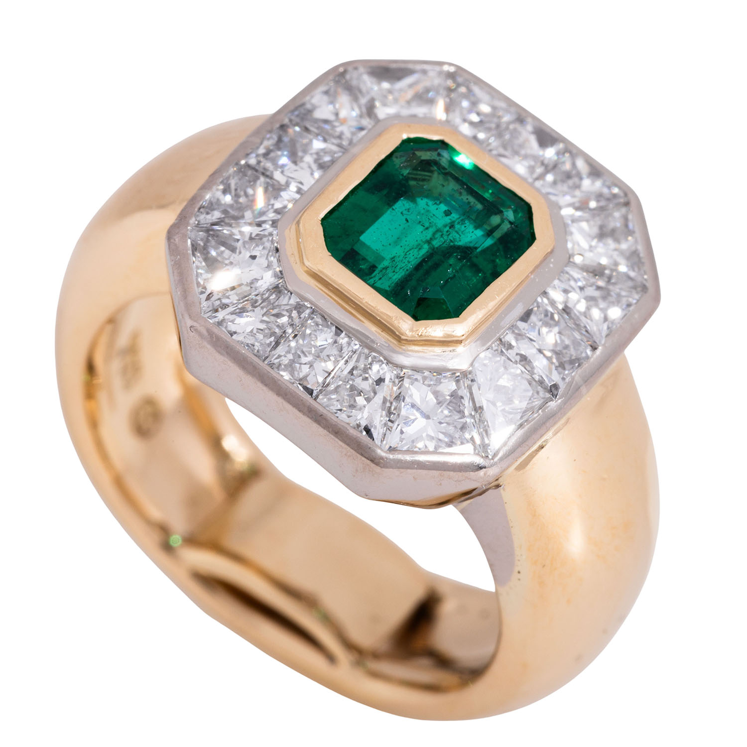 Ring with emerald, octogonal step cut, 0.88 ct (cert.), edges slightly chipped, 16 princess cut diamonds, 1.73 ct (cert.), RW (F-G)/IF (cert.), 18K yellow and white gold, 11.0 g, ring size 45, 2nd half of 20th century, minor signs of wear and a jeweller's certificate enclosed.