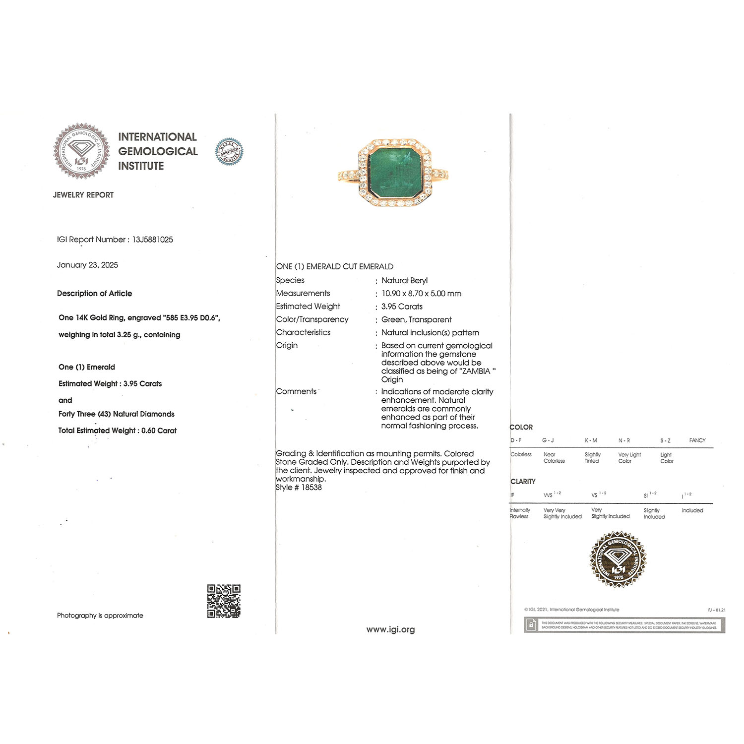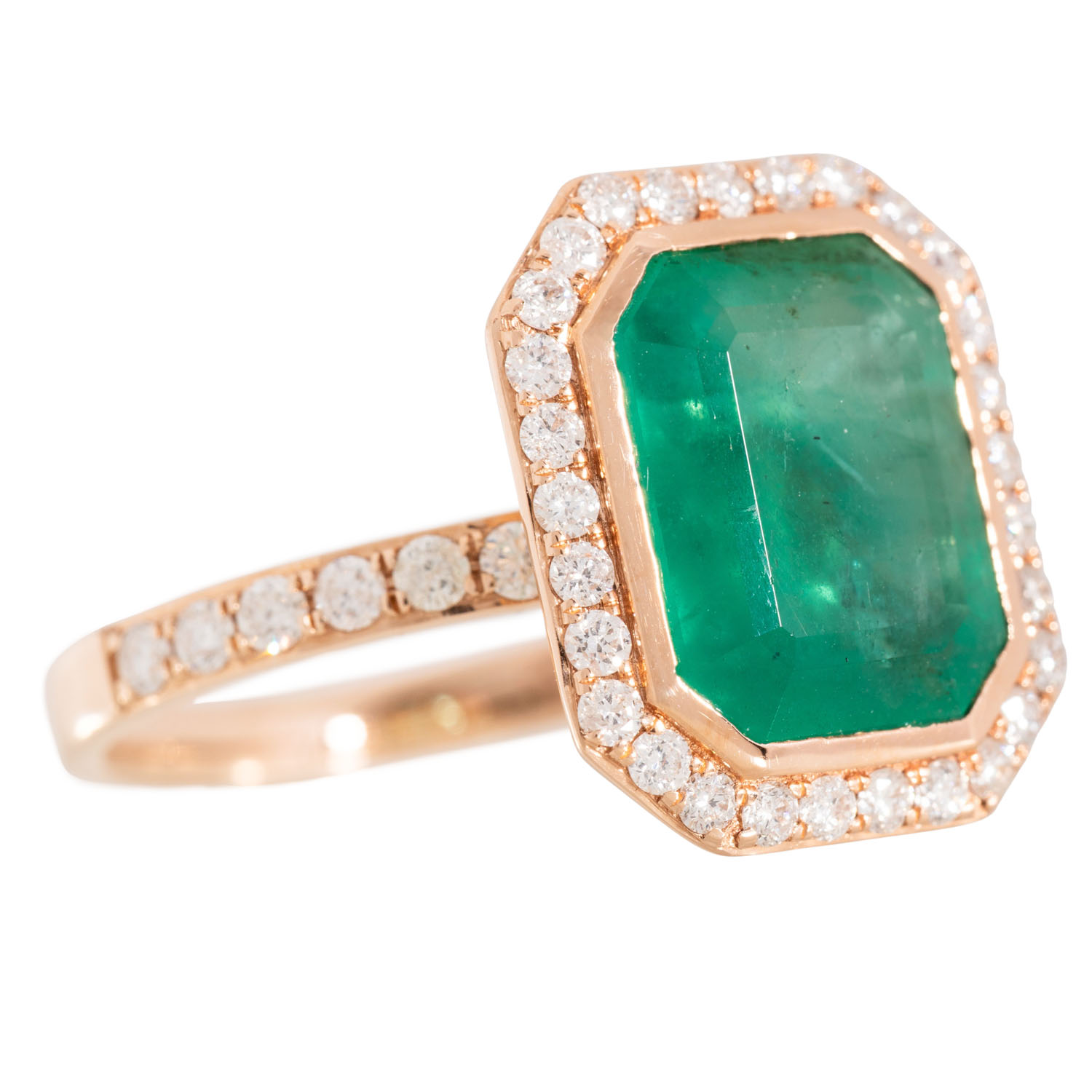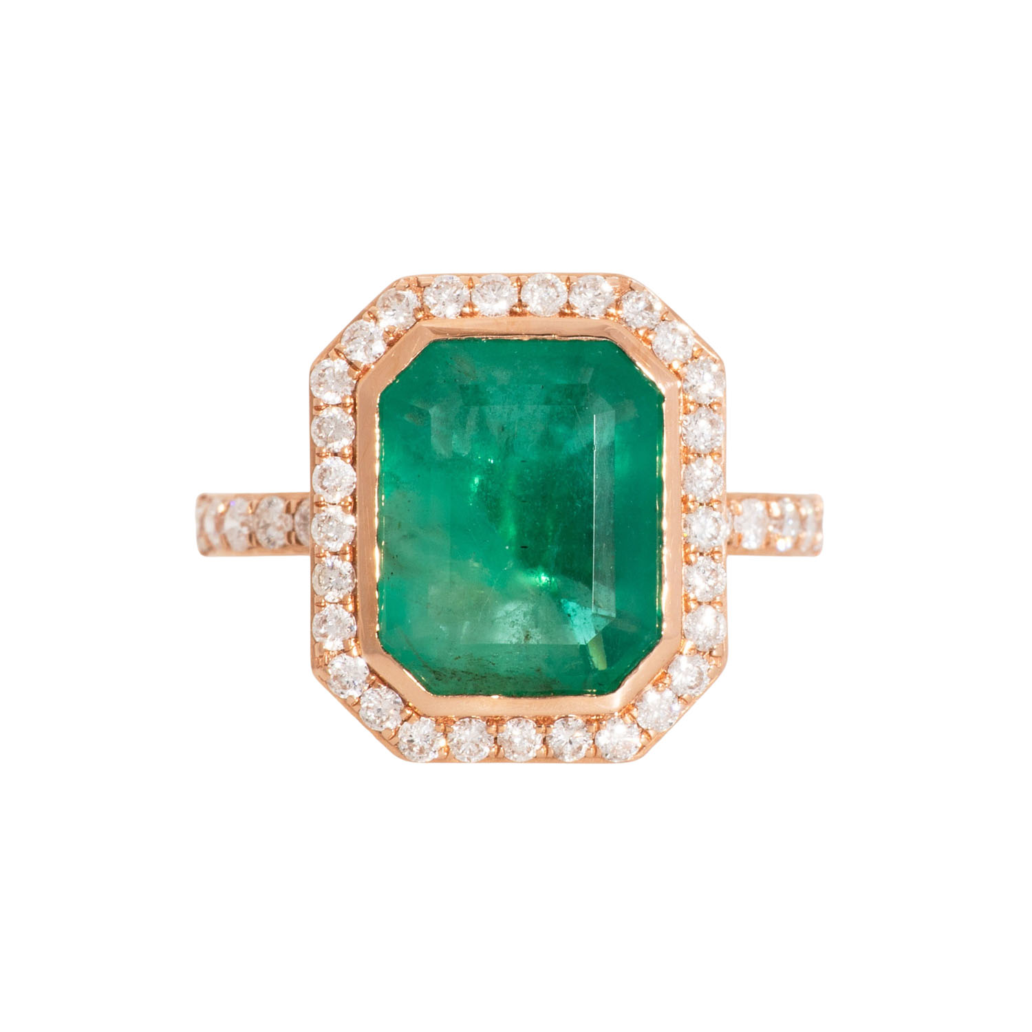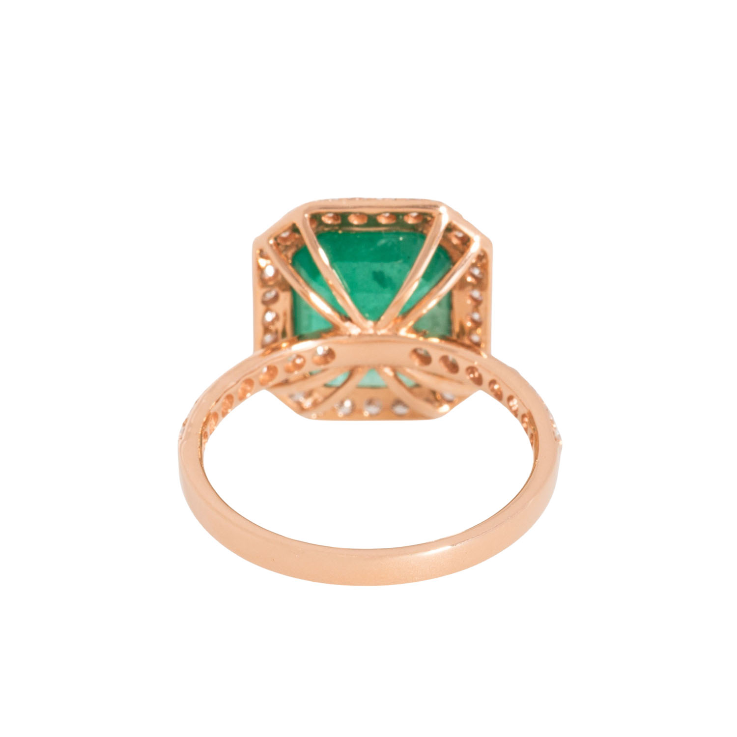 Ring with Zambia emerald of ca. 3.95 ct and small brilliant-cut diamonds totalling ca. 0.60 ct, good colour, low to medium clarity, 14K RG, 3.2 g, ring size 53, 21st century, mint condition, incl. IGI certificate (2025).