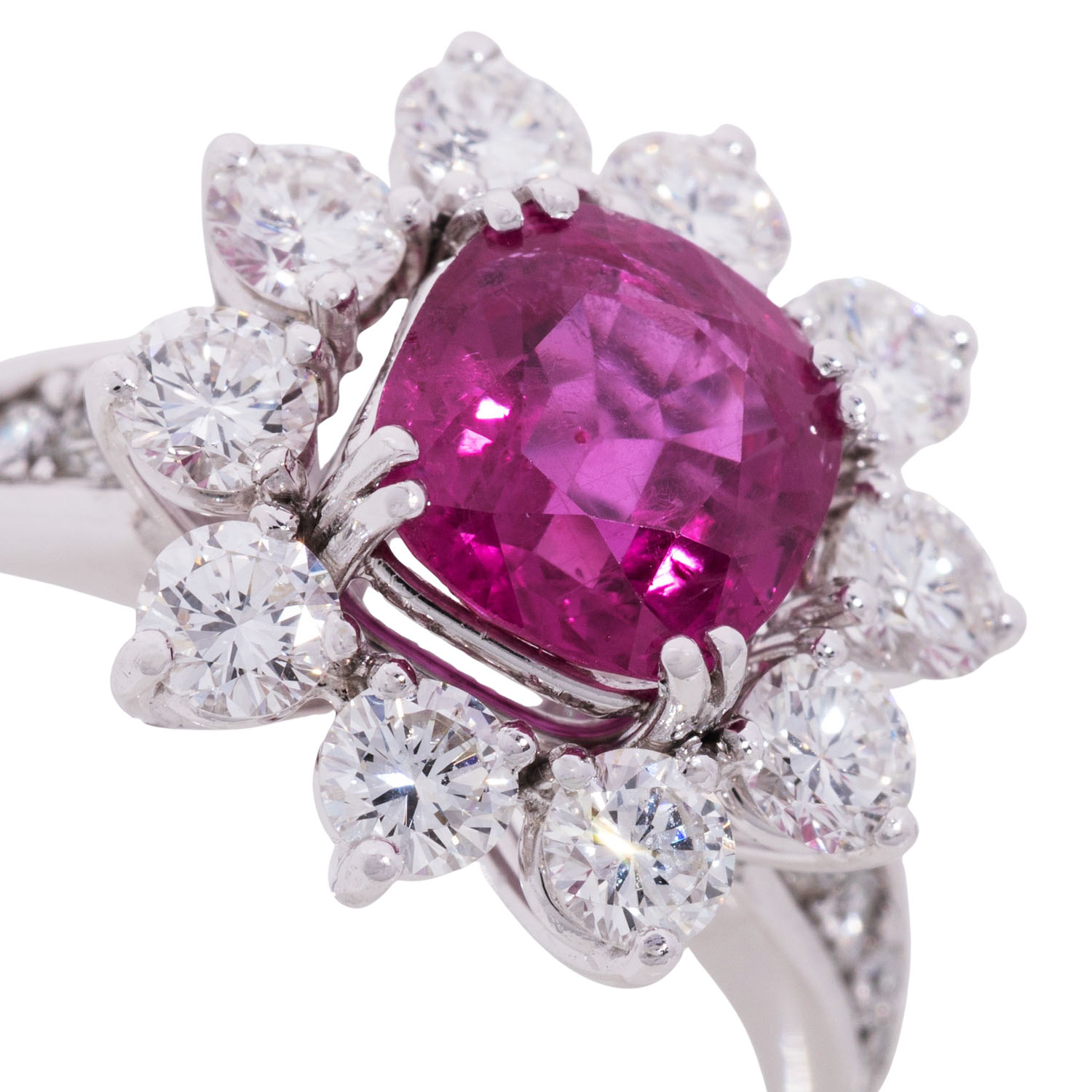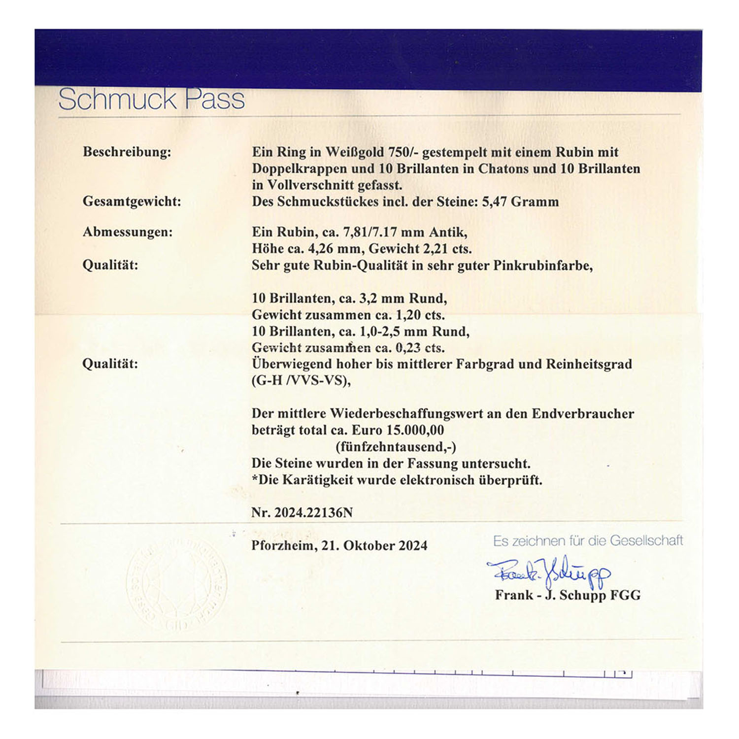 Ring with fine ruby ca. 2.21 ct, surrounded by 10 brilliant-cut diamonds totalling 1.2 ct, FW (F-G)/VVS-VS, WG 18K, 5.4 g, ring size 56, 21st century, mint condition. Certificate no.: 2024.22136N enclosed.