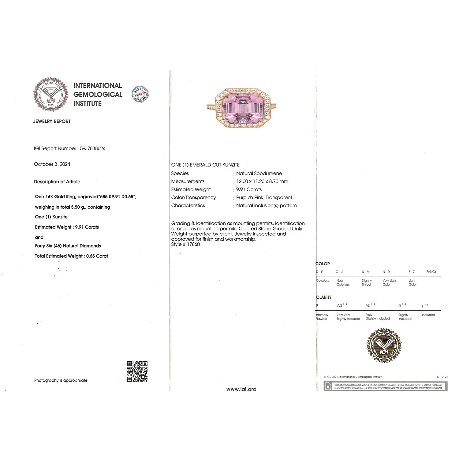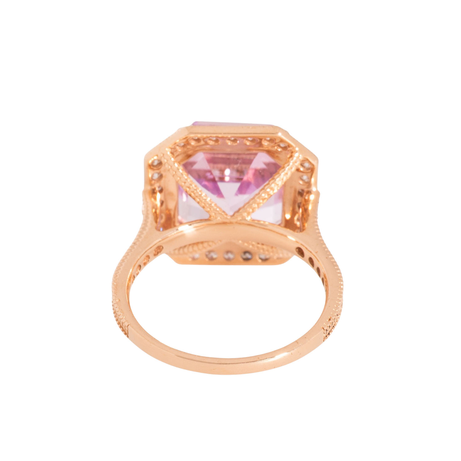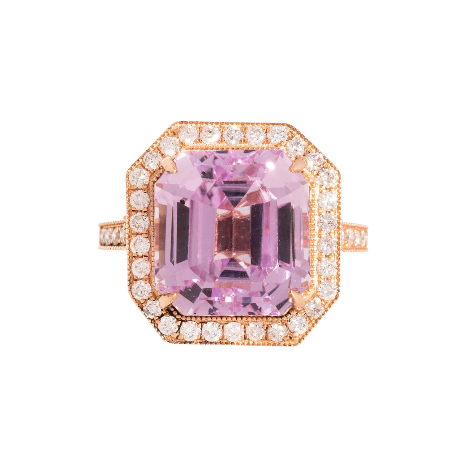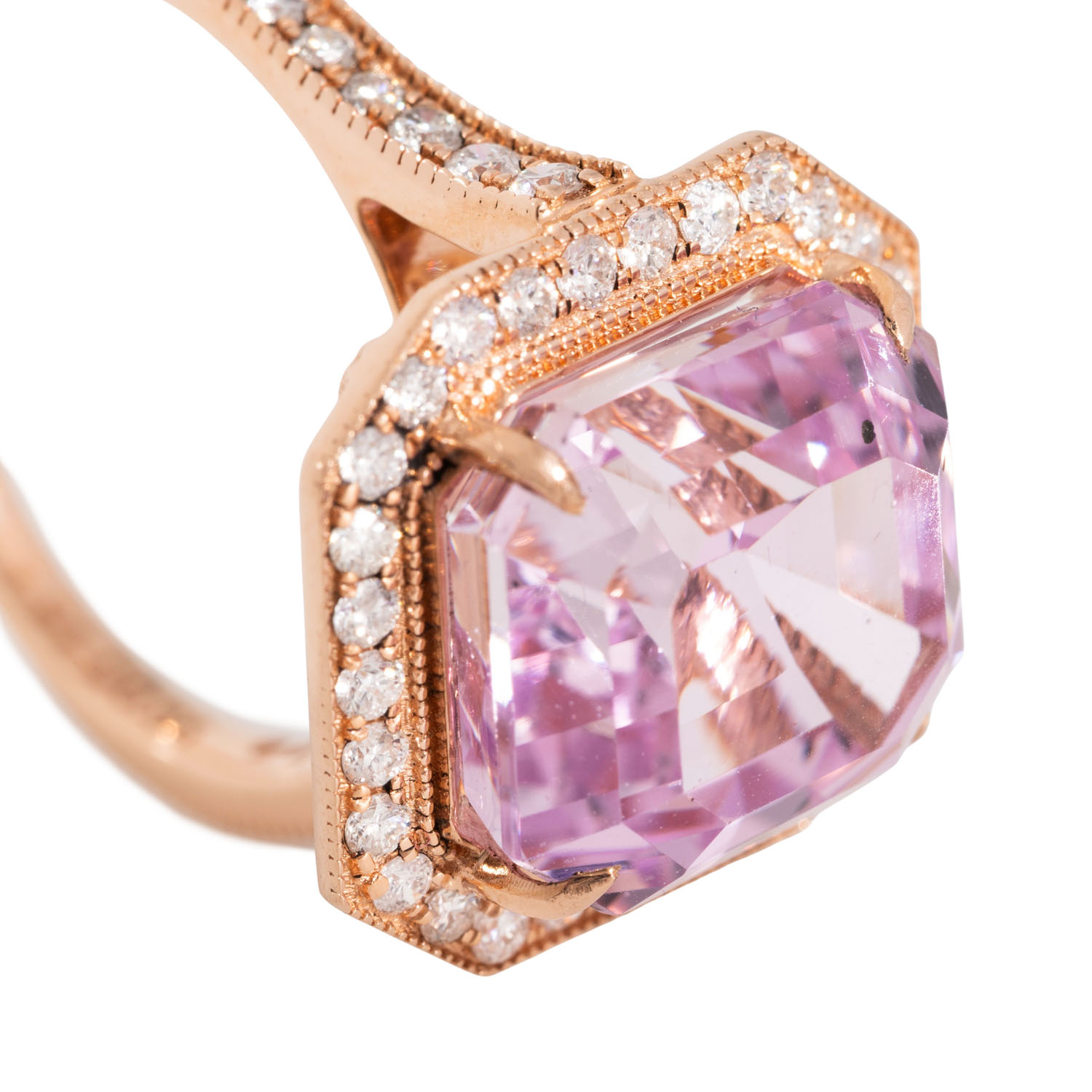 Ring with kunzite of ca. 9.91 ct and small brilliant-cut diamonds totalling ca. 0.65 ct, good colour, low to medium clarity, 14K RG, 5.4 g, 21. Jh., mint condition, incl. IGI certificate (2024).