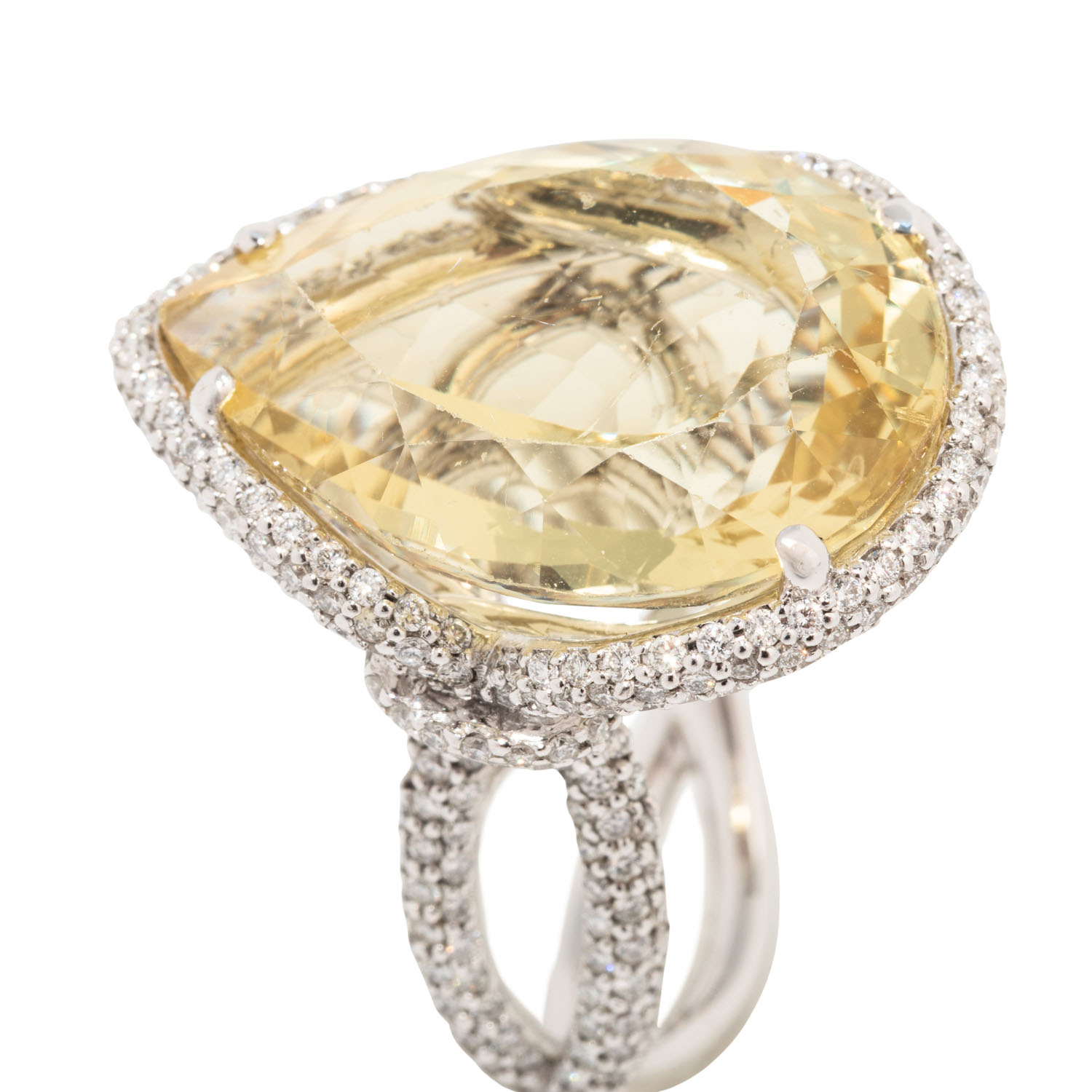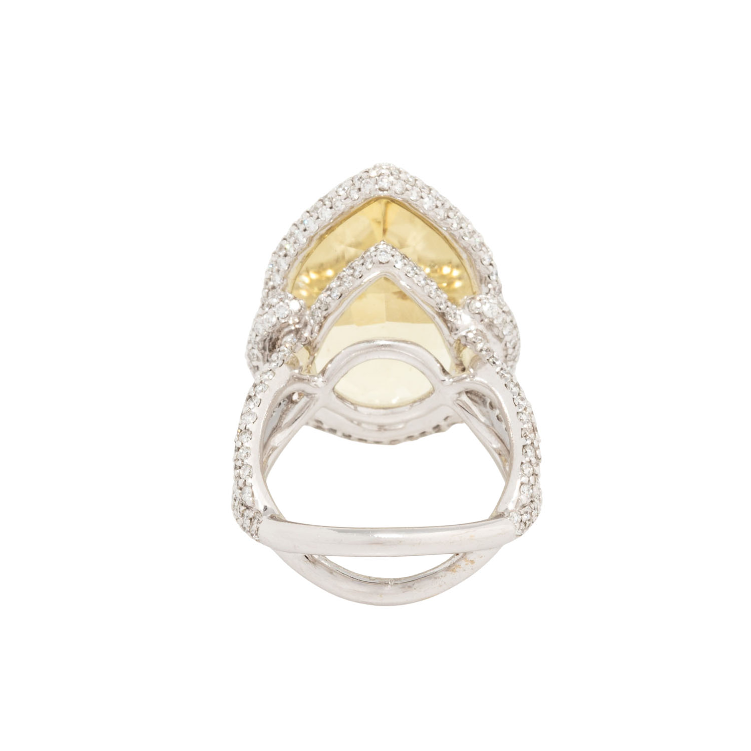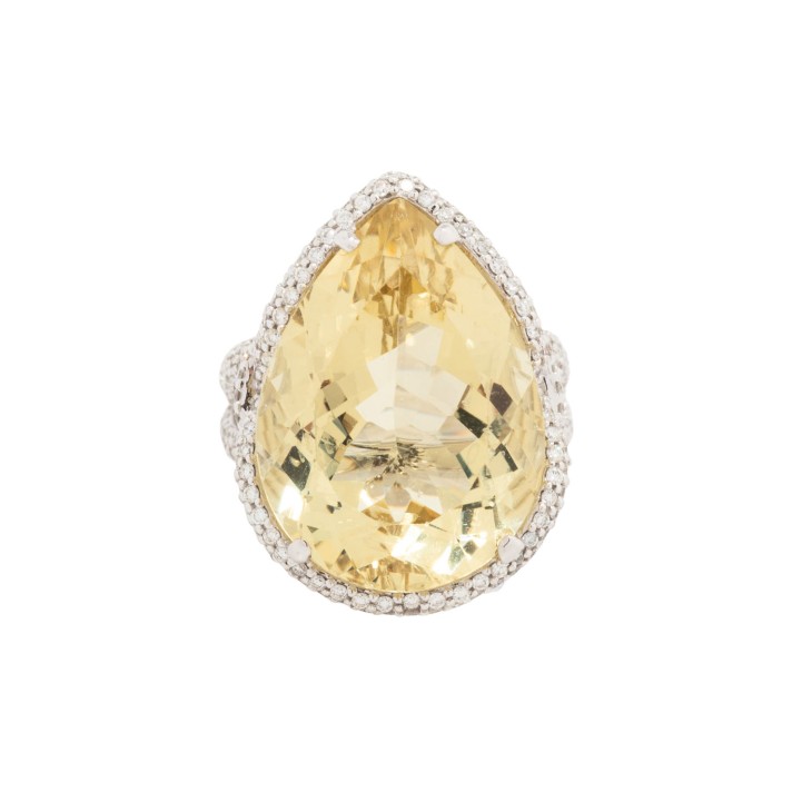 Ring with large pear-cut citrine and brilliant-cut diamonds totalling ca. 2 ct, good colour and clarity, 18K white gold, 15.8 g, ring size 52, 21st century, signs of wear, citrine distinct abraded.