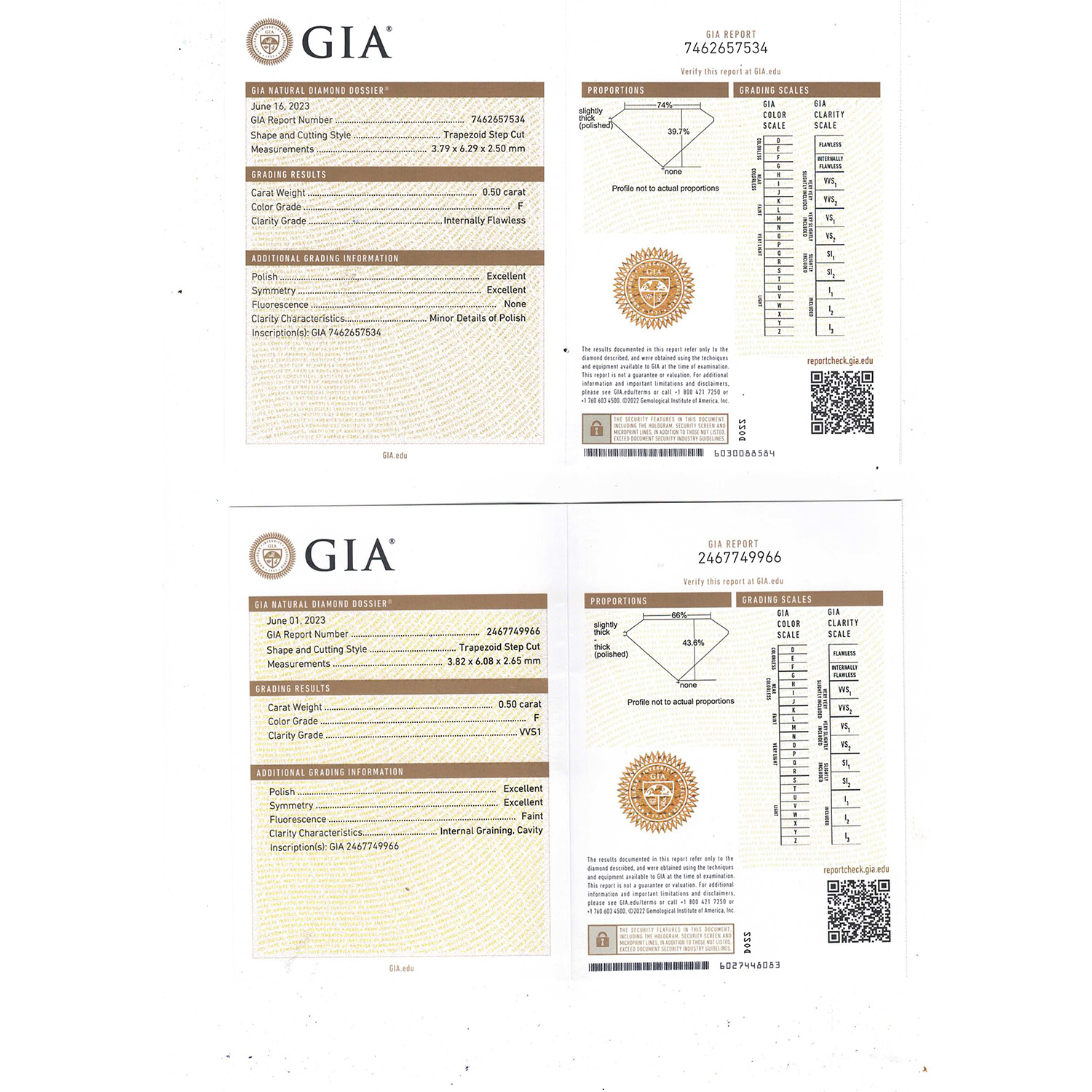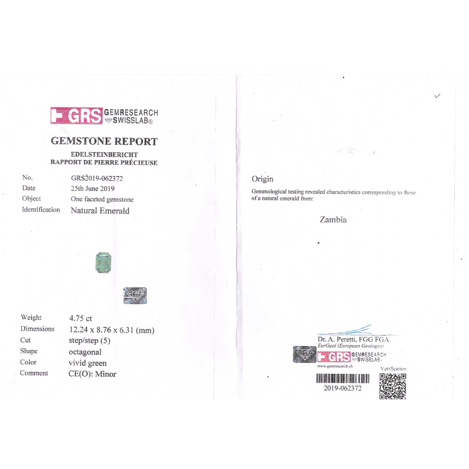 Ring with natural emerald 4.75 ct, Zambia, surrounded by diamonds in 2 trapezoid step cuts, total 1.0 ct, approx. RW (F)/IF - VVS, and 12 brilliant-cut diamonds with a total weight of 0.87 ct, approx. RW-WHITE (G-H)/VS-SI, platinum, 13.5 g, ring size 52, 21st century, mint condition. GRS report GRS2019-062372 and GIA certificates 7462657534 and 2467749966 enclosed.