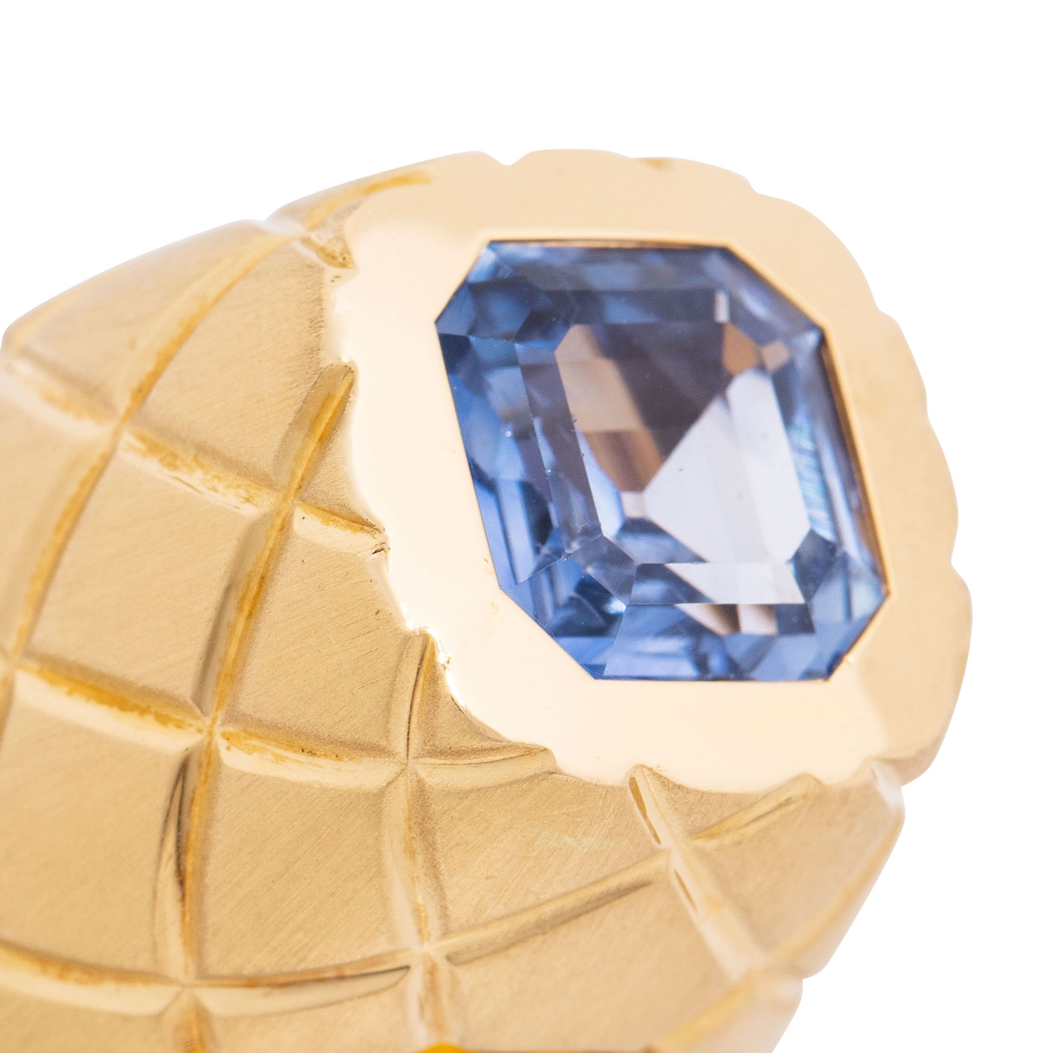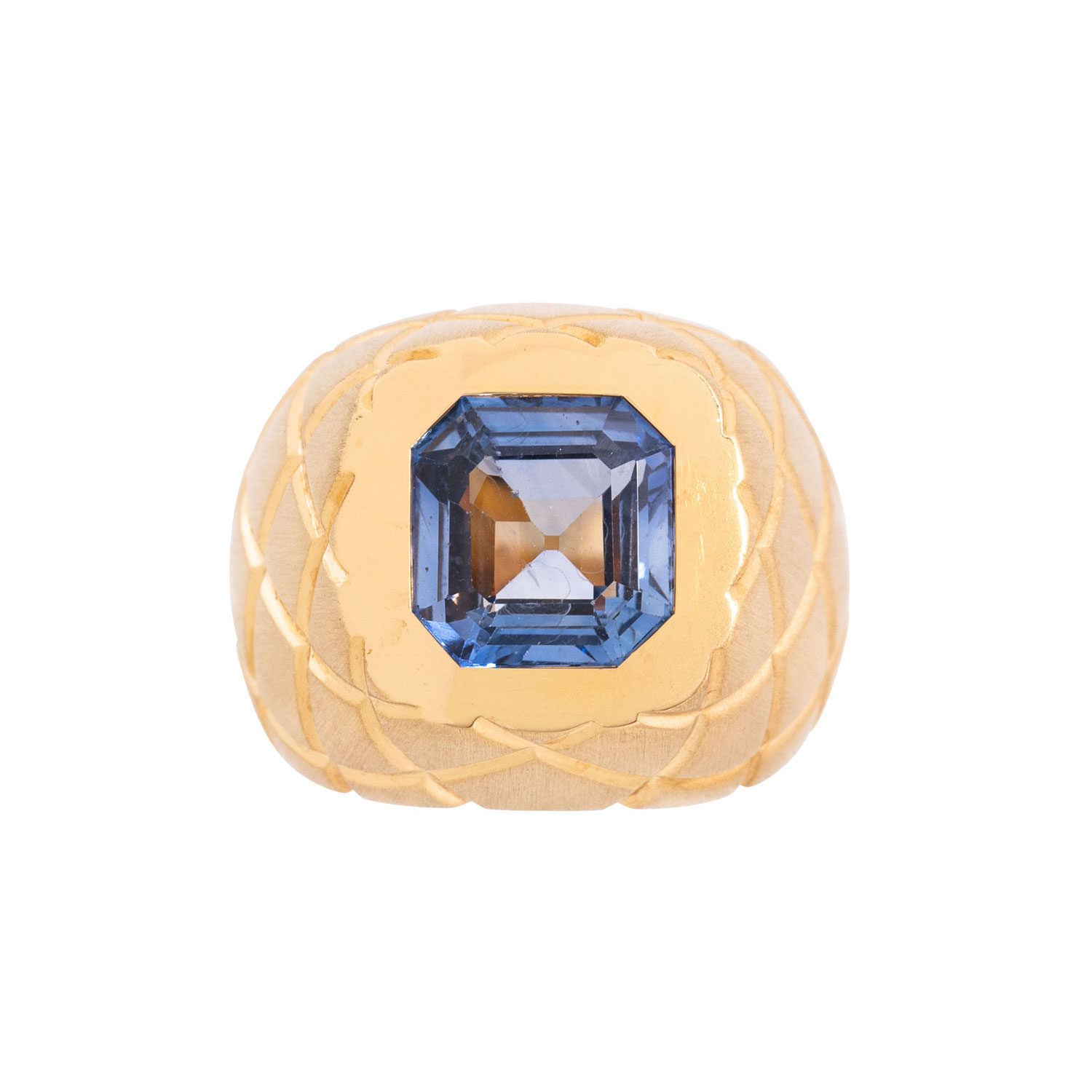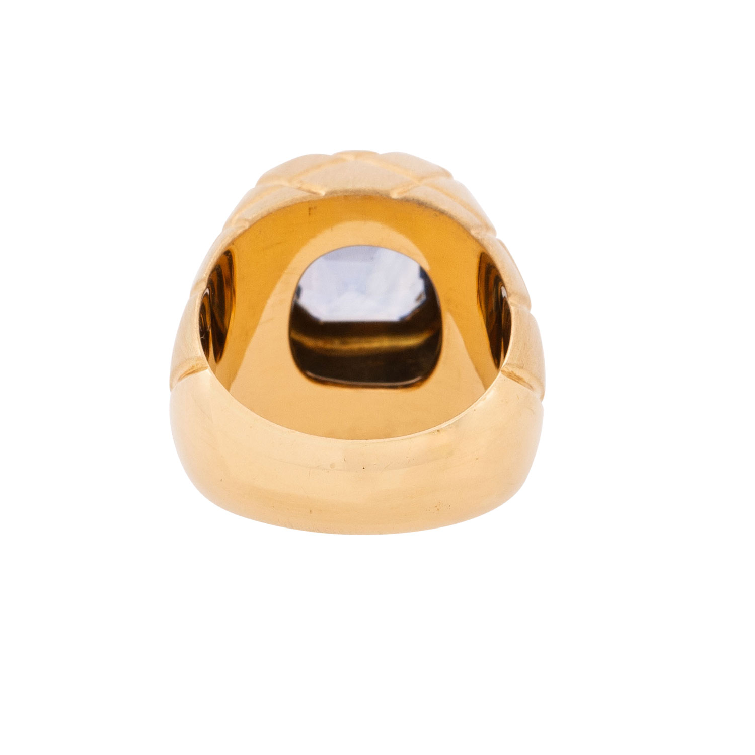 Ring with octagonal step-cut sapphire ca. 5 ct, min. abraded, 18K yellow gold, 27.3 g, ring size 56, ring head crafted with a rhombus pattern, 2nd half of 20th century, signs of wear, unknown maker's mark, solid quality.