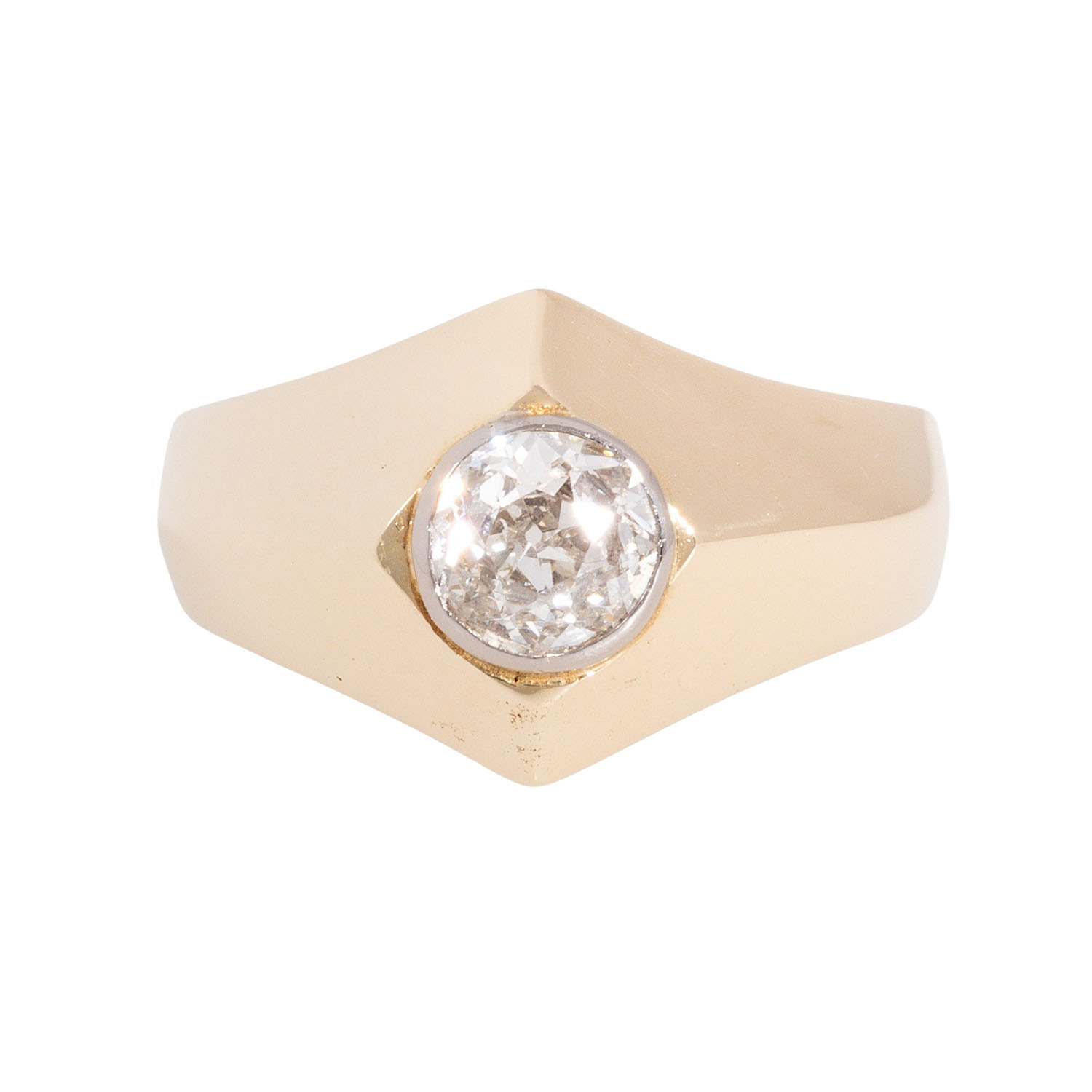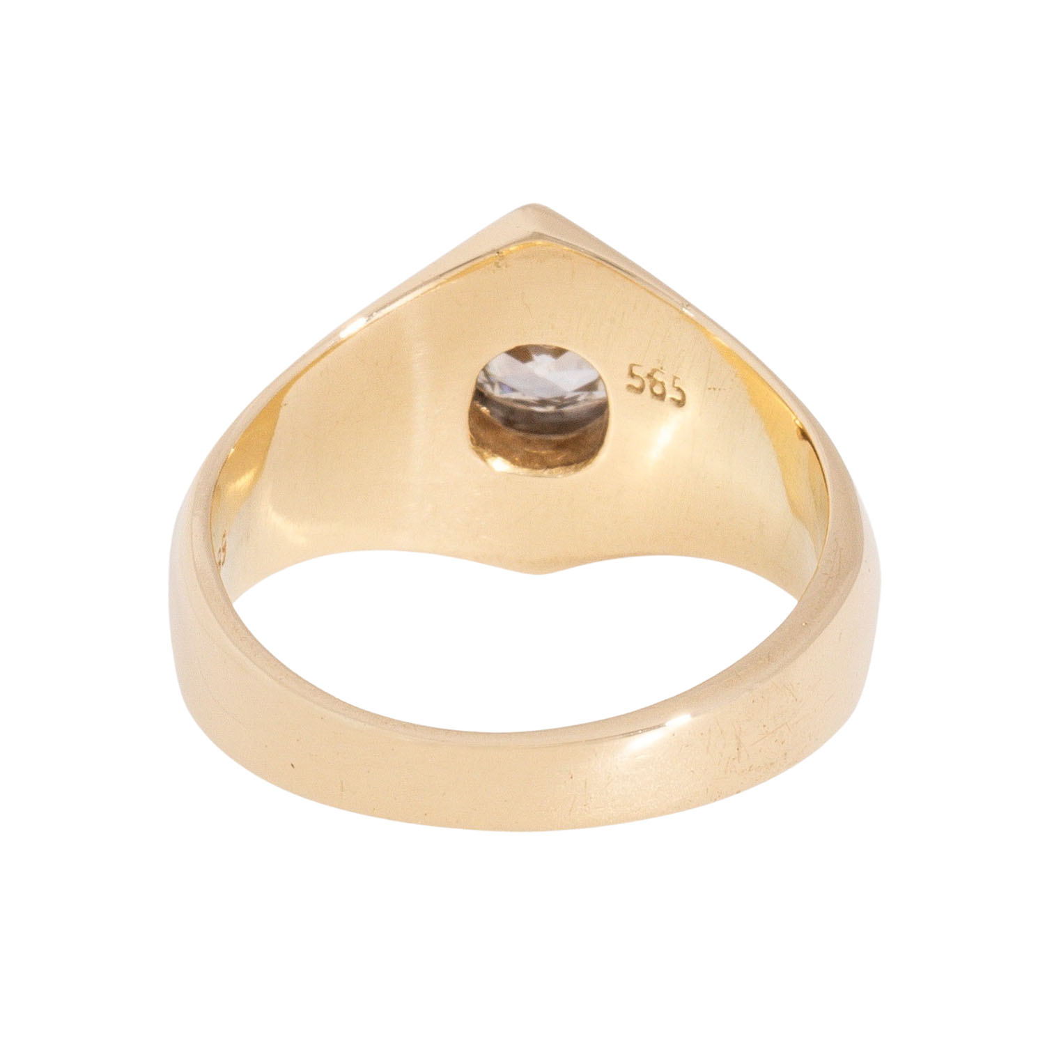 Ring with old-european-cut diamond of ca. 0.60 ct, TIN (M) /PI, YG /WG 14K, 10.2 g, ring size 58, 20th century, good condition. Handcrafted.