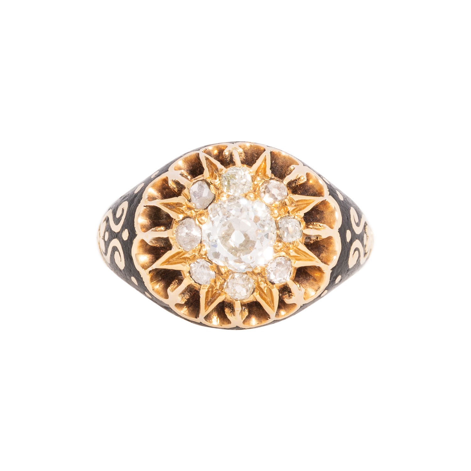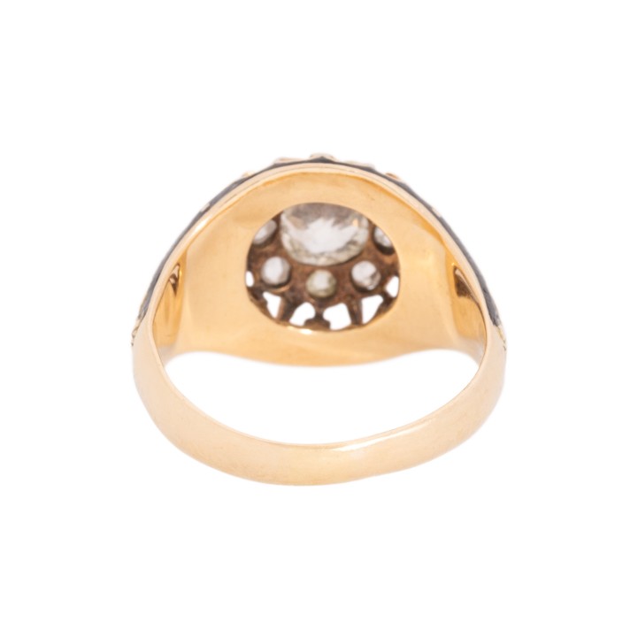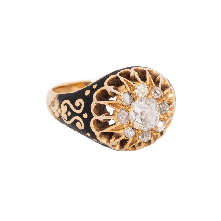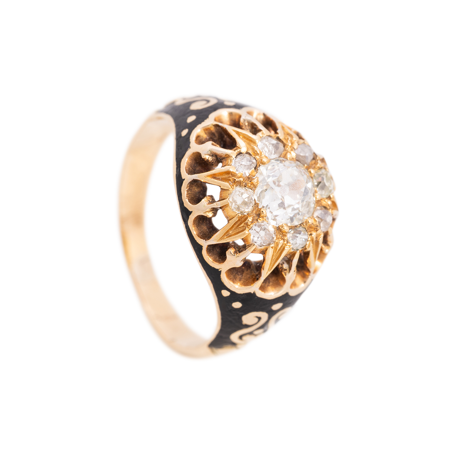 Ring with old-european-cut diamonds totalling ca. 0.9 ct, of which centred ca. 0.5 ct, ca. TIN (M)/VS, black enamel, 14K yellow gold, 6.2 g, ring size 53, 20th century, signs of wear, enamel chipped.