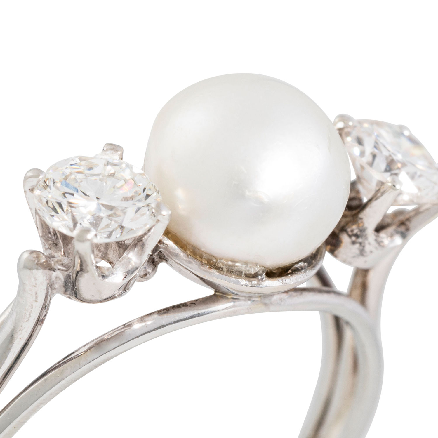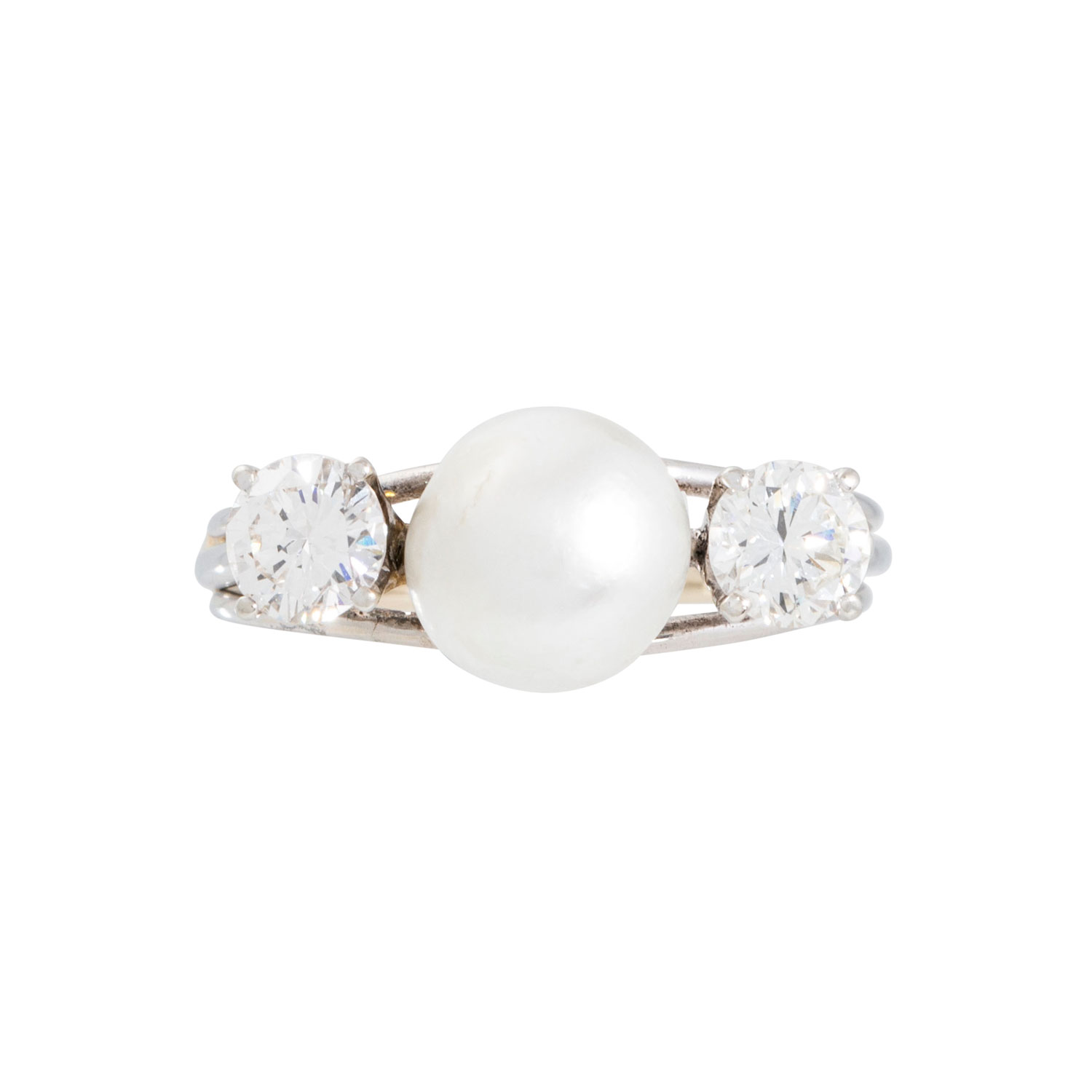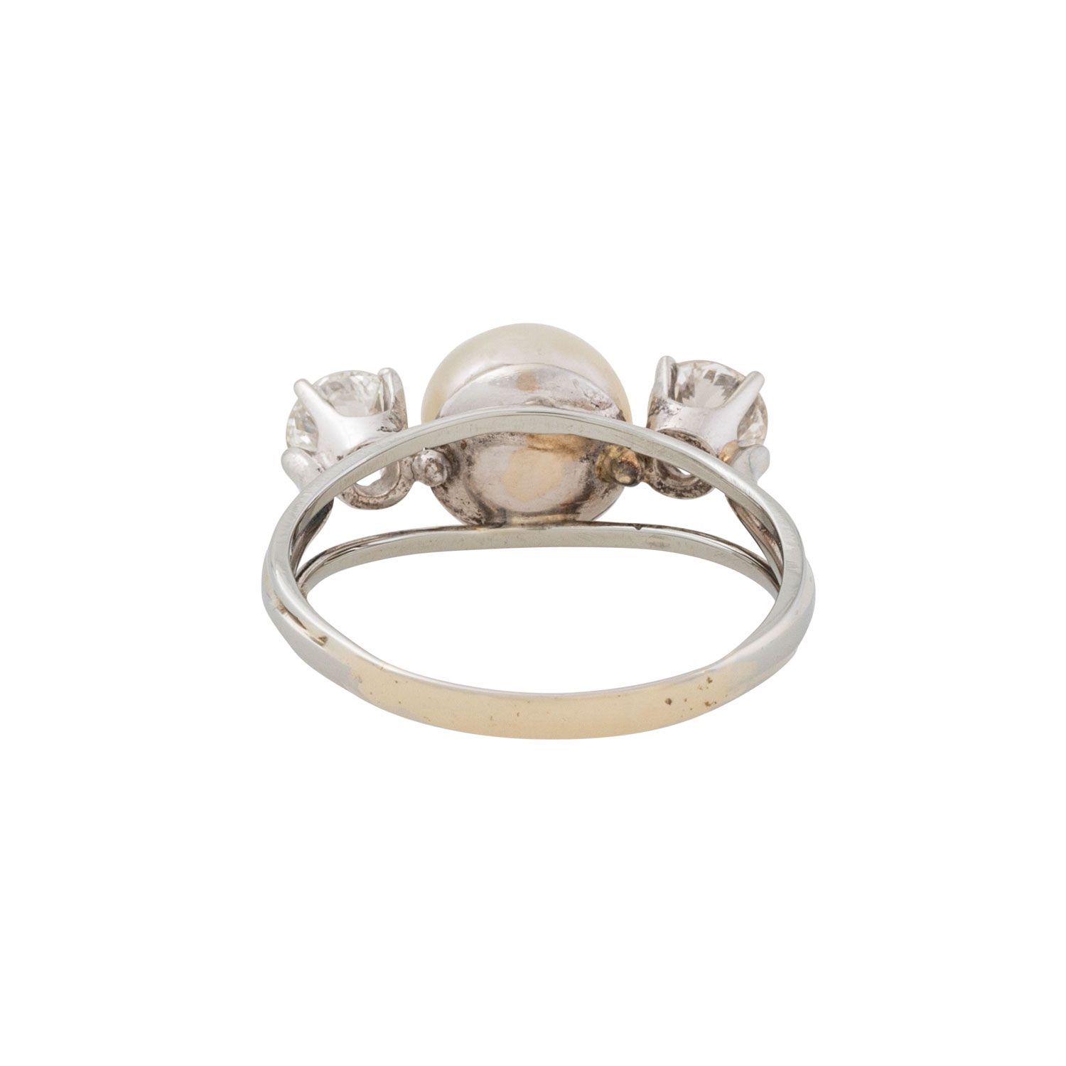 Ring with oriental pearl and brilliant-cut diamonds totalling ca. 0.90 ct, ca. WHITE (H)/VS-SI, 18K WG, 4 gr, ring size 59, 2nd half 20th century, signs of wear, rhodium plating slightly abraded.