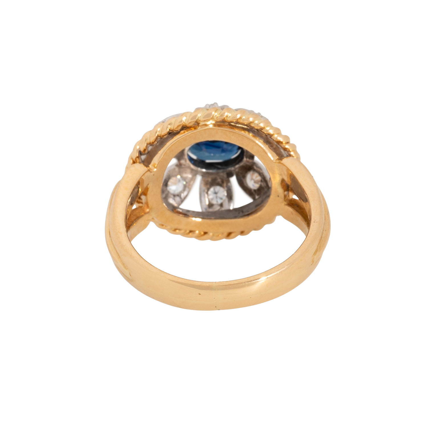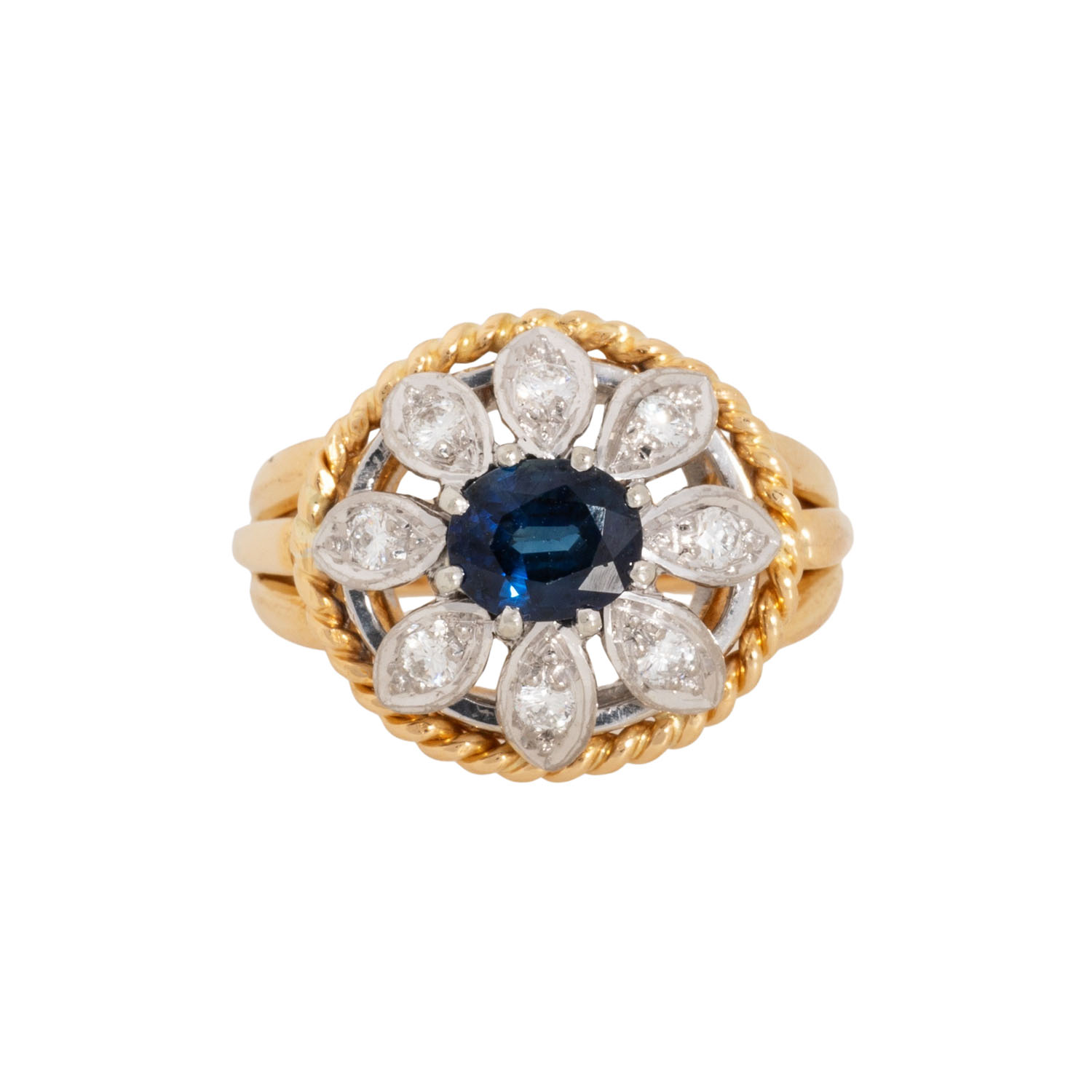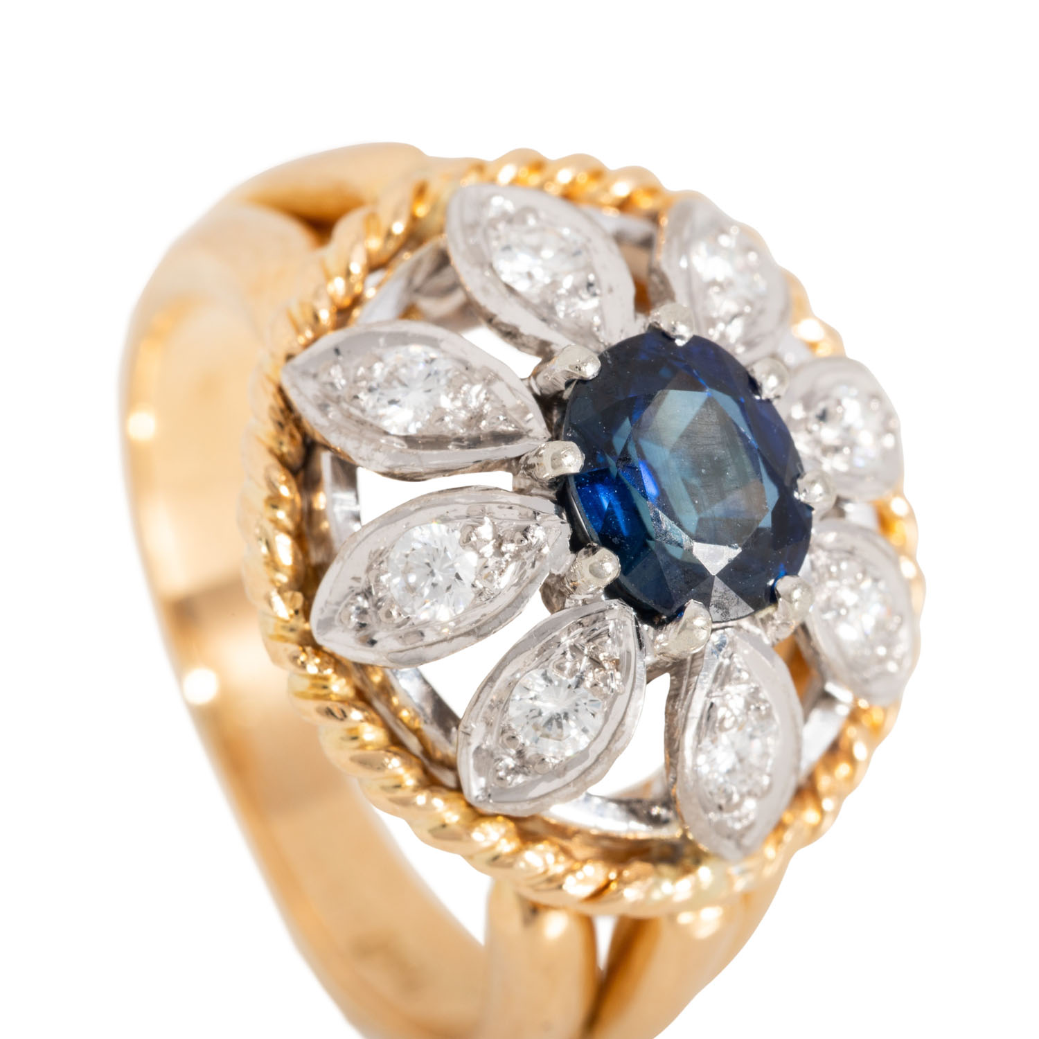Ring with oval faceted sapphire, ap. 5.5 x 6.6 mm, surrounded by 8 brilliant cut diamonds, totalling ap. 0.24 ct, good colour and clarity, 18K yellow and white gold, 9.6 g, ring size 56, late 20th century, minor signs of wear.