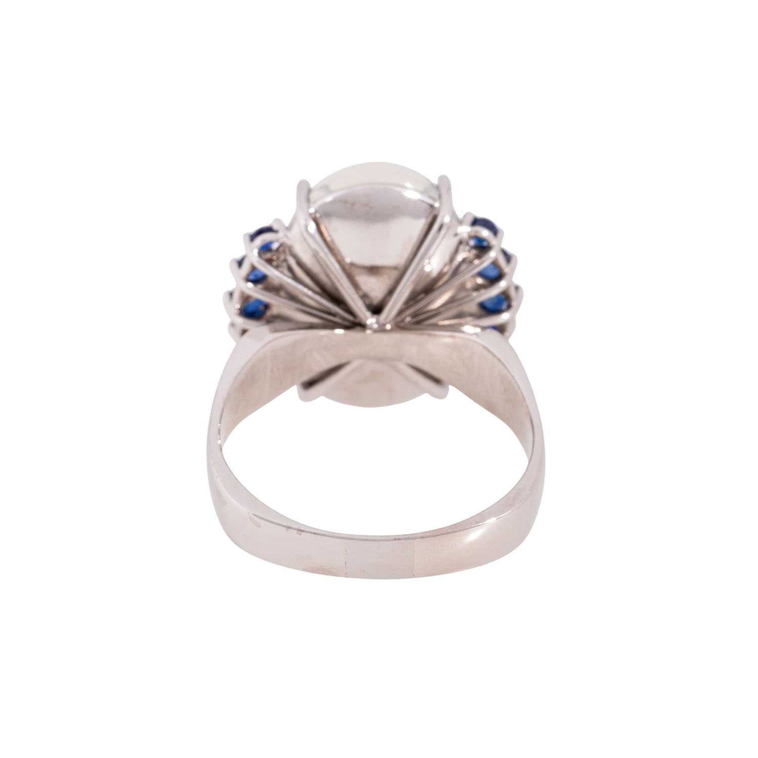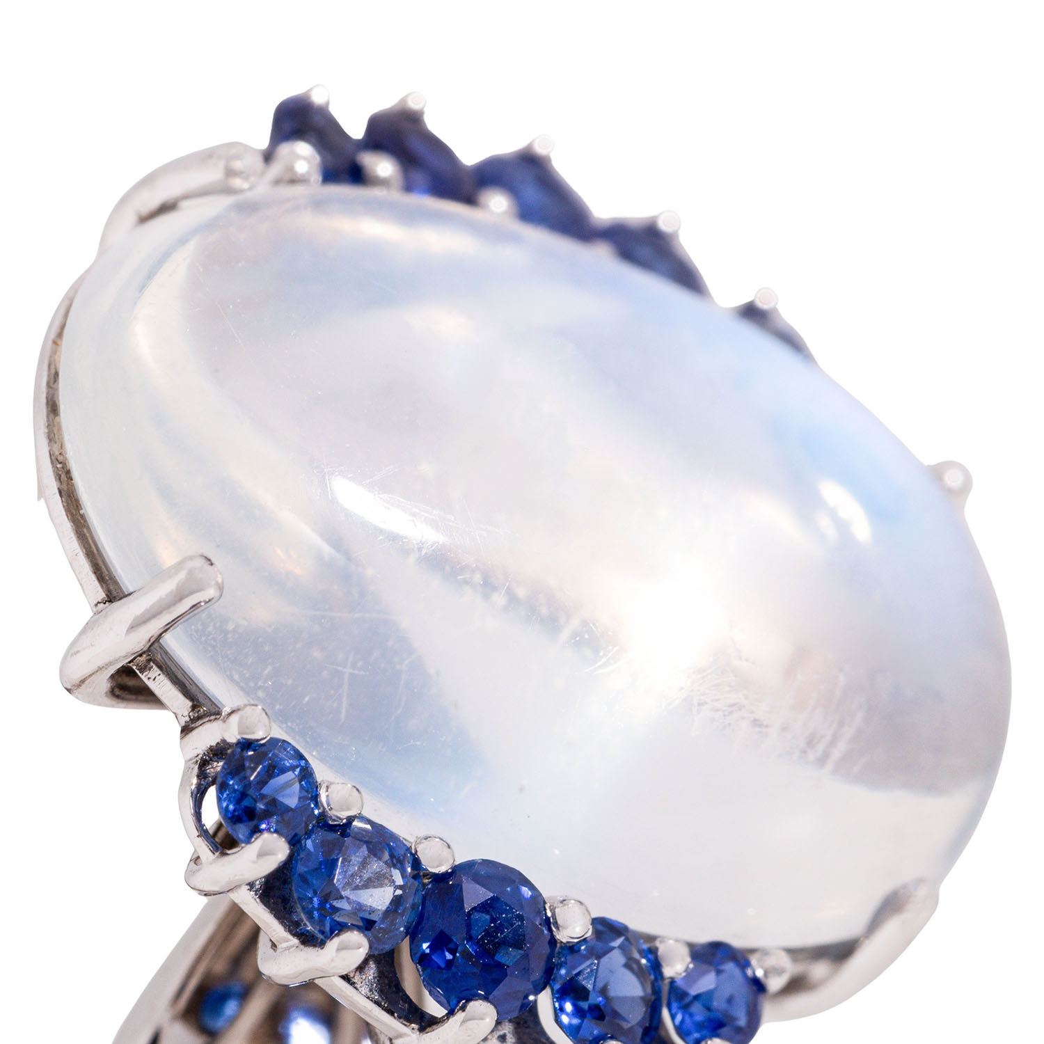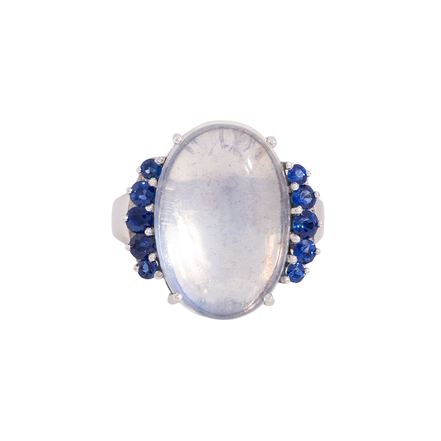 Ring with oval moonstones flanked by small round faceted sapphires, 18K white gold, 11.2 g, ring size 61 (enlarged), ca. 1970s, moonstone slightly abraded, otherwise good condition, marked 'AH' (Adam Hörner Schwäbisch Gmünd).
