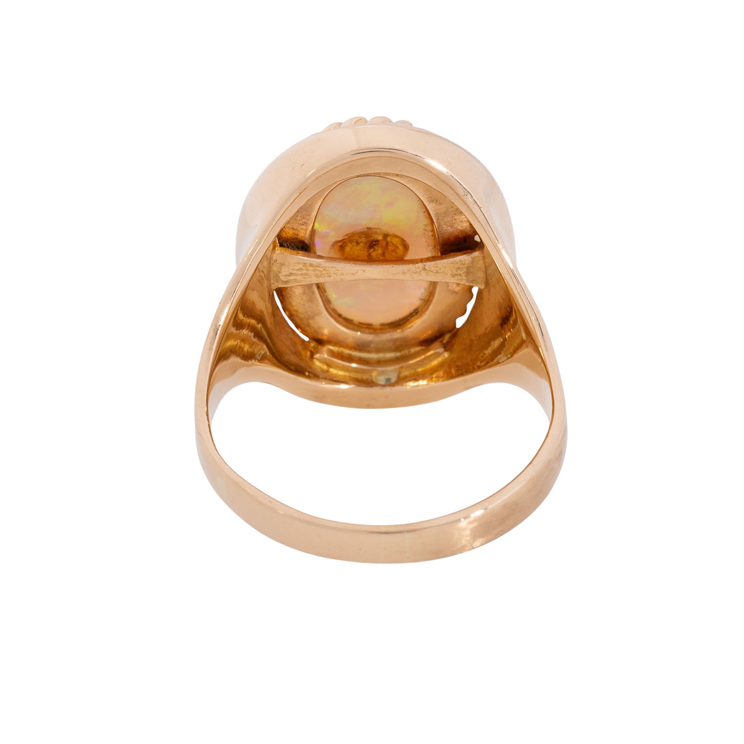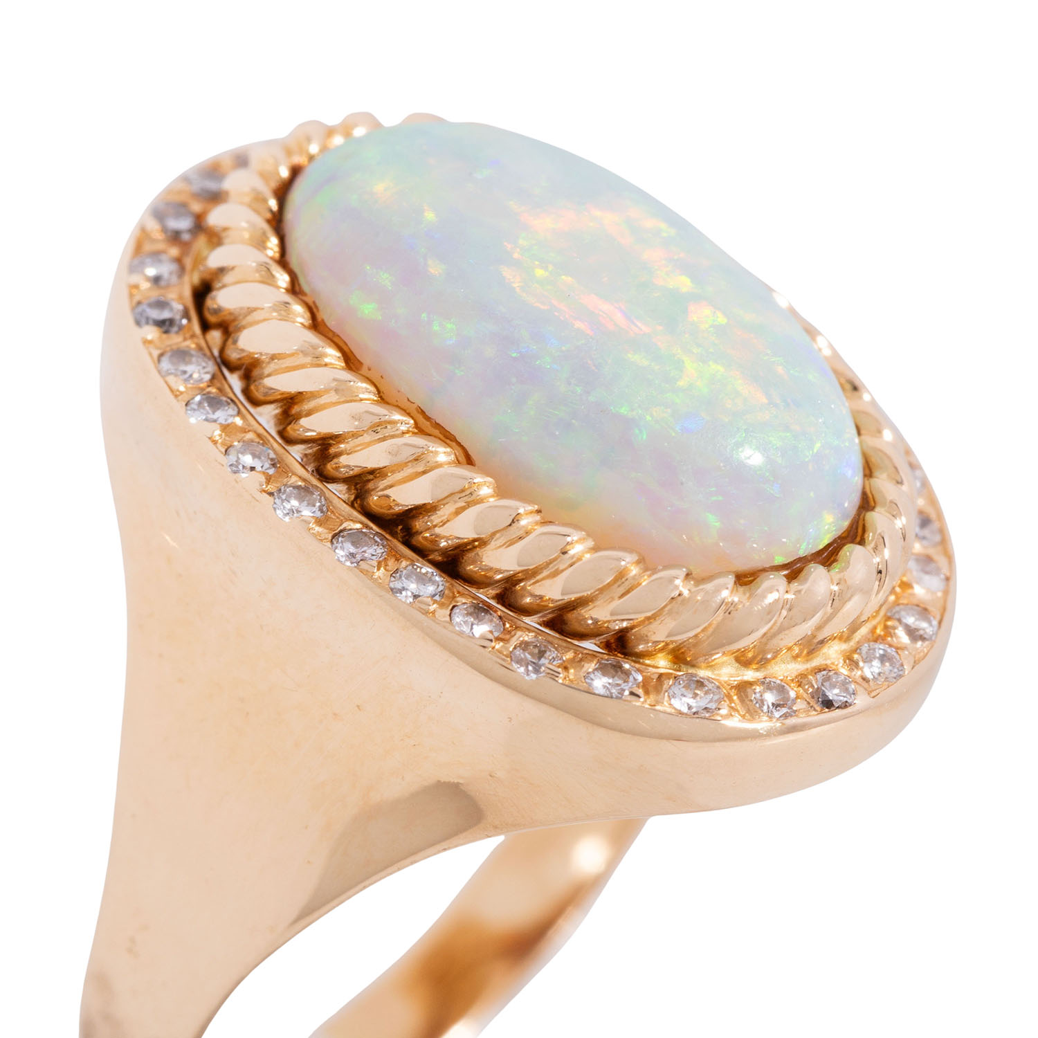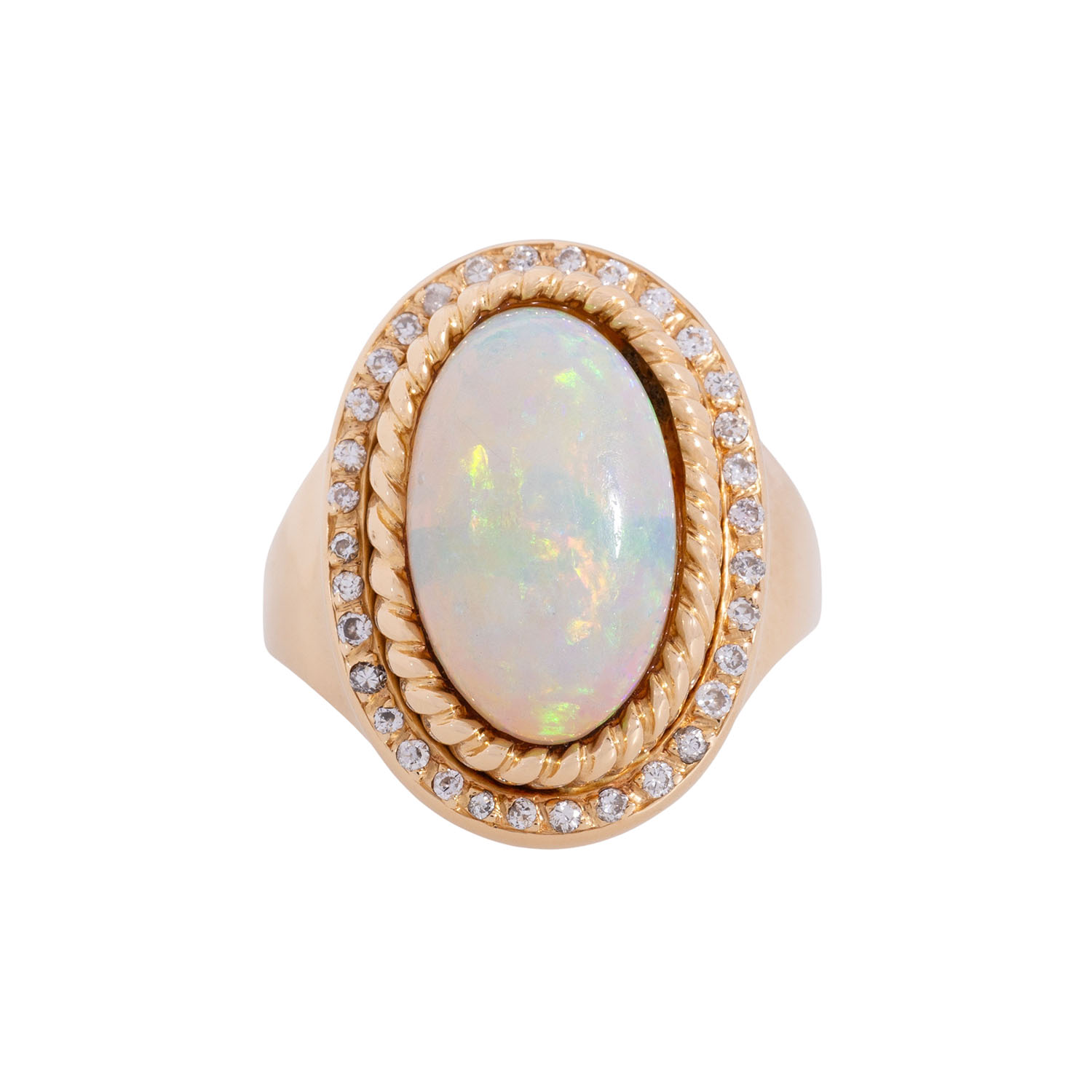 Ring with oval cabochon-cut opal surrounded by corded wire and small diamonds of brilliant- and old-european-cut, totall. c. 0.3 ct, good to low colour and clarity, YG 18K, 11.1 g, RW: 56, 2nd half of 20th century, signs of wear, diamonds partly chipped, opal abraded.