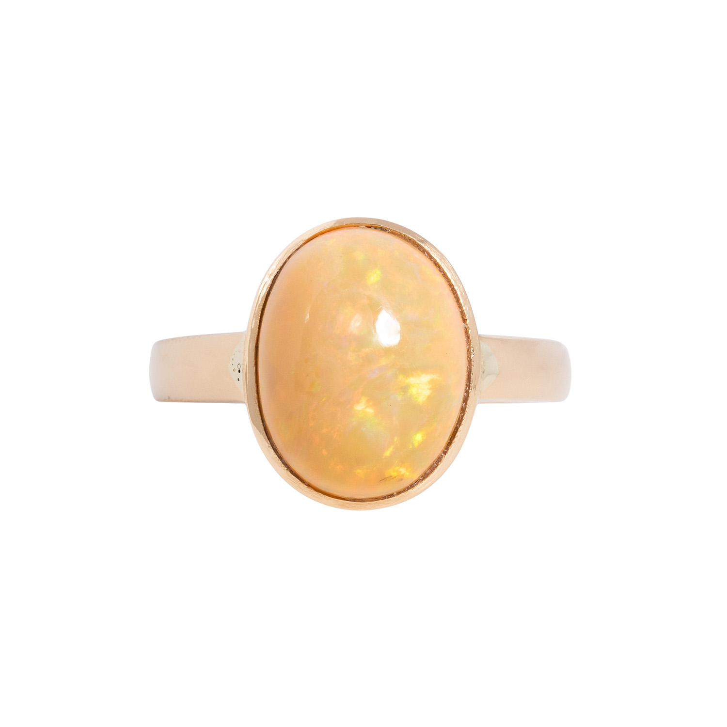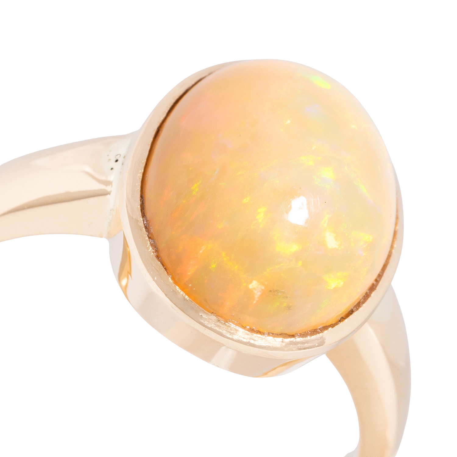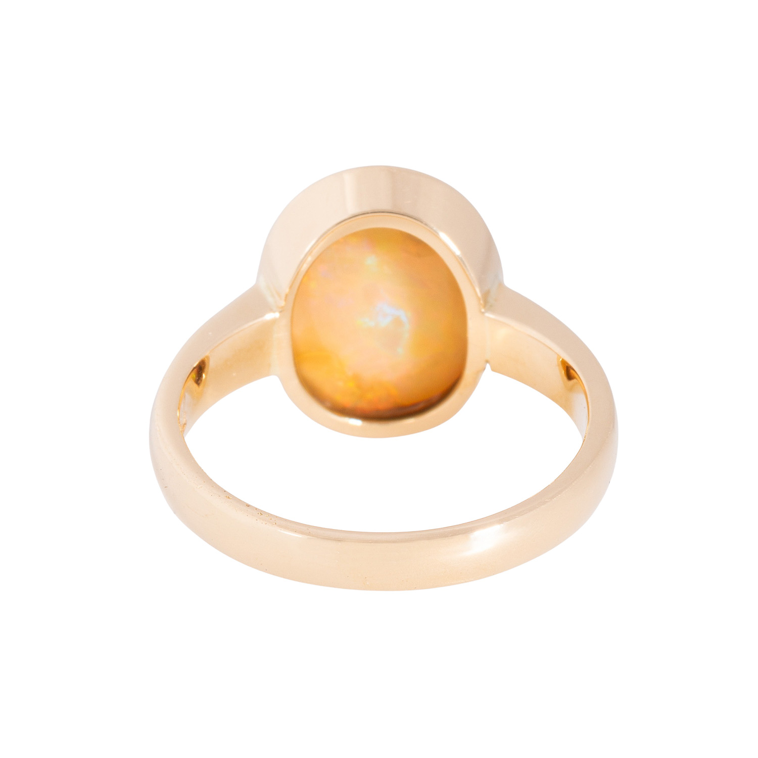 Ring with oval, cabochon-cut opal (13 x 10 mm), yellow-orange-greenish play-of-colour, YG 18K, 5.6 g, RW: 56, 20th/21st century, good condition, solid workmanship.