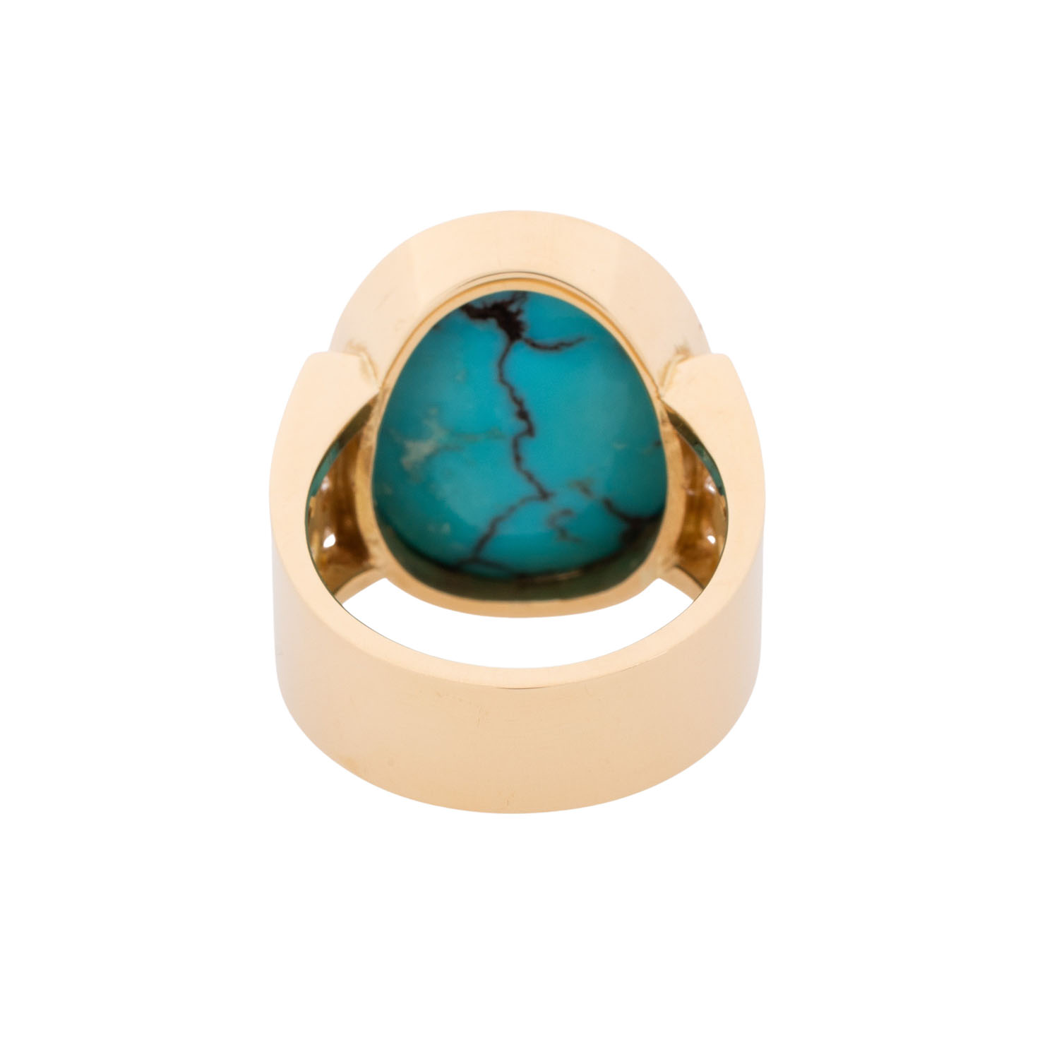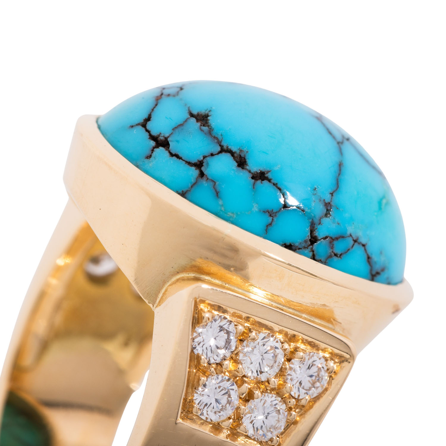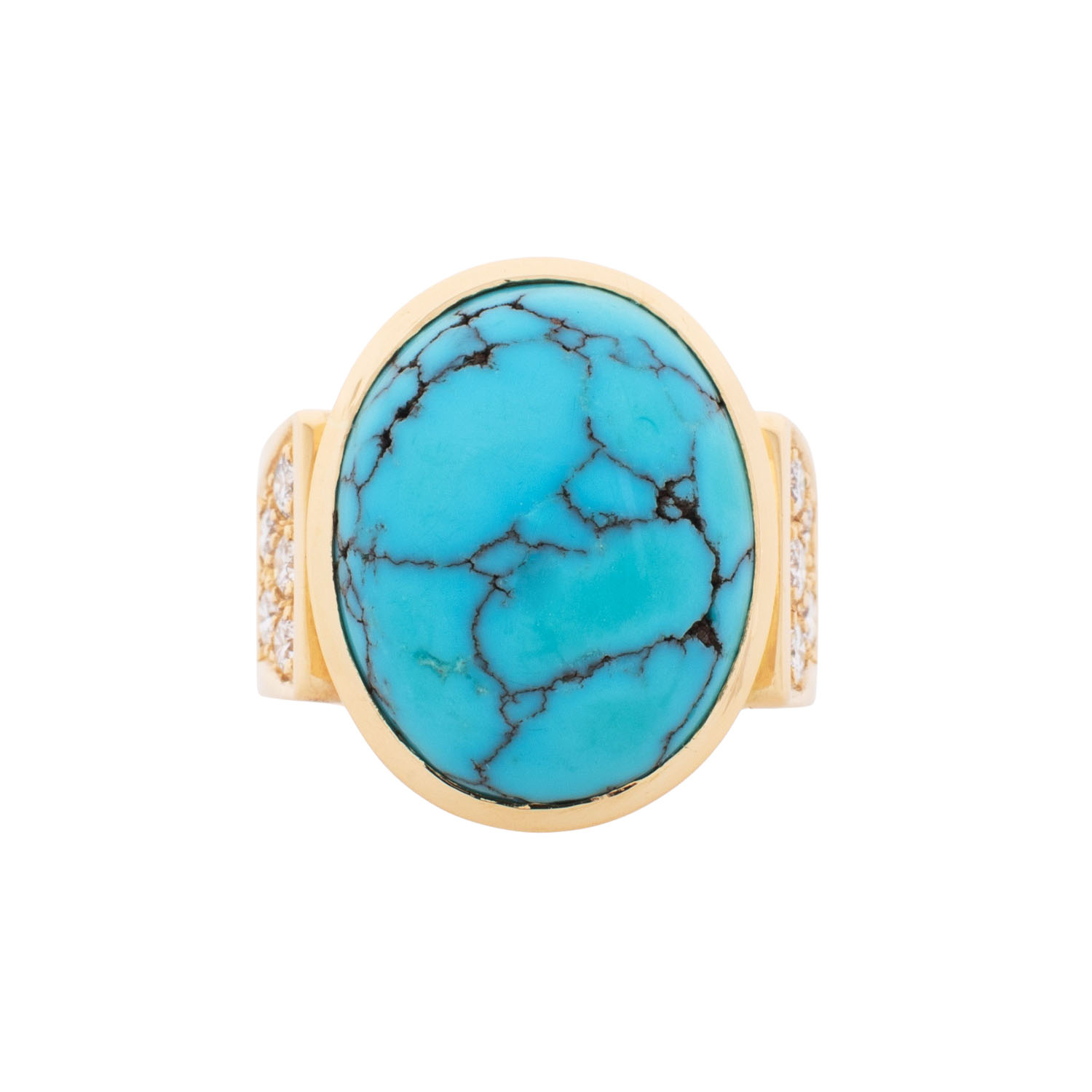 Ring with oval turquoise, slightly discoloured and 10 brilliant-cut diamonds totalling ca. 0.6 ct, good colour and clarity, 18K yellow gold, 16.7 g, ring size 54, late 20th century, minor signs of wear, solid workmanship.