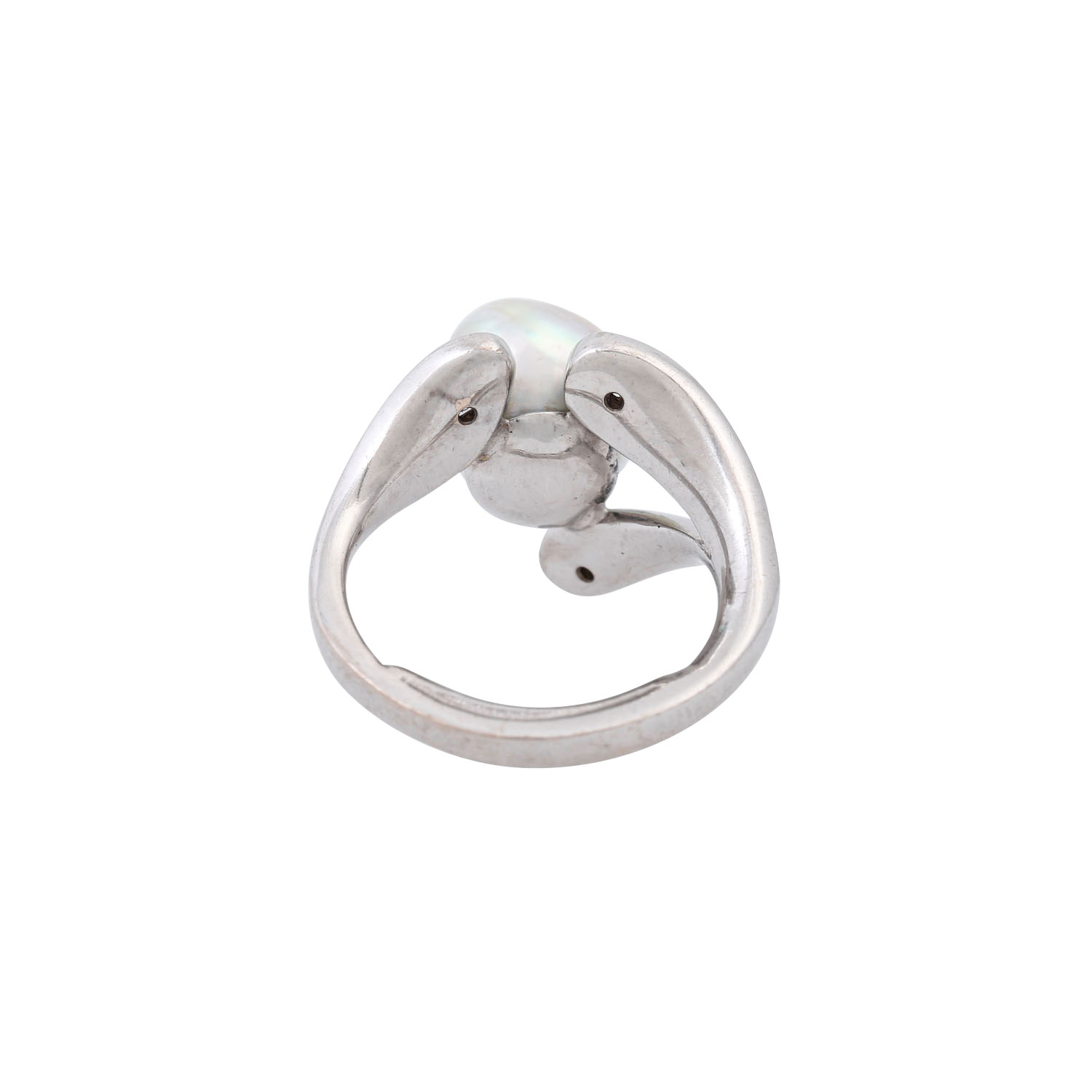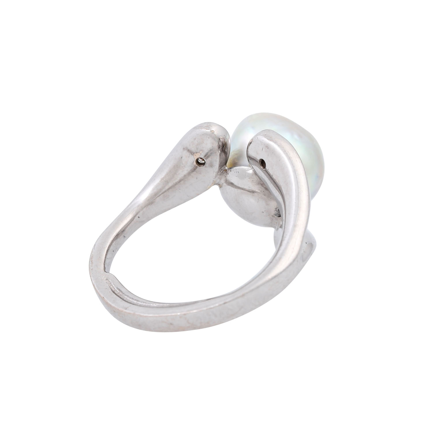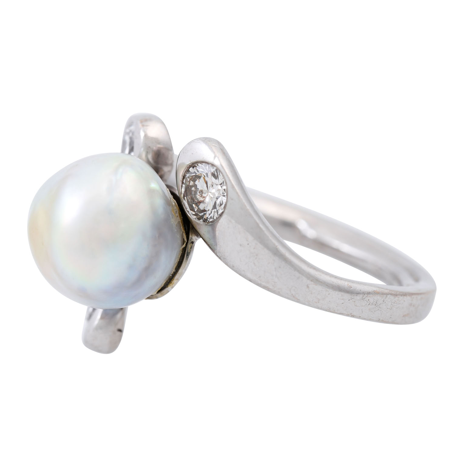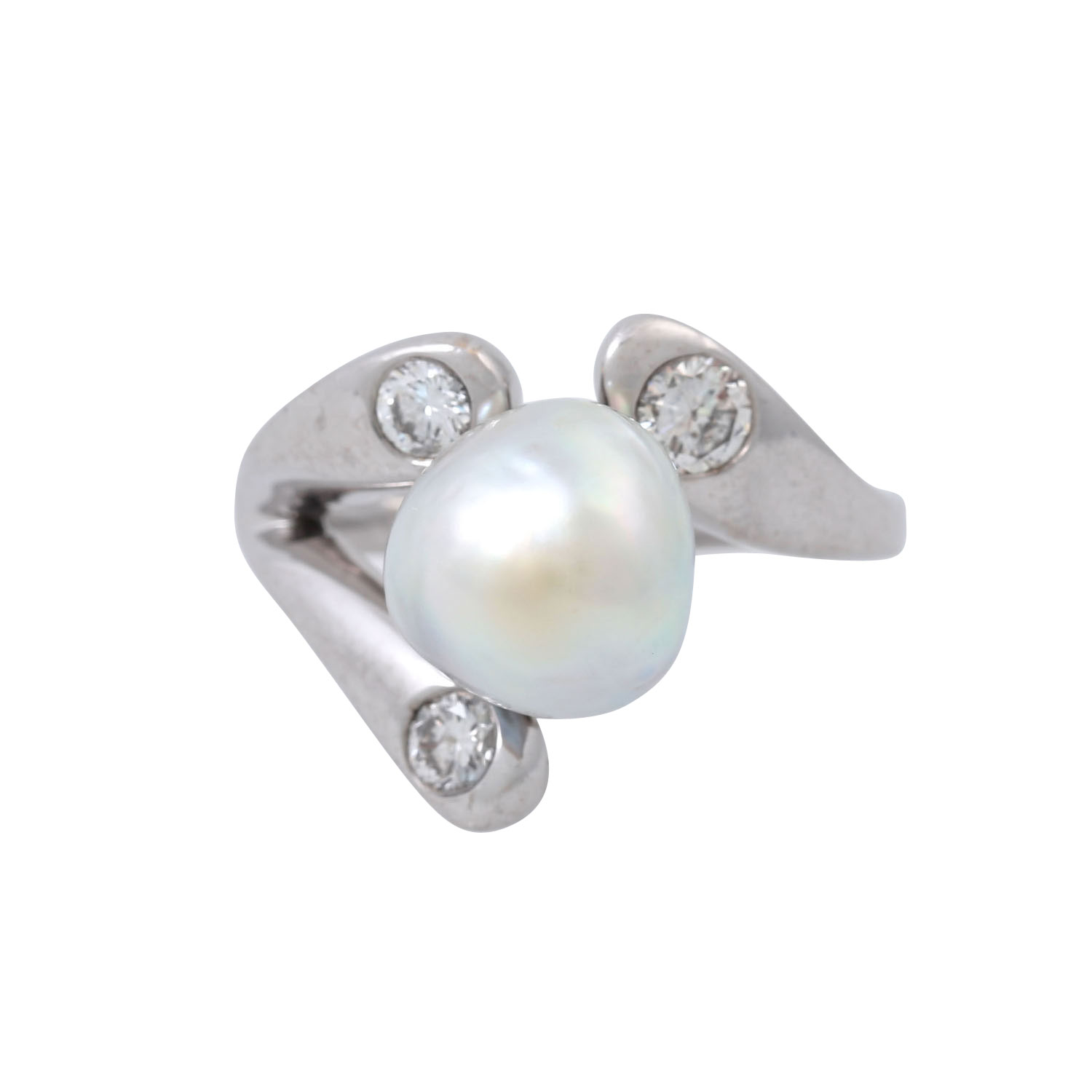 Ring with silver grey cultured pearl ca. 10 mm and 3 brilliant-cut diamonds totalling ca. 0.5 ct, ca. TIW (K-L)/I1, 18K WG, 9.8 gr, ring size 51, 20th/21st century, minor signs of wear.