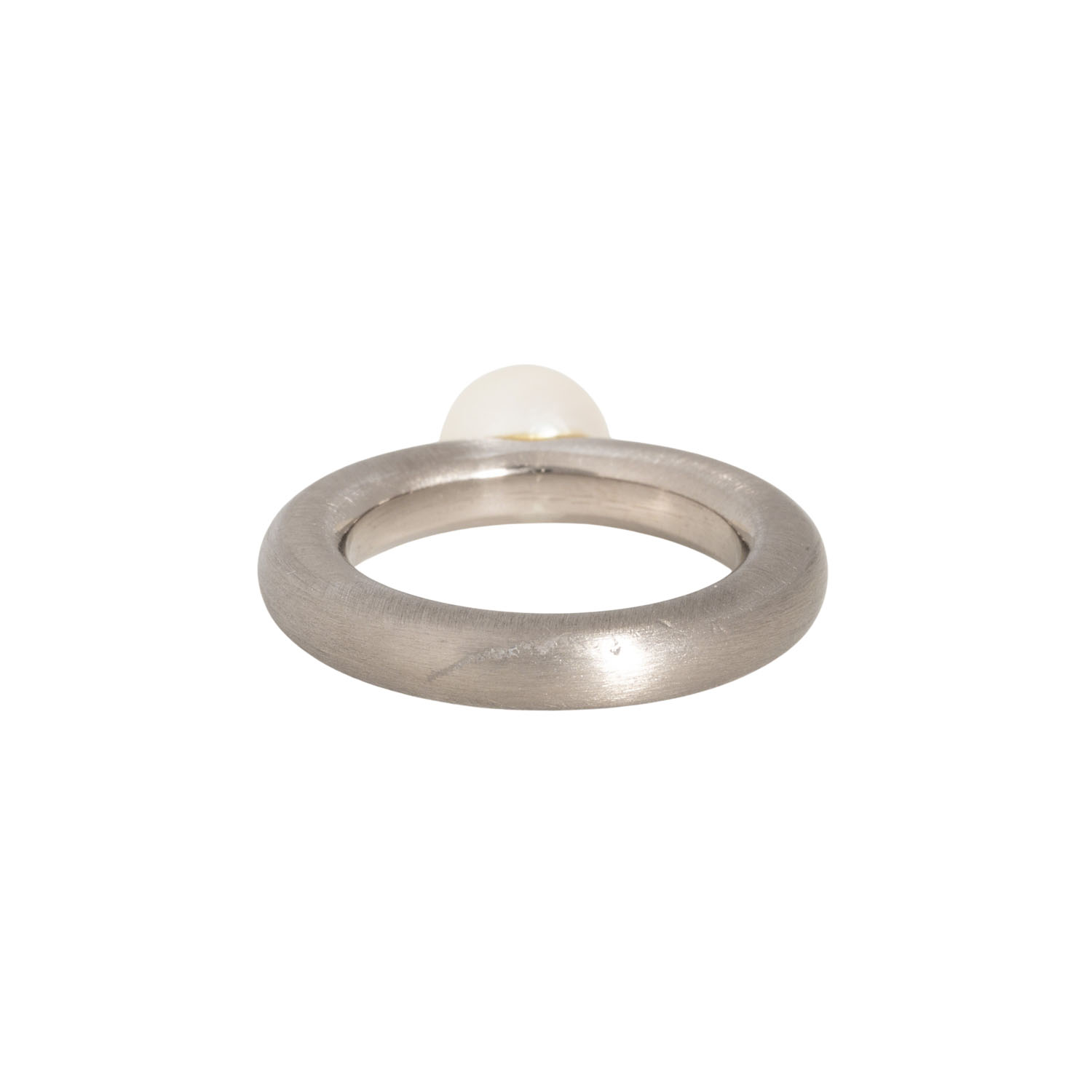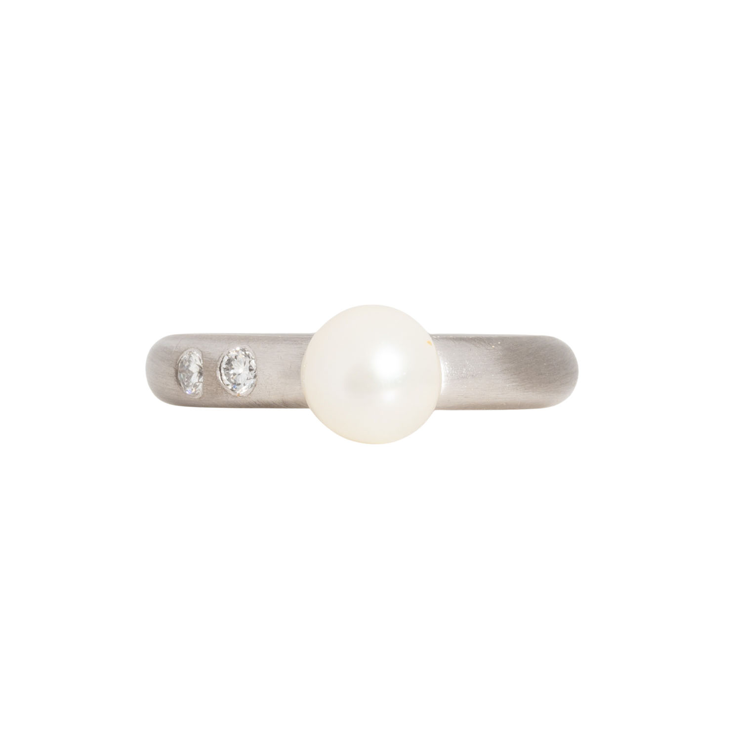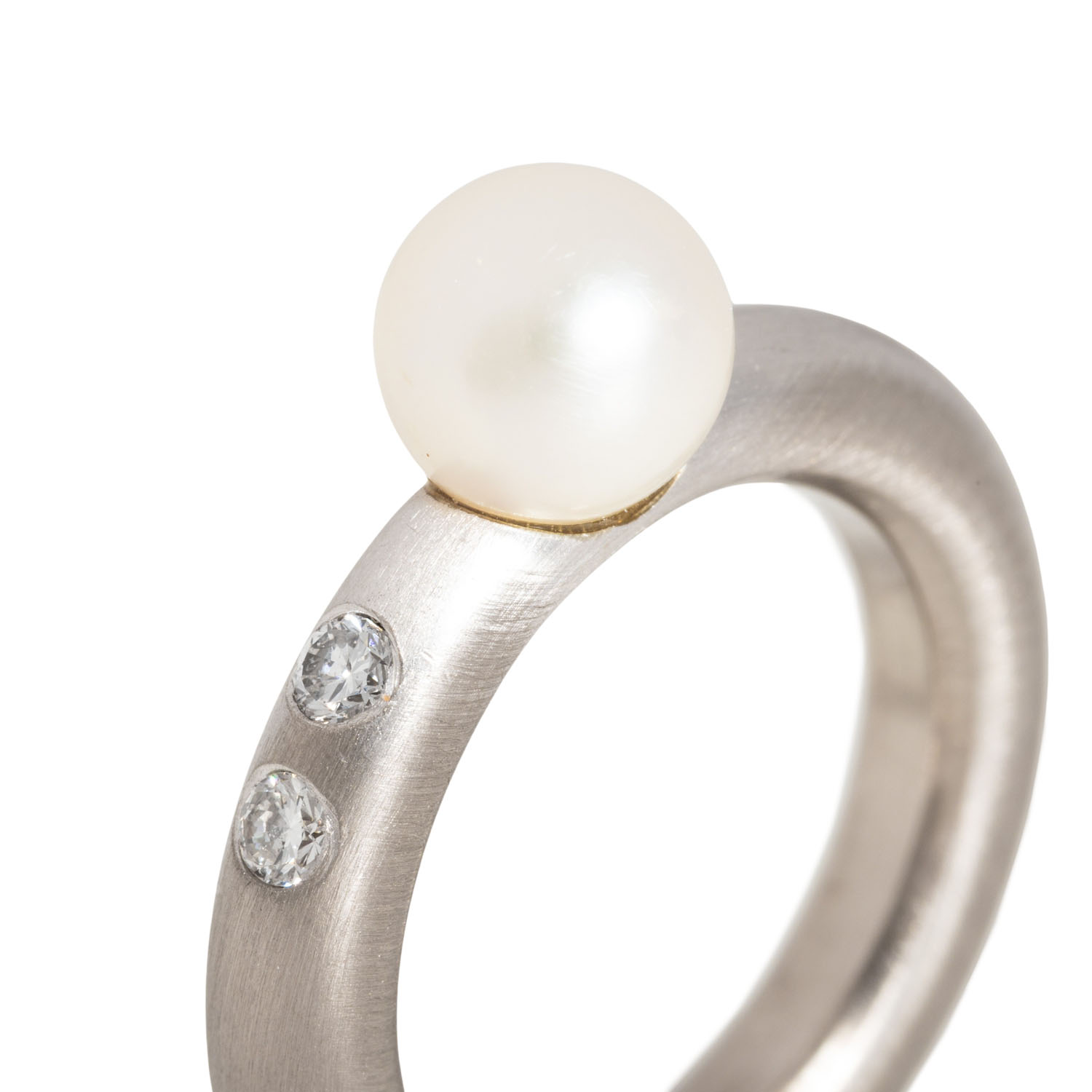Ring set with white akoya cultured pearl, dia.: approx. 7 mm, 2 brilliant-cut diamonds totalling approx. 0.1 ct. good colour and clarity, good colour and medium clarity, 18K WG, 11.9 g, ring size 51, 20th/21st century, minor signs of wear.