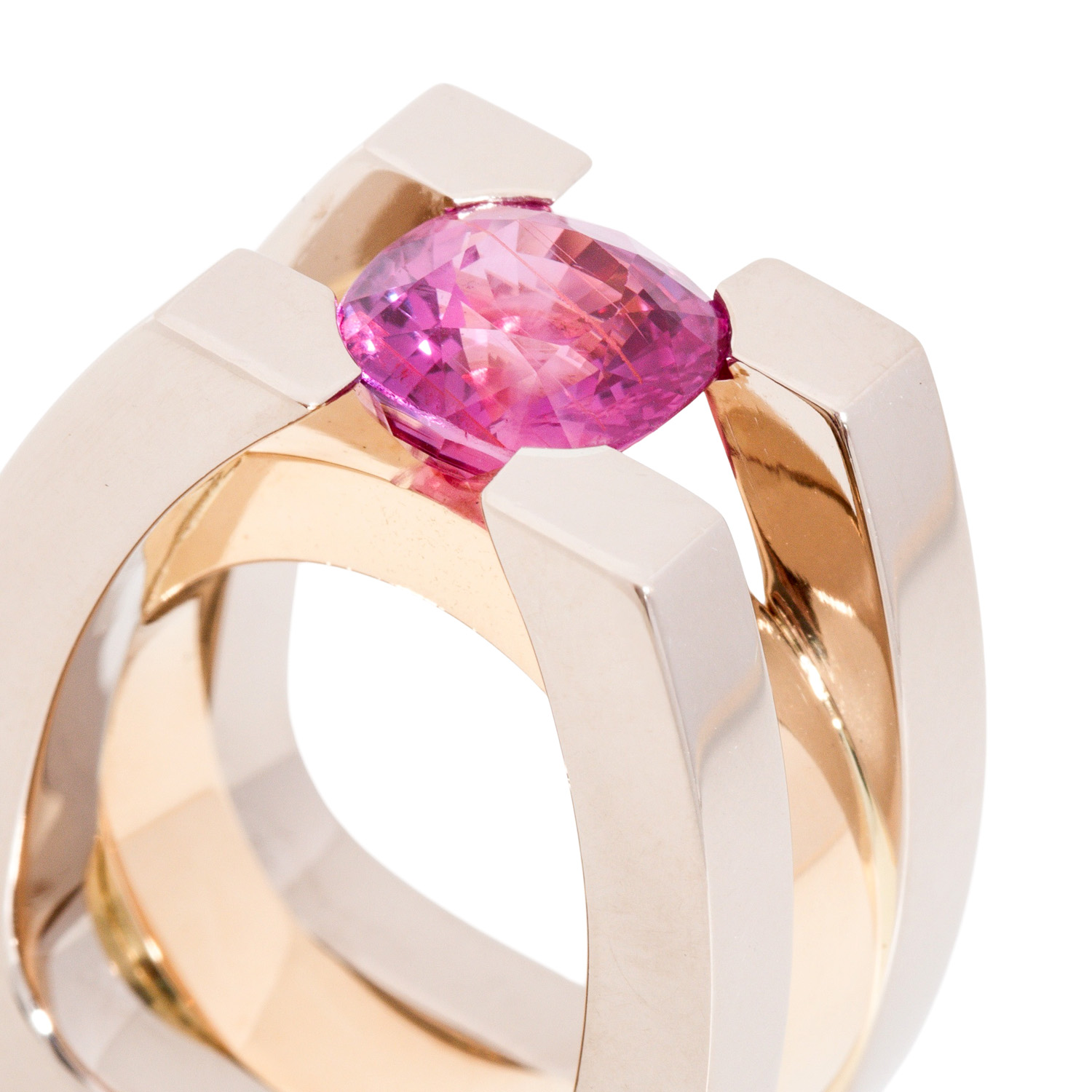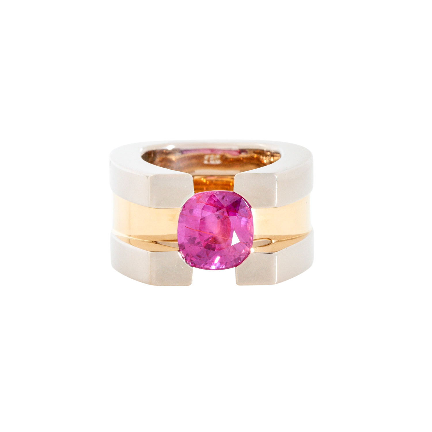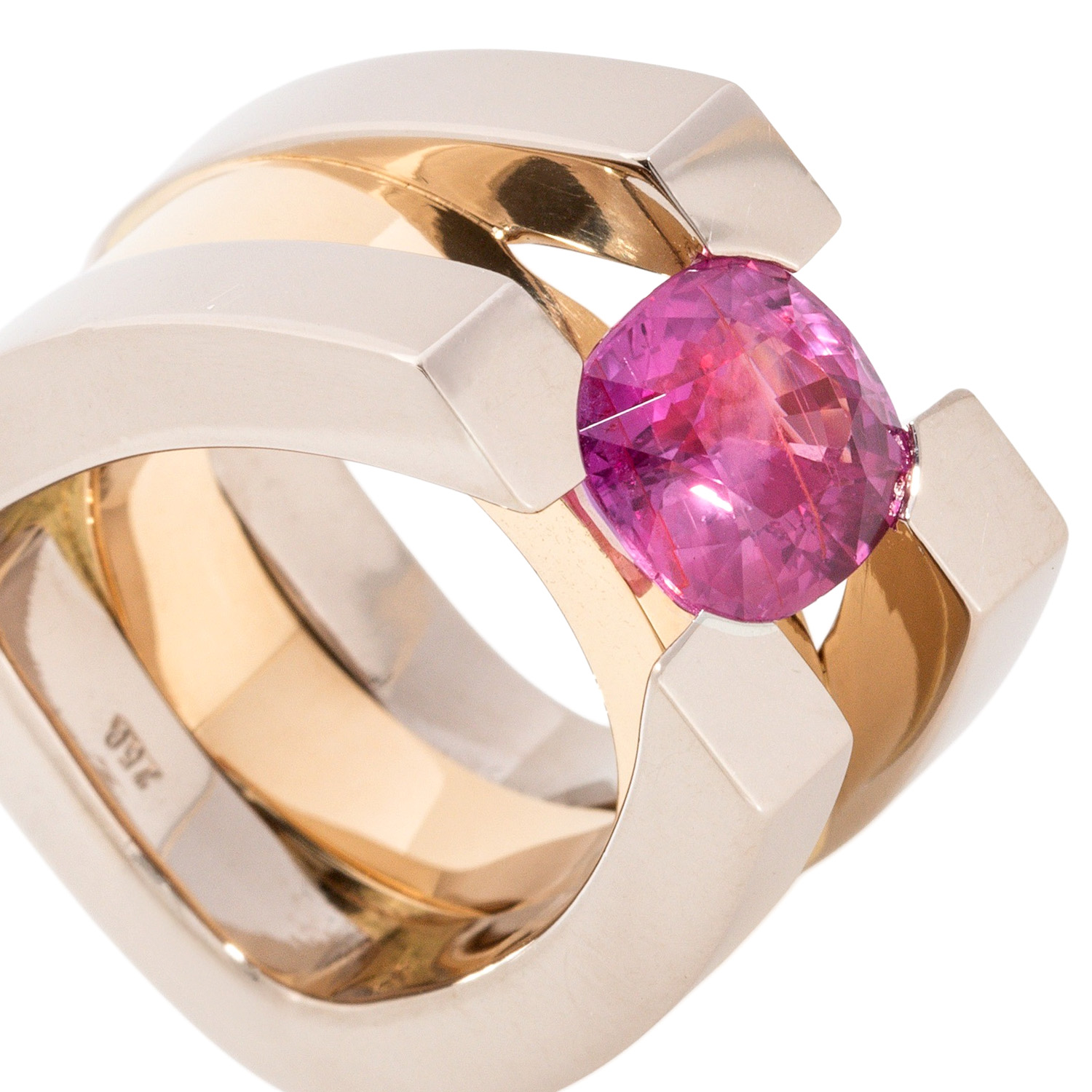Ring with pink sapphire of 4.31 ct, no indication of heating, 18K YG/WG, 50 g, ring size 54, 21st century, minor signs of wear, incl. DSEF gemstone report (2016).