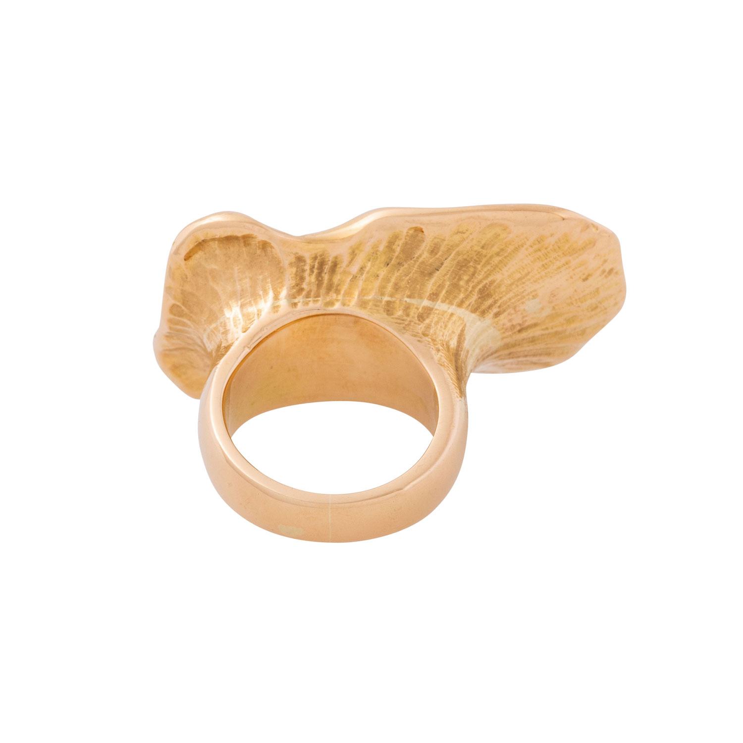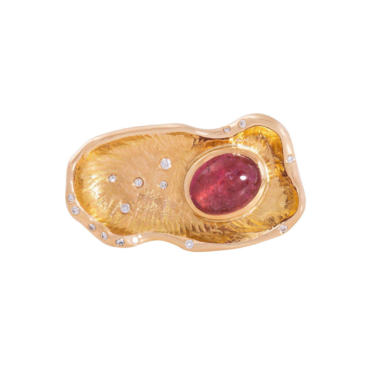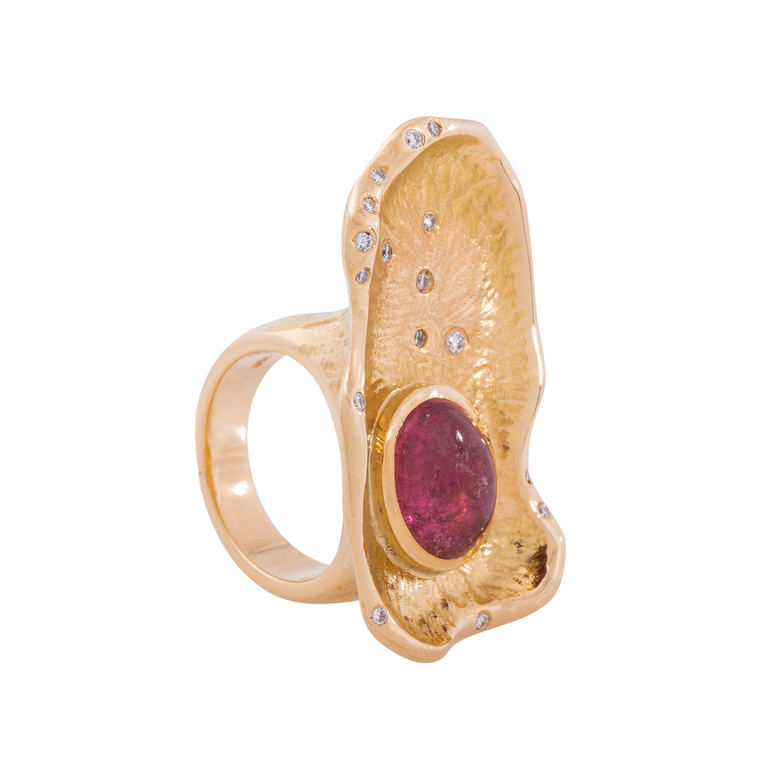 Ring with rose tourmaline cabochon, oval ap. 12 x 9.5 mm, 16 diamonds (single, brilliant cut), totalling ap. 0.17 ct, good colour and clarity, 18K yellow gold 37.2 g, ring size 51, late 20th century, minimal signs of wear, handcrafted, single piece.