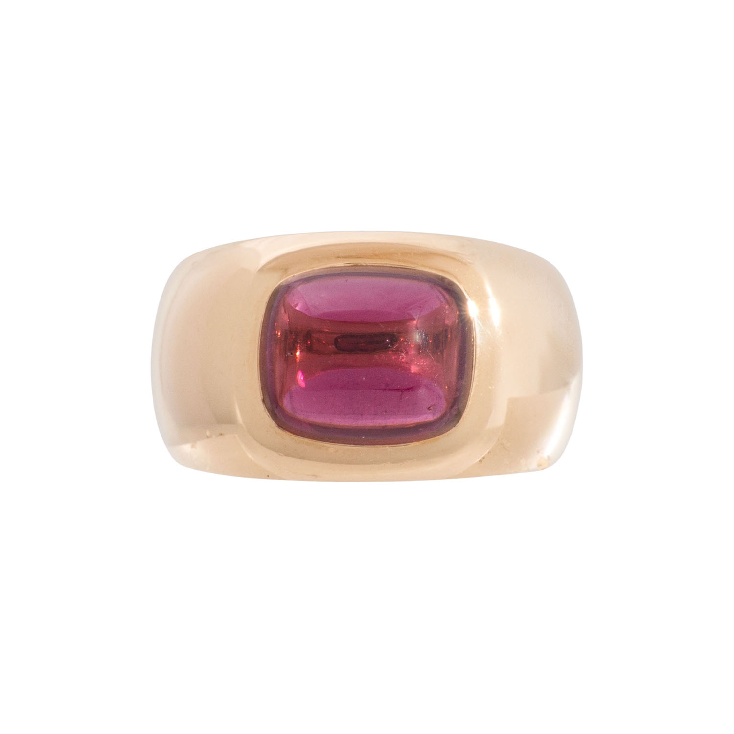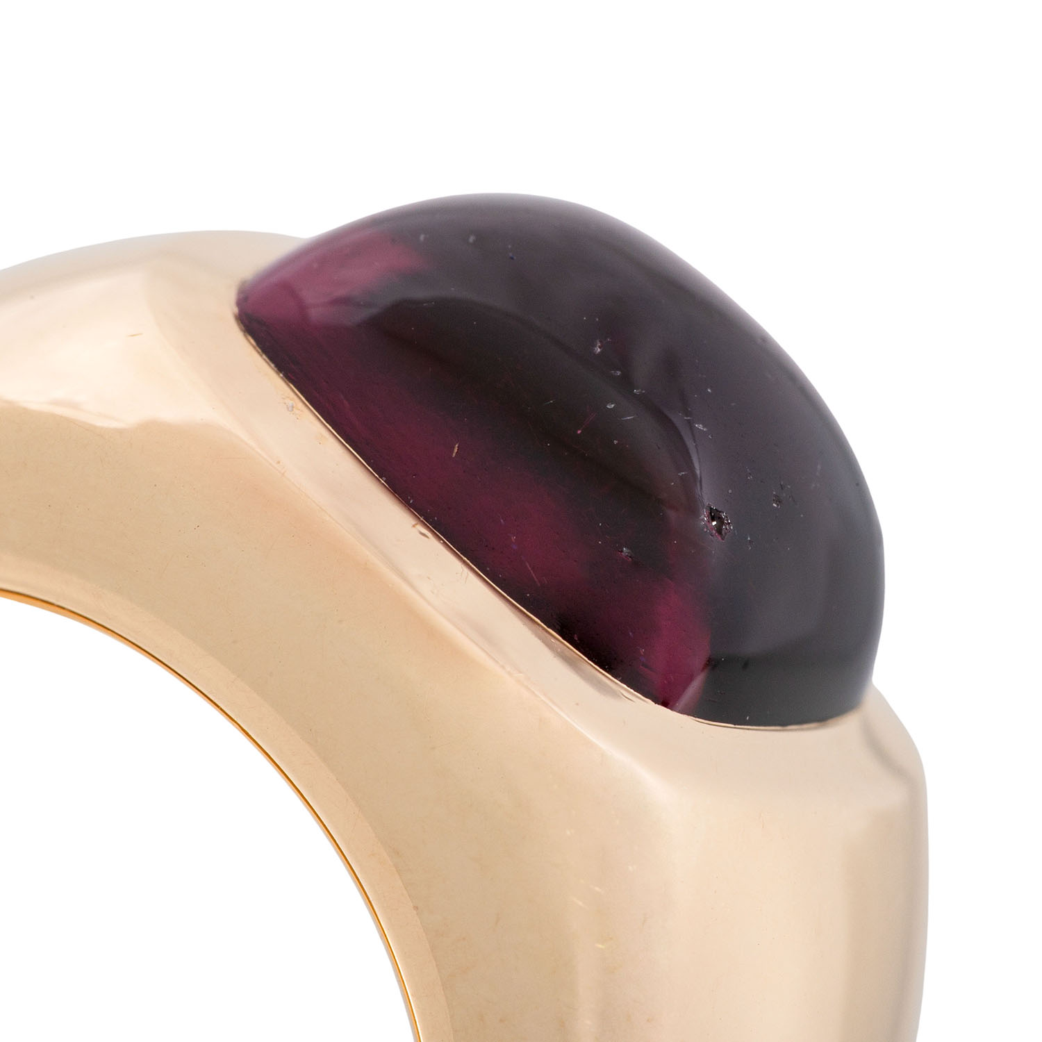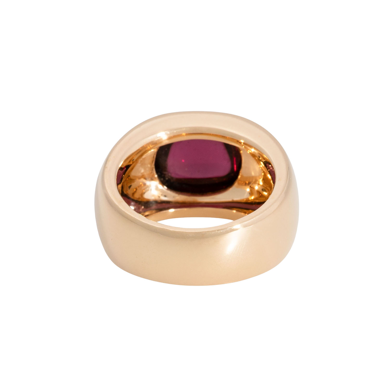 Ring with rhodolite cabochon, ca. 12.6 x 10.4 mm, approx. 9,5 ct, 18K yellow gold, 32.3 g, ring size 59, late 20th century, minimal signs of wear, garnet with small open notch .