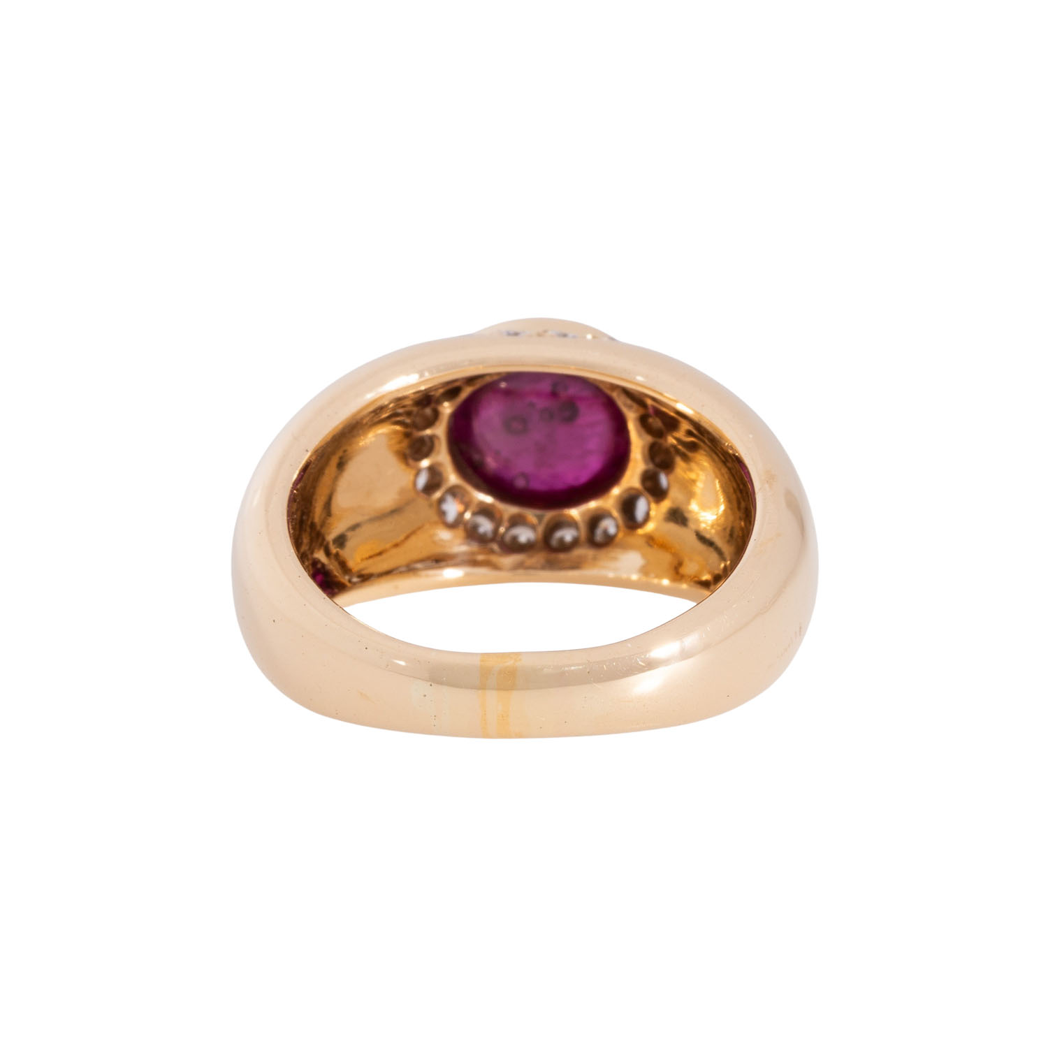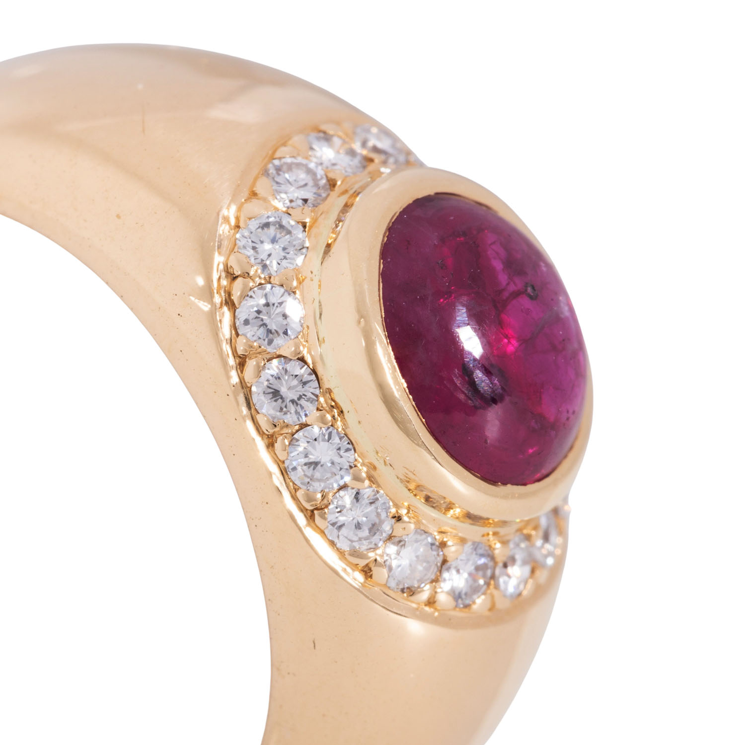Ring with ruby, oval cabochon, ap. 6.7 x 6.5 mm, surrounded by 18 brilliant cut diamonds, totalling ap. 0.36 ct, good colour and clarity, 18K yellow gold, 11.0 g, ring size 51, late 20th century, minor signs of wear.