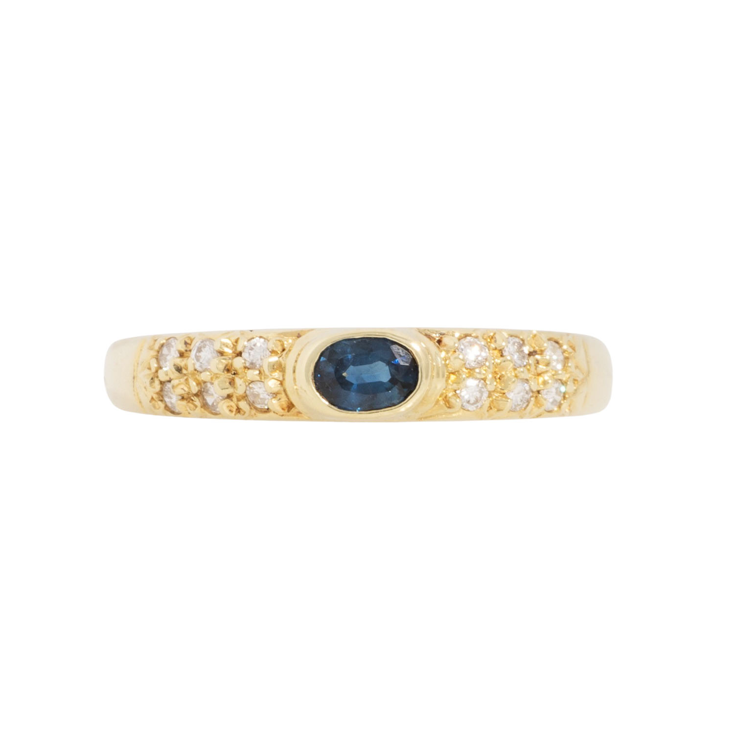 Ring with sapphire and 12 brilliant-cut diamonds, totalling 0.12 ct (graved), STW (I-J)/SI, faceted oval-cut sapphire, approx. 0.25 ct, 14K yellow gold, 2.7 g, ring size: 54, W: approx. 2.1 - 3.8 mm, 21st century, signs of wear, with hallmark 'W'.