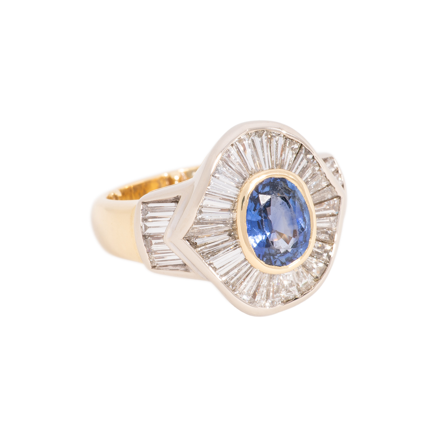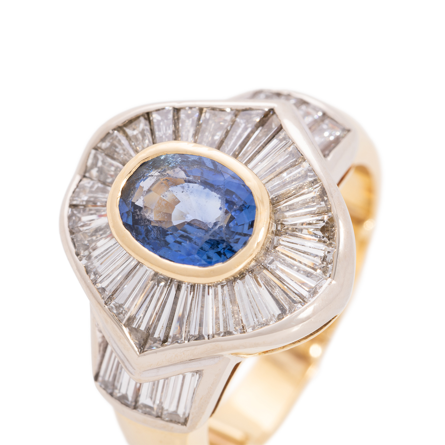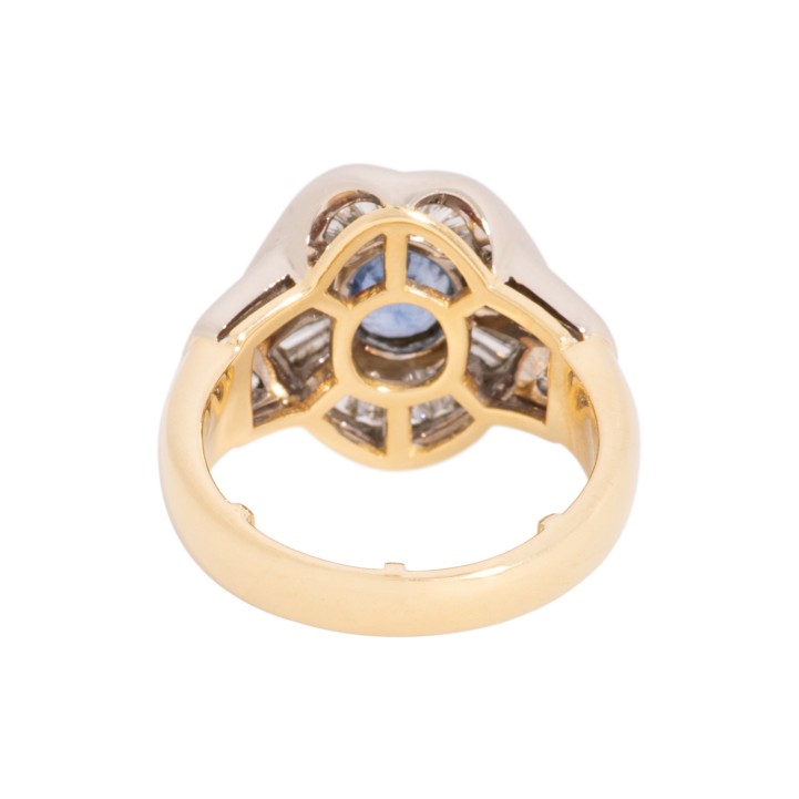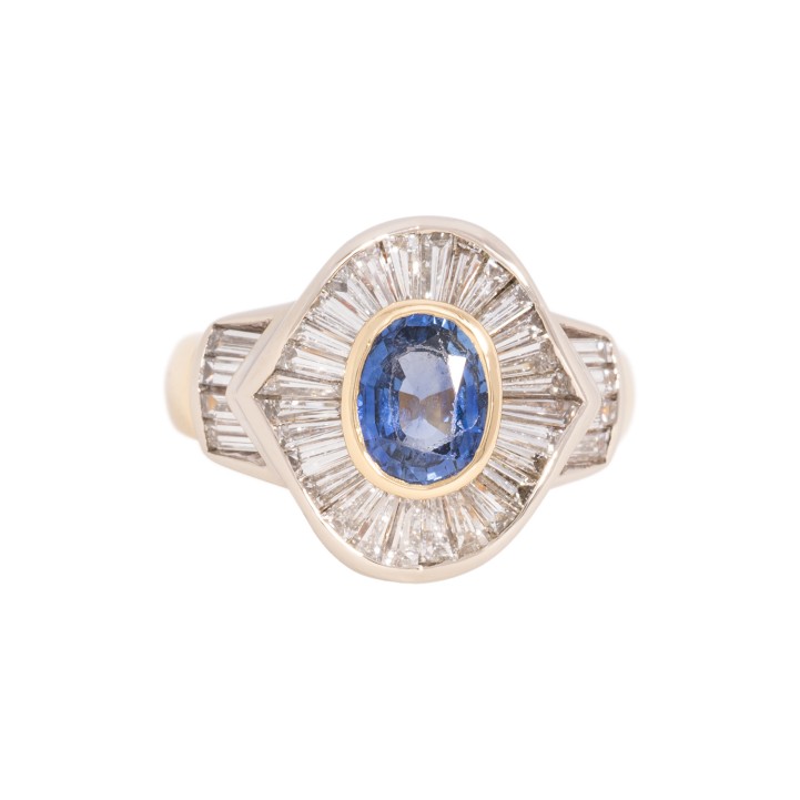 Ring with oval faceted sapphire ca. 1.3 ct, facet edges abraded and trapeze-cut diamonds totalling ca. 1.8 ct, good colour and good to very good clarity, 18K yellow and white gold, 10.2 g, ring size ca. 54 with minimizing wires, late 20th century, signs of wear.