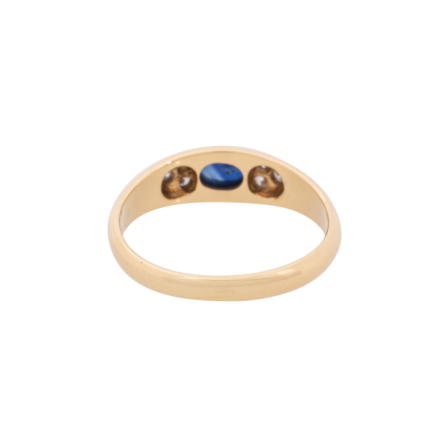 Ring with sapphire cabochon, oval, ap. 5.7 x 3.6 mm, 6 brilliant cut diamonds, totalling ap. 0.12 ct, good colour and clarity, 18K yellow gold, 3.8 g, ring size 57, late 20th century, minor signs of wear.