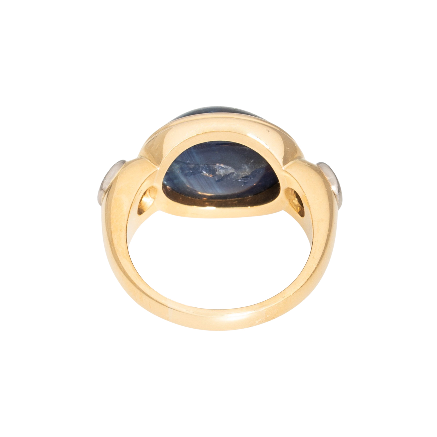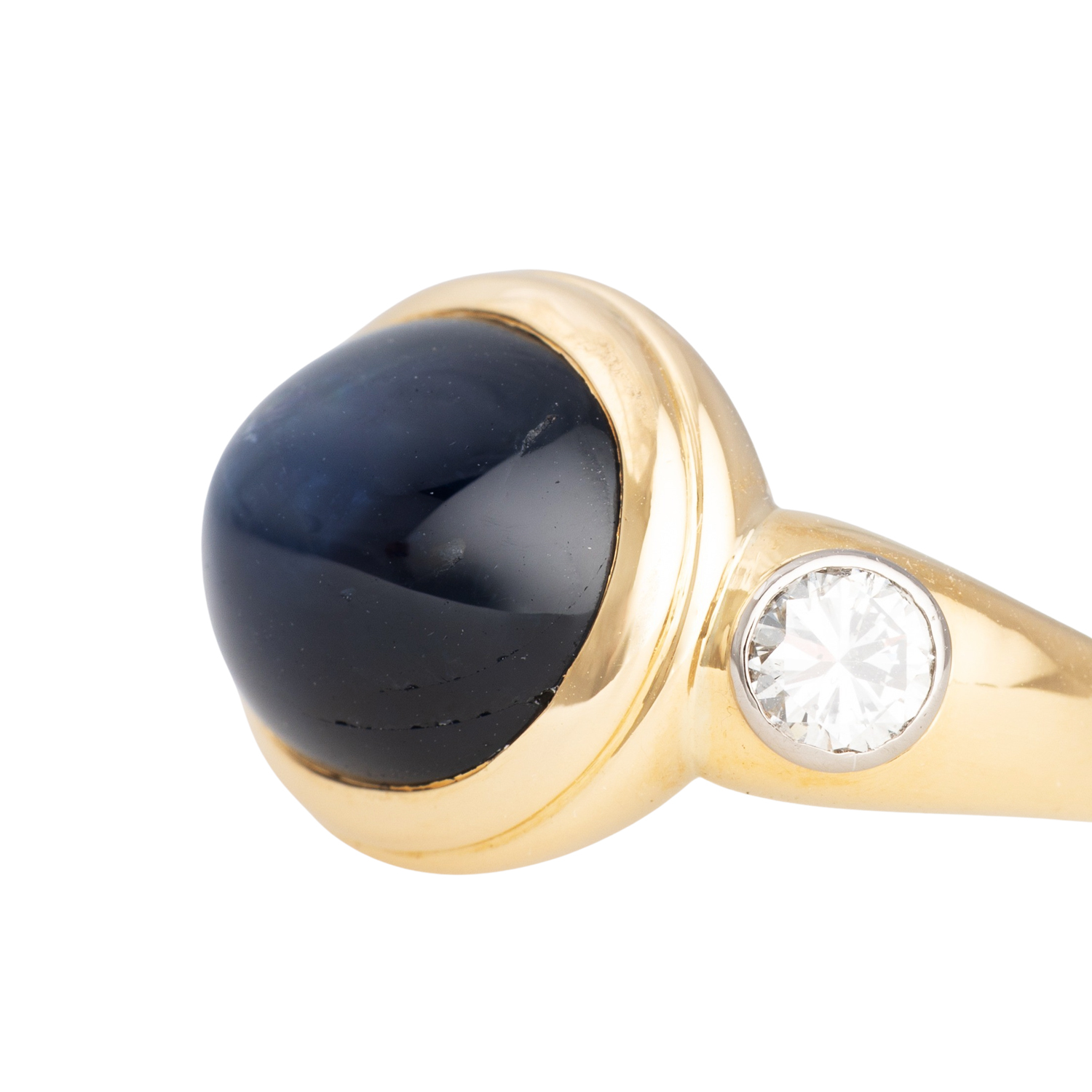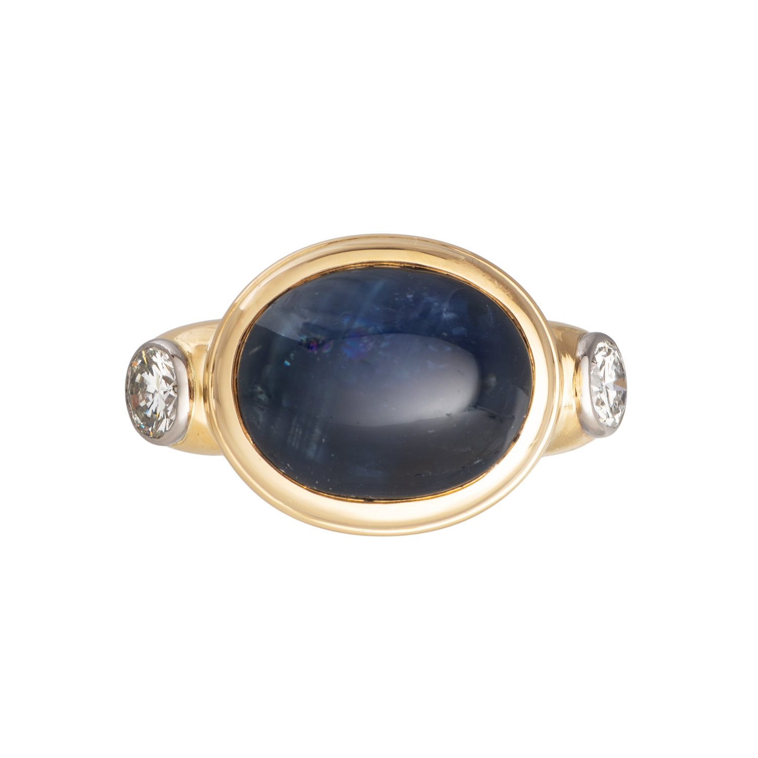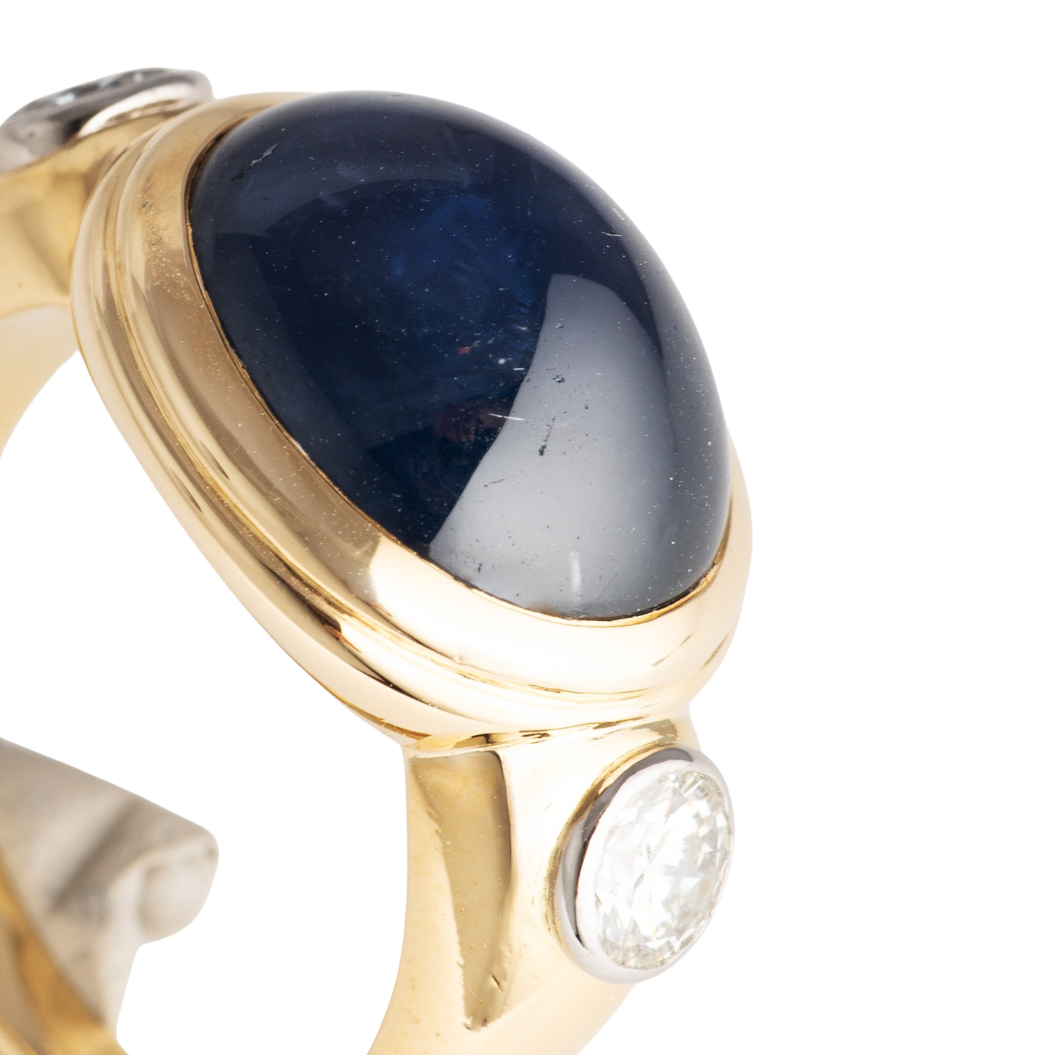 Ring with oval cabochon-cut sapphire ca. 18ct, bottom with natural nicks, flanked by brilliant-cut diamonds ca. 0.5 ct each, ca. STW (I-J)/VS-SI, 18K yellow and white gold, 17.6 g, ring size 63, late 20th century, good condition, solid workmanship.